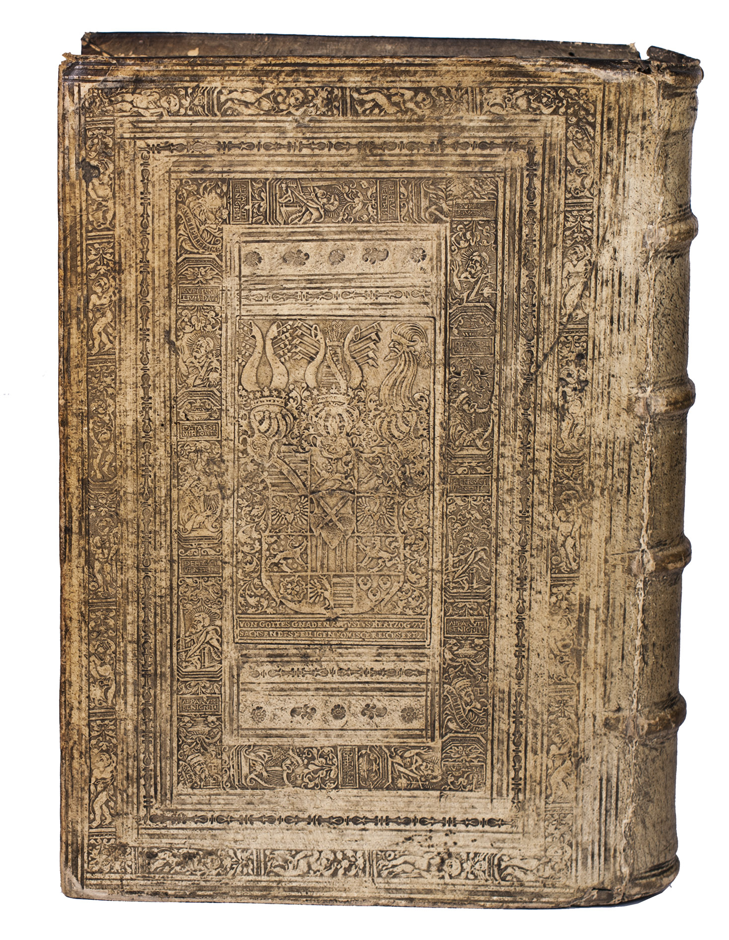 1572. 3 works in 1 volume. 4to. With a woodcut printer's device on the title page of ad 1, several decorated woodcut initials. Contemporary richly blind-tooled panelled pigskin, with the arms of the Holy Roman Empire in the central panel on the front, and the arms of August of Saxony on the back, surrounded by two figurative and one ornamental border, the initials G.F.N. and the date 1573 on the front, signed by bookbinder S. Rab(e). [18], 321, [1] ll.; 102, [2 blank]; [1], [1 blank], 5, [1 blank] pp.