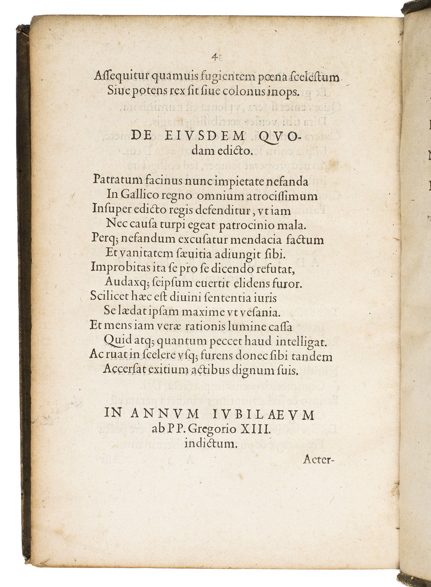 Ad 3: Apparently unrecorded pamphlet containing four Latin elegiac poems to the memory of Gaspard de Coligny, the admiral leader of the Huguenots under Charles IX, and a prominent victim of the St. Bartholomew's Day Massacre. The edition is without name of place or printer; at the end appear the initials A.Q.F. An impressive gathering of texts relating to the Calvinist movement.