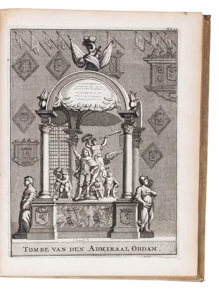 Amsterdam, Jan ten Hoorn, 1711. 3 part in 1 volume. 4to. With 2 engraved frontispieces (by Jan Luyken and Jan van Lamsvelt] and 9 engraved plates (4 folding). Contemporary vellum. [16], 140, [8], 104, [8]; 56 pp.