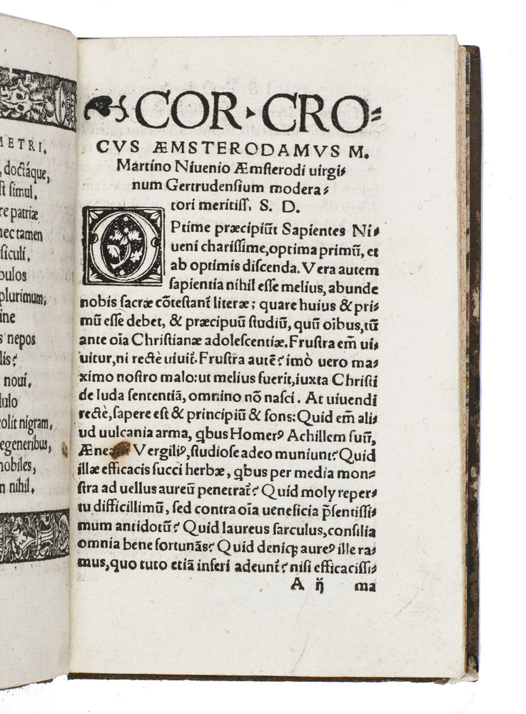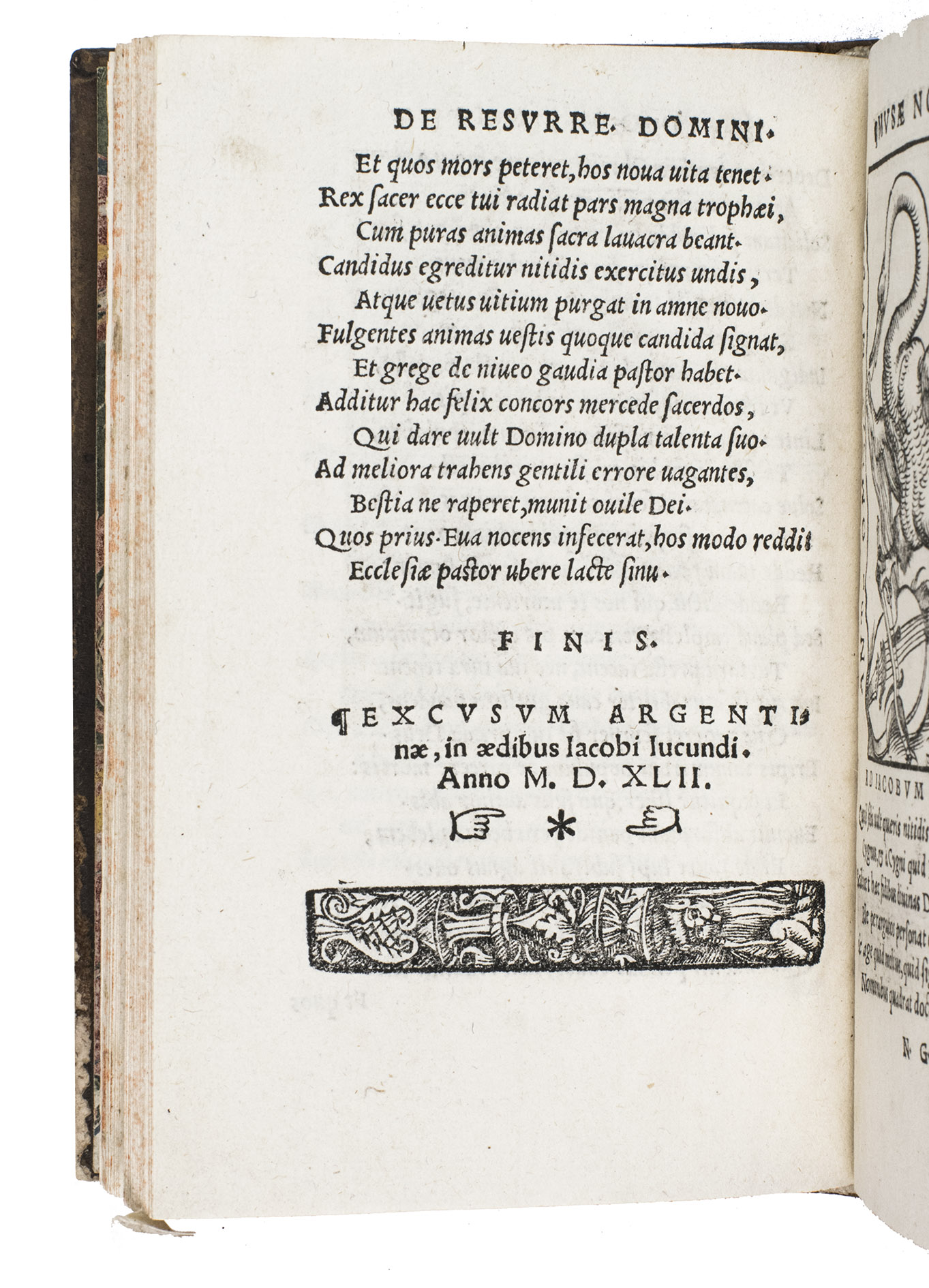 Strasbourg, Jacobi Jucundi [=Jakob Frölich], 1542. 8vo. With a printer's device on the title page and final page, two decorated woodcut initials, a woodcut headpiece, and three woodcut tailpieces. Early 18th-century gold tooled mottled brown calf. [40] ll.