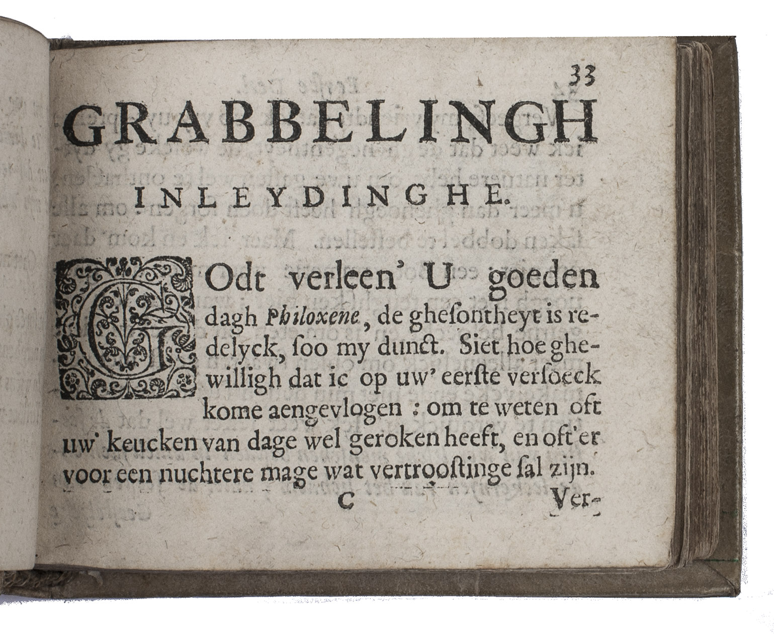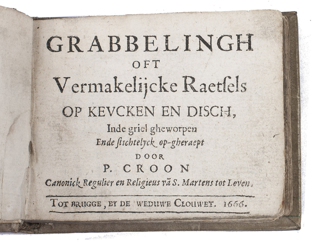 Rare first and only edition of a book with entertaining riddles in prose and verse, for use within the family or at social parties, by the popular author Petrus Croon IV (1634-1682). He states in his preface, that because his earlier published book Moy-al was so graciously received, he presents his readers with another collection of riddles and epigrams, to feed both their lust for pleasure and their lust for learning. All riddles are presented to Philoxenus, a lover of guests, and are told by Conviva, an invited friend. The riddles are given in verse and the answers are afterwards discussed in dialogues, with the solutions hinted at but not bluntly given, because Croon believed it would keep interest when the answer was not fully known. Included at the end is a section containing the solutions to all riddles and emblems of the Moy-al.