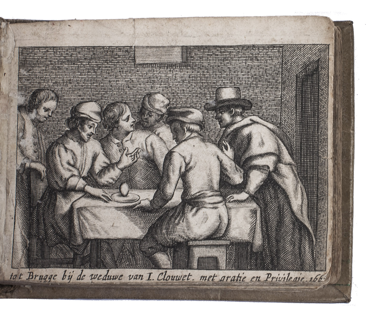 Bruges, widow of Johannes Clouwet, 1666. Oblong 16mo (7 x 9.5 cm). With an engraved frontispiece. Contemporary sheepskin parchment. 315, [4], [1 blank] pp.