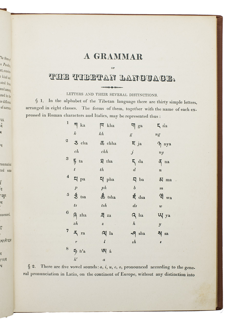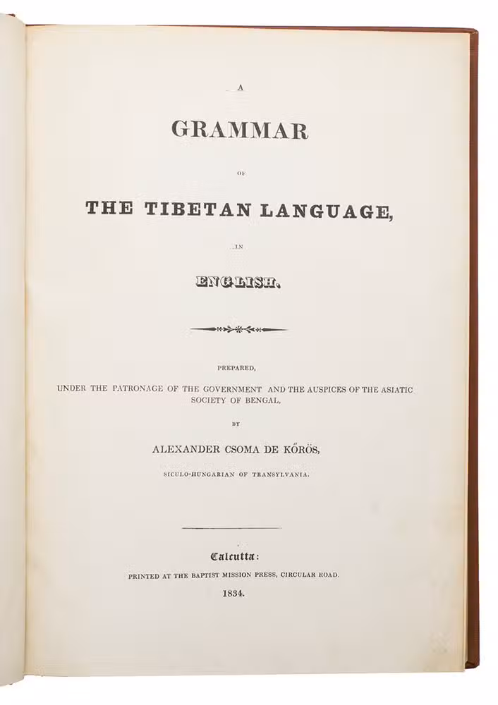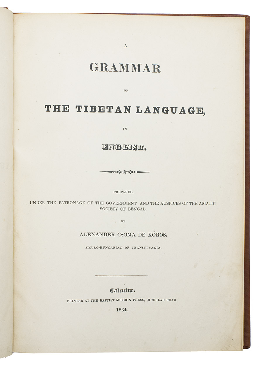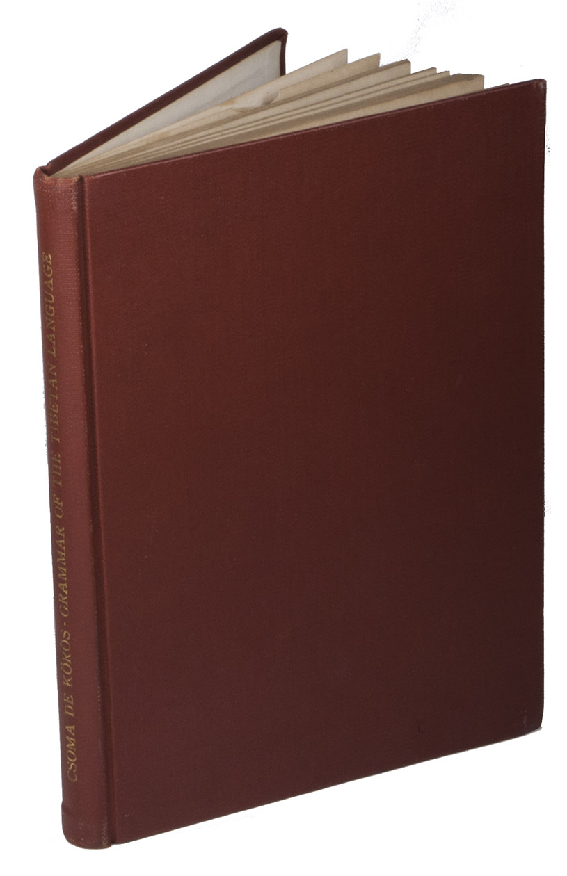 Rare first edition of the first Tibetan-English grammar book, written by the Hungarian philologist, orientalist and linguist Alexander Csoma de Kõrös (1784-1842). Csoma de Kõrös studied oriental languages in Göttingen from 1816 to 1818, where he was known for the fact that he mastered at least 13 languages. Afterwards he travelled to the East, to Lahore. He met the famous English explorer William Moorcroft (1767-1825), who was employed by the East India Company, who asked him to learn the Tibetan language, and by his various travels through the Middle East, Central Asia and India, he became one of the first Europeans to master the Tibetan language. He owed much of his success to several local lamas who tutored him and to the fact that he could immerse himself in a study of not only the Tibetan language, but also of the core of the Indo-Tibetan Buddhist literature.