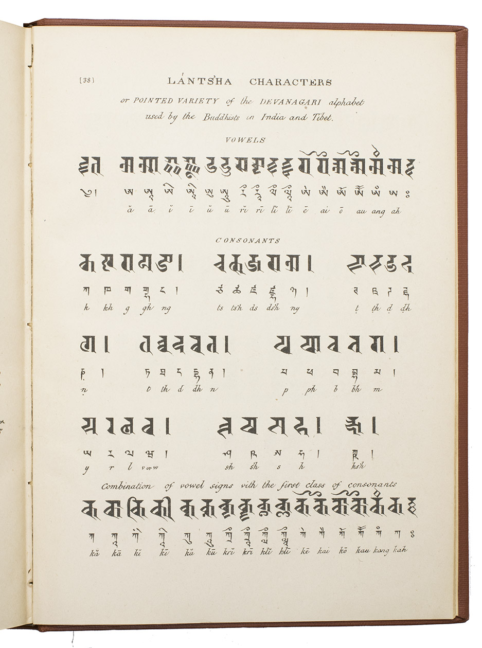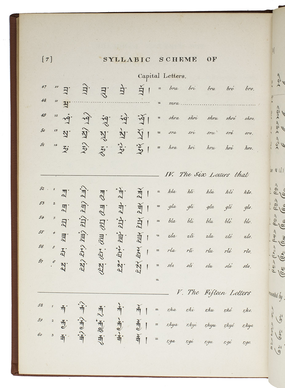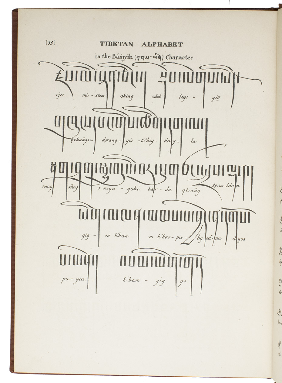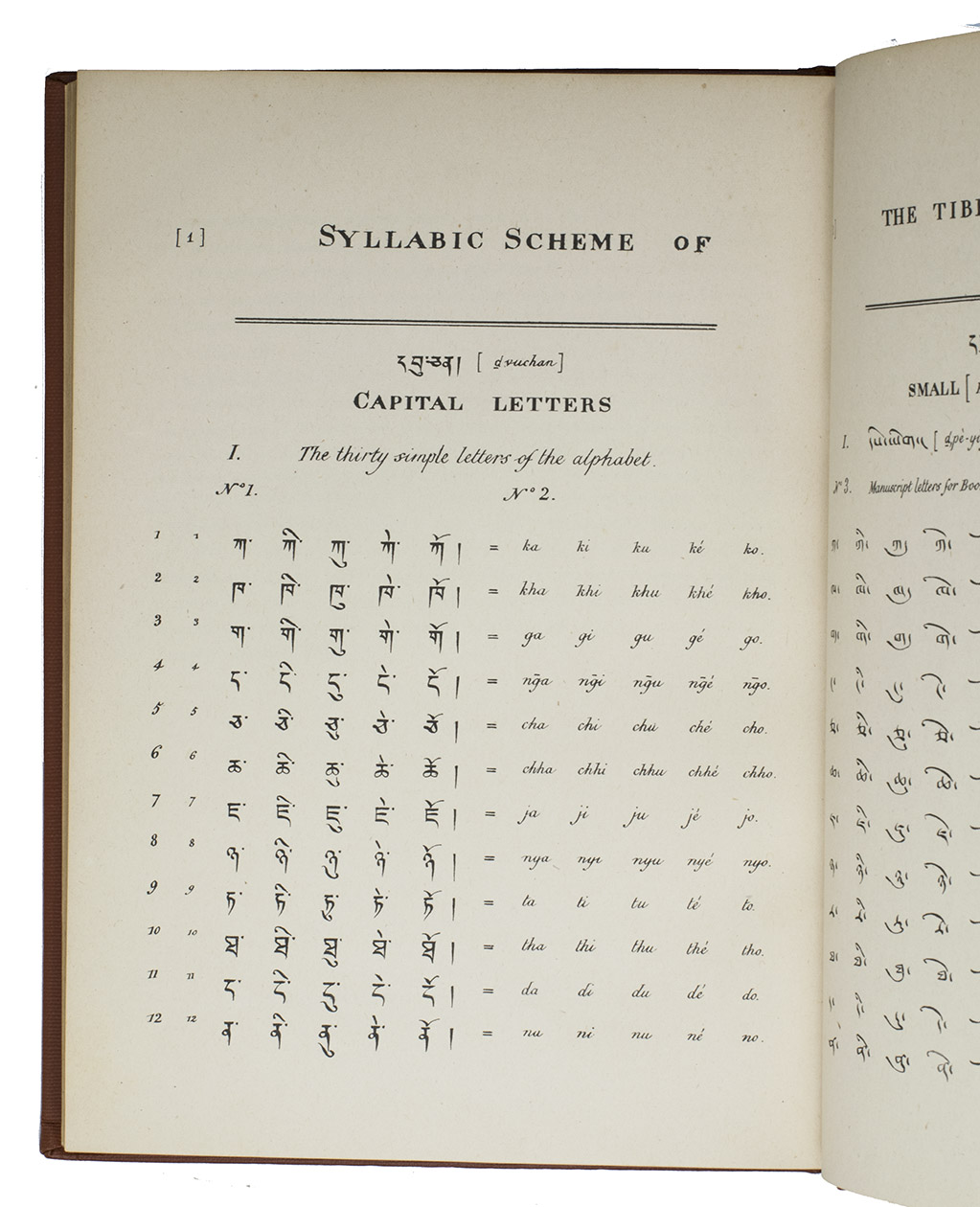 Calcutta, the Baptist Mission Press, 1834. Small folio (27 x 20 cm). Printed in Tibetan and English, complete with a 40-page syllabic schema of the Tibetan language and the Tibetan alphabet in Bámyik, Bruts'ha and Lánts'ha characters. 20th-century red cloth, title in gold on spine. XII, 204, [1 blank], 40, [1 blank] pp.