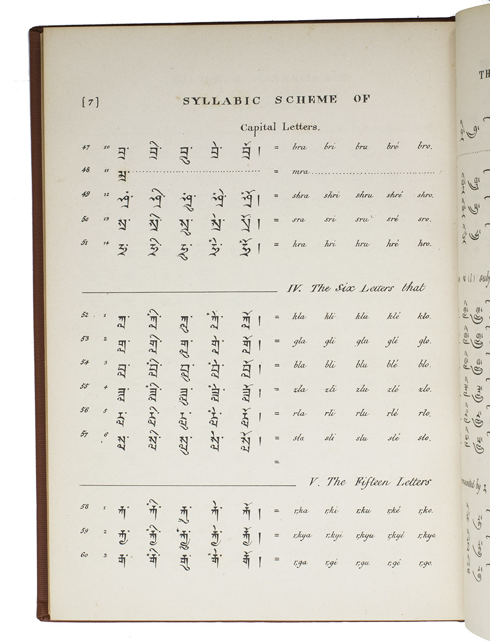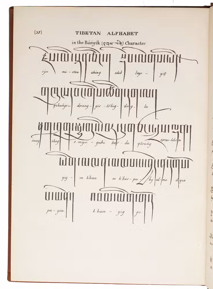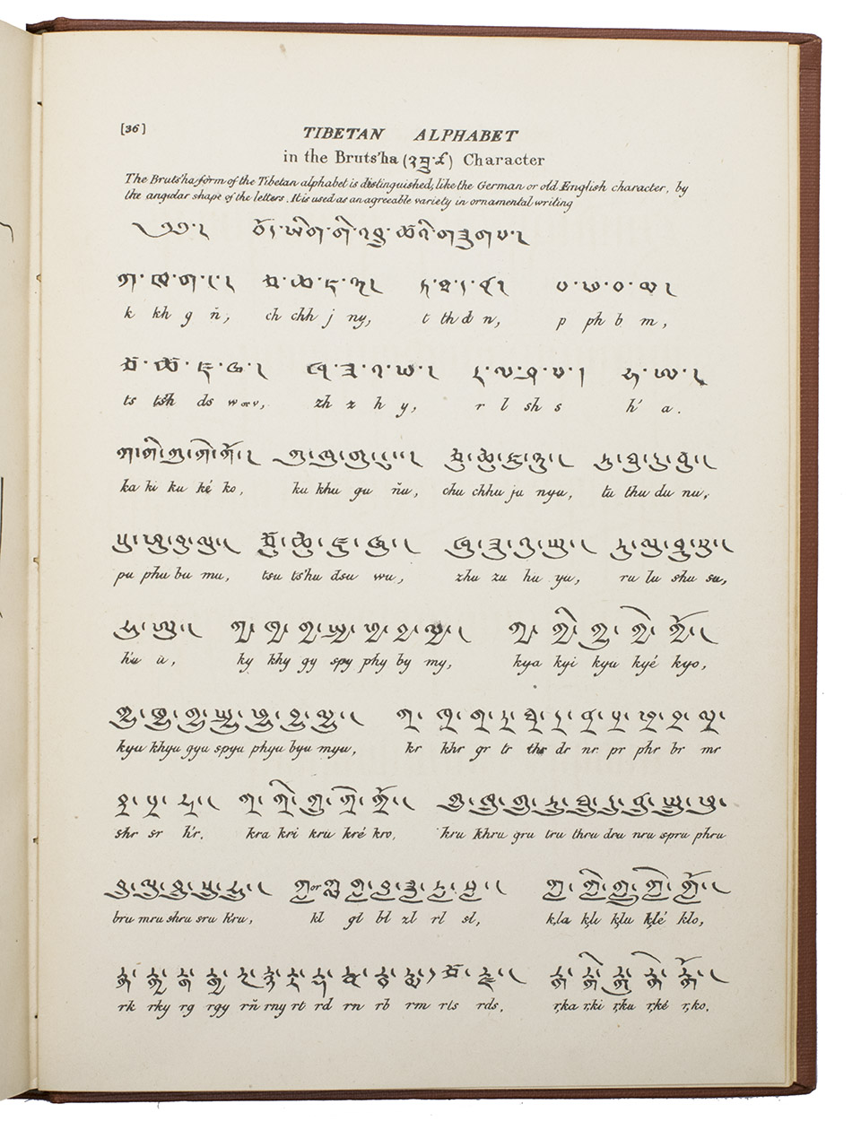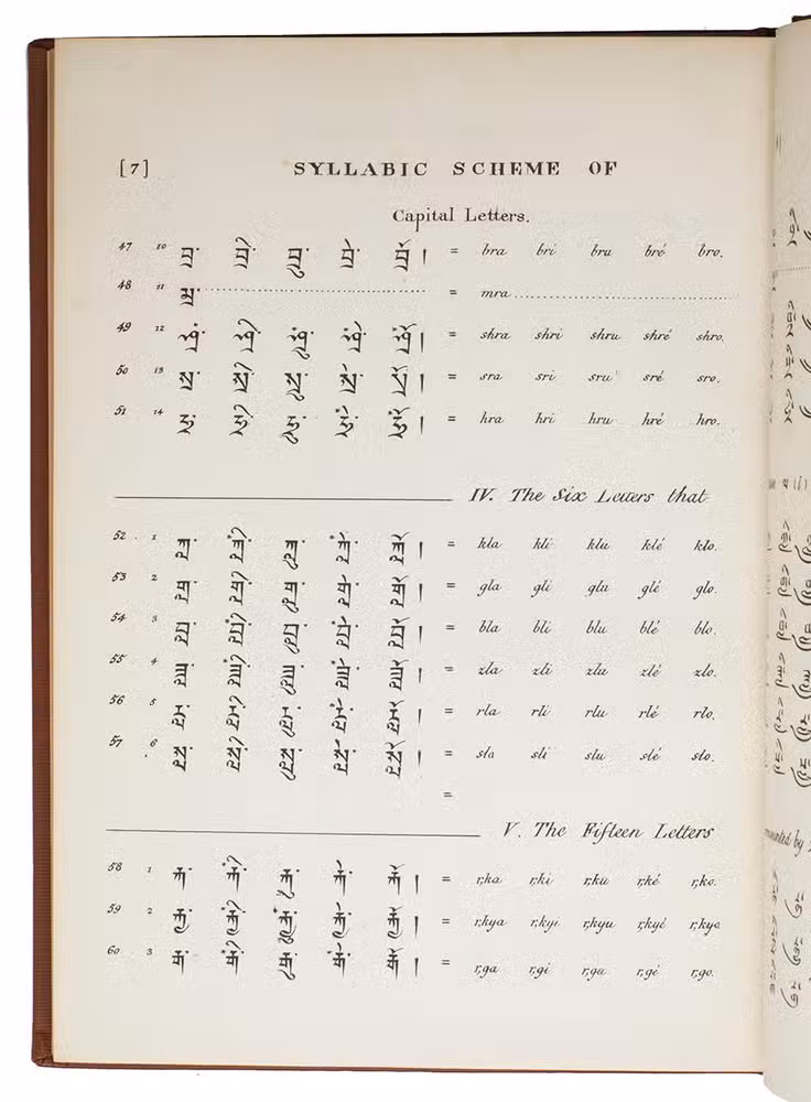 Calcutta, the Baptist Mission Press, 1834. Small folio (27 x 20 cm). Printed in Tibetan and English, complete with a 40-page syllabic schema of the Tibetan language and the Tibetan alphabet in Bámyik, Bruts'ha and Lánts'ha characters. 20th-century red cloth, title in gold on spine. XII, 204, [1 blank], 40, [1 blank] pp.