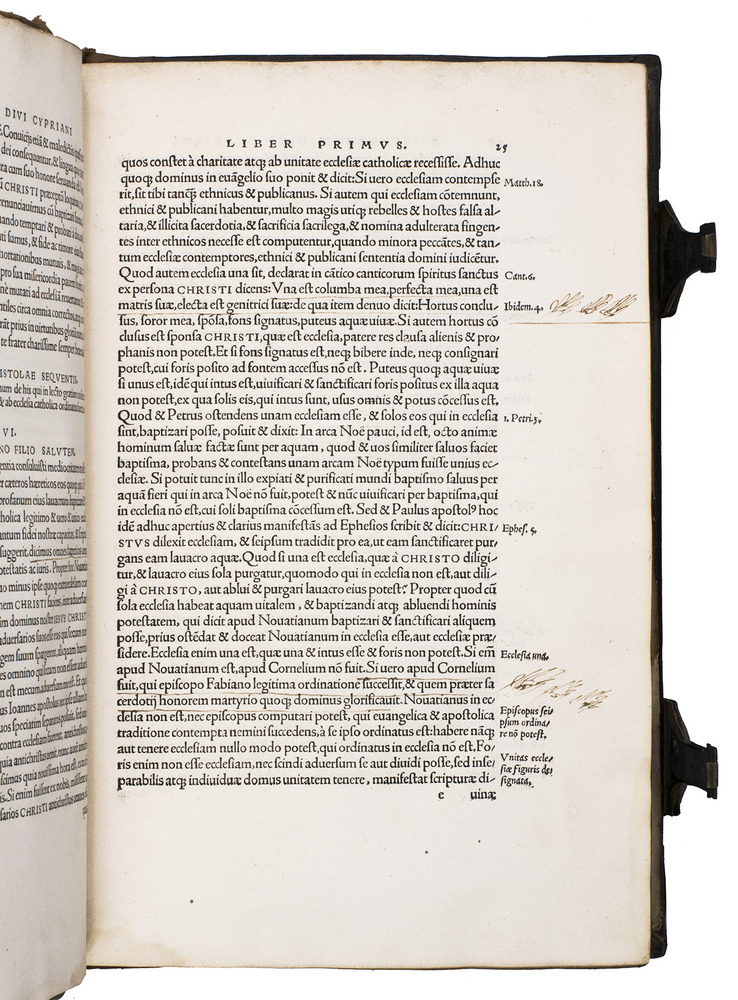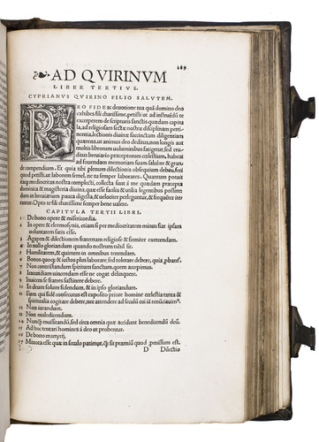 First edition of the works of Thascius Caecilius Cyprianus (Saint Cyprian, ca. 210-258 CE), edited by Erasmus. The present work is a landmark in the history of humanist scholarship and a cornerstone of Erasmuss lifelong effort to restore the authentic voice of the Early Church Fathers. Working in Basel, Erasmus devoted himself to what he regarded as his highest calling: presenting these foundational Christian sources to a wider audience and revealing the truth of the Gospel in its original simplicity.