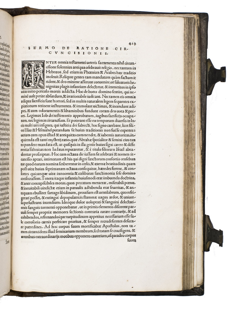 Basel, Johann Froben, 1520. Folio. With an elaborate woodcut border on the title page and on the first page of the dedication. Further with a small woodcut illustration incorporating Frobens device on the verso of the last leaf, numerous woodcut decorated initials by Ambrosius Holbein throughout, and some ornamental woodcut headpieces. Contemporary richly blind-tooled calf over wooden boards, with brass clasps, catch- and anchor plates along the fore-edge and brass edge guards around the corners and on the bottom board edge near the spine, manuscript waste pastedowns, re-backed. [24], 515, [1 blank], [32] pp.