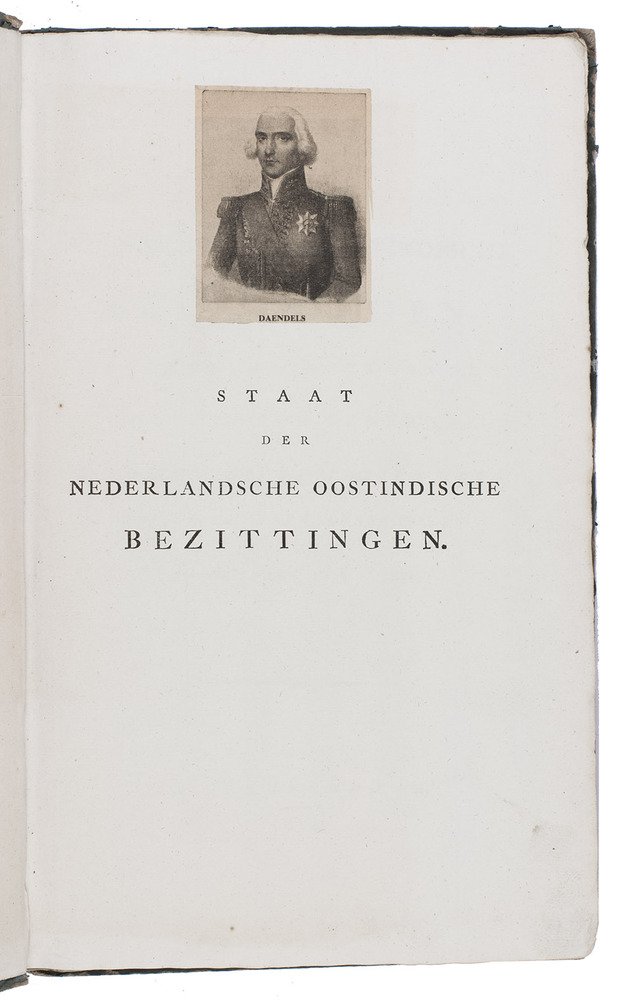 The Hague, (colophon: Hendrik van Teeckelenburgh and the Van Cleef brothers), 1814. 4 volumes. Folio. With a small portrait of Daendels mounted on the half-title of the first volume. Contemporary boards. [6], 128, [1 blank]; [334]; [596]; [488] pp.