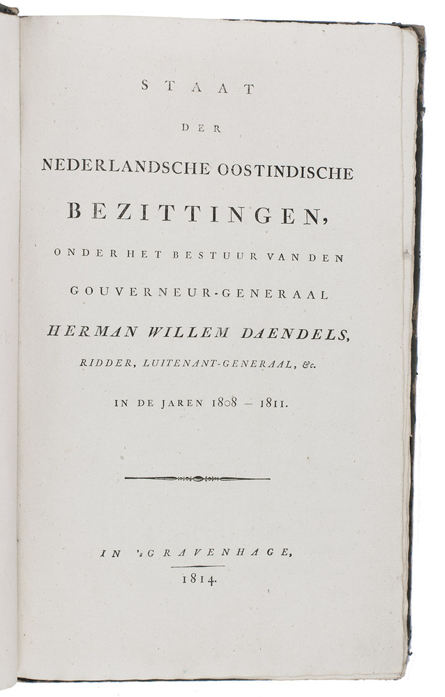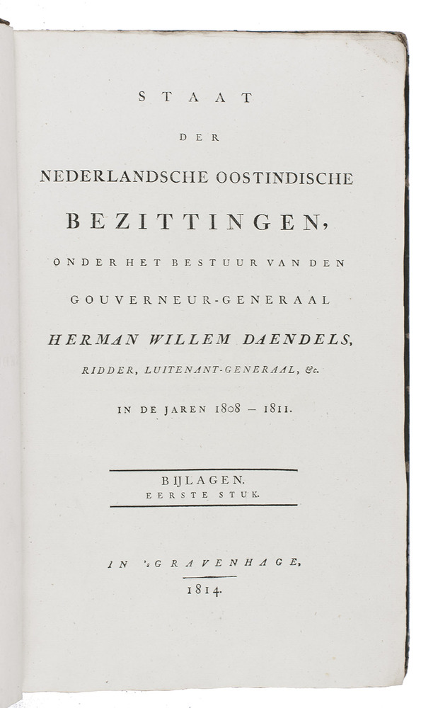 First and only edition of the account of Herman Willem Daendels's rule of the Dutch East Indies from 1807 to 1811. The first volume is a summary of the four years in which Daendels was governor-general at Batavia, describing the Dutch possessions in the East Indies, its government, finances, administration, commerce, and especially military organization, aimed to defend the islands against the English. The other three volumes contain documents, extracts from registers, letters and other material supporting the statements in the first volume. The second volume deals with documents concerning Java's agriculture, including coffee plantations and the wood industry. The third volume contains documents dealing with the Dutch rule in Bantam, Cheribon (Cirebon), Batavia (Jakarta) and the Moluccas, and financial and administrative matters; the fourth and last volume contains documents on military matters, health care and hospitals.