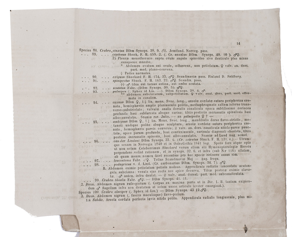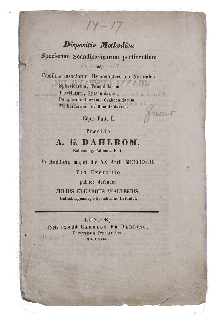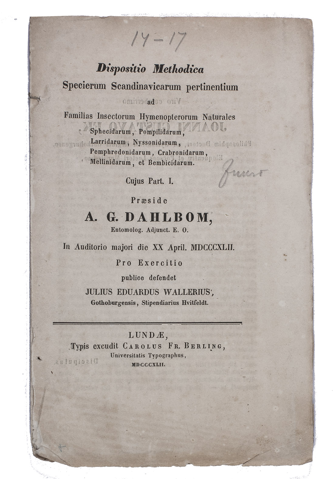 Four rare dissertations on entomology, all with the Swedish entomologist Anders Gustav Dahlbom (1806-1859) as praeses. The dissertations were by Julius Eduardus Wallerius, Johannes Elaus Lundquist, Georg Erlan Psilander, and Laurent Arvid Bergh. The dissertations are printed op folded pages, listing and describing various insect species according to family and genus.