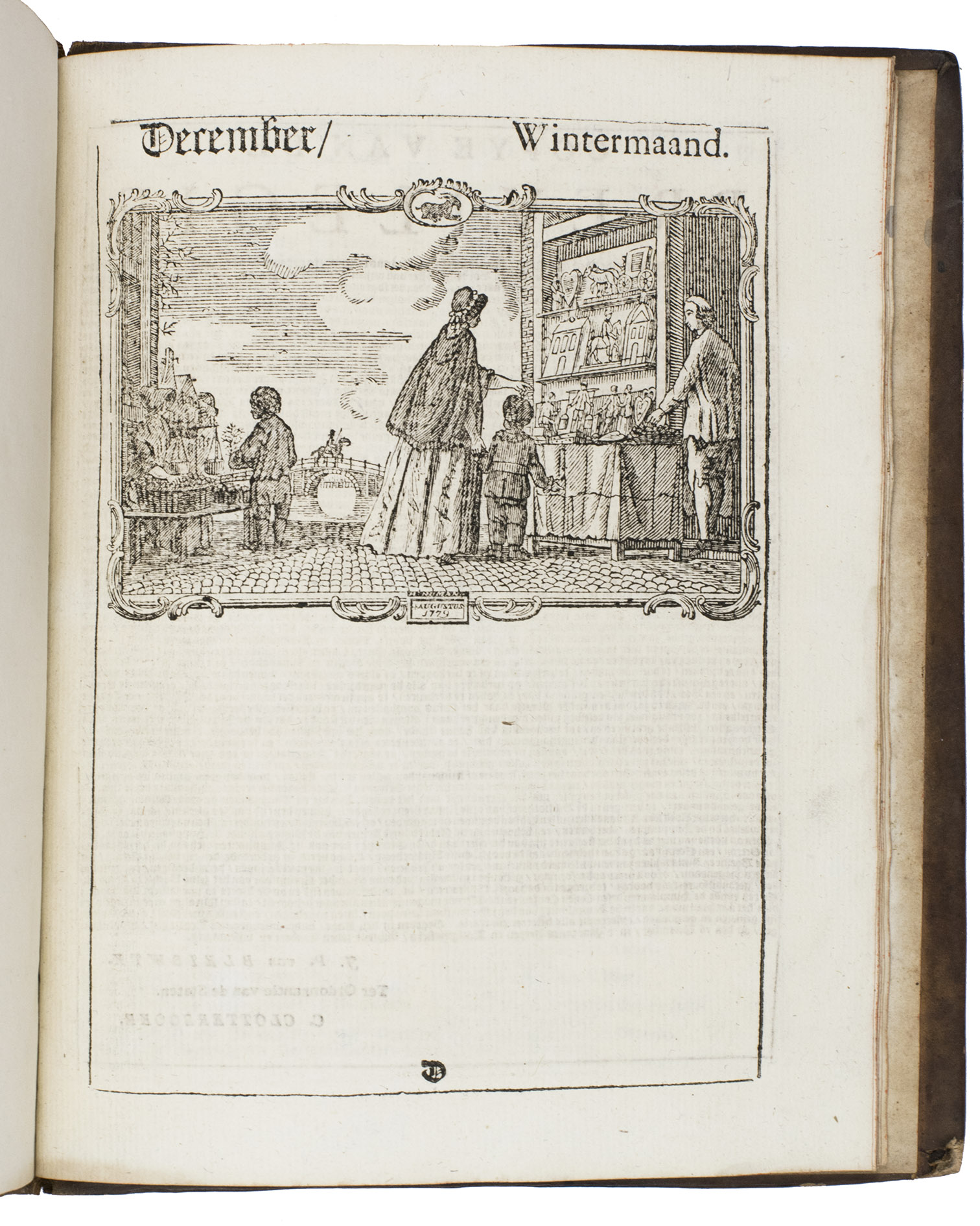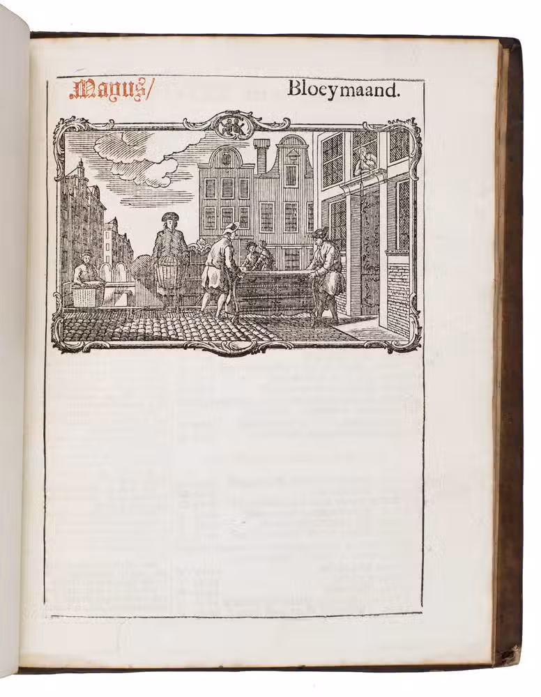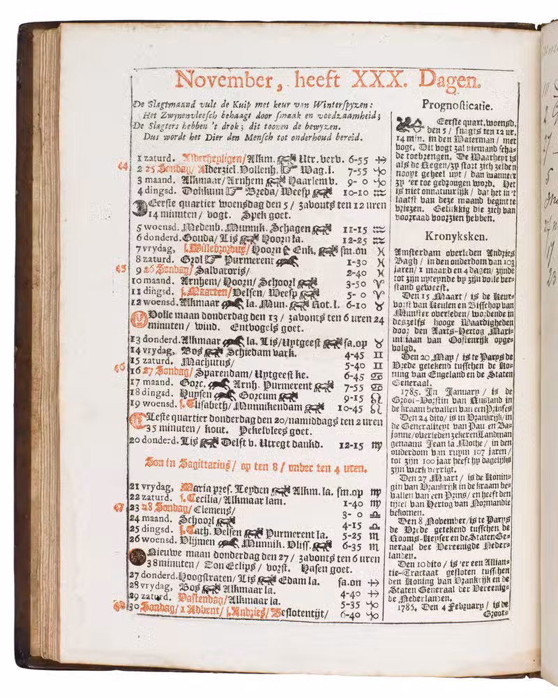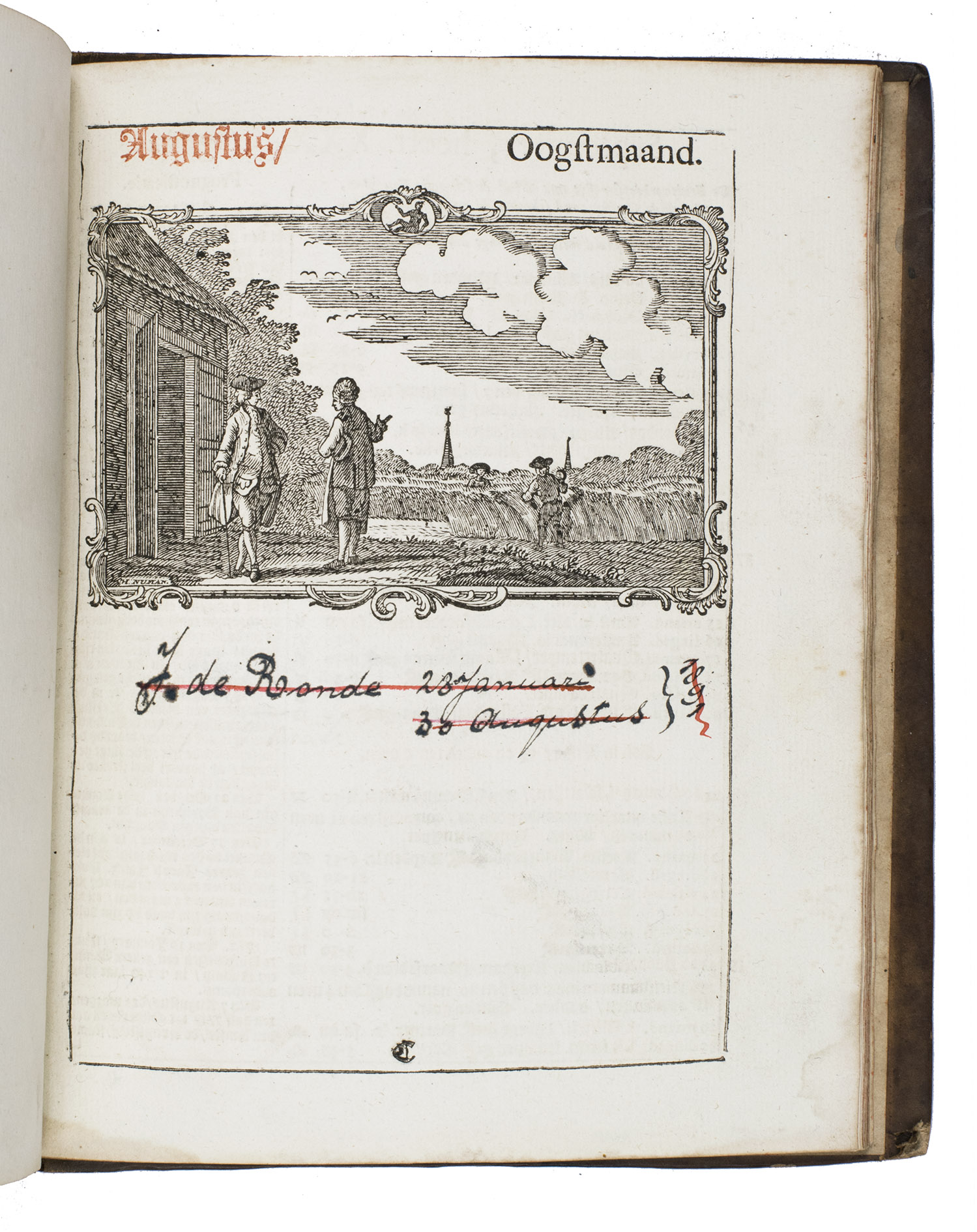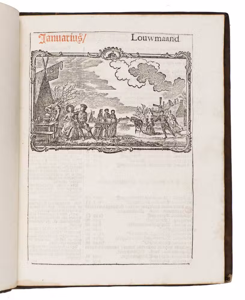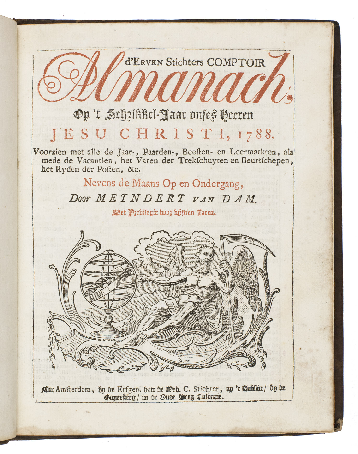 Amsterdam, the heirs of the widow of Cornelis Stichter, [1788]. 4to. With the title-page and 23 calendar pages printed in red and black, a half-page woodcut vignette (depicting Father Time pointing at an armillary sphere) by Hendrik Numan on the title-page and 12 half-page woodcut illustrations for the 12 months (each ca. 7 x 11 cm) by Hendrik Numan, nearly all signed in the block (including two dated "1779"). Contemporary gold-tooled brown mottled calf, bound by the so-called Acorn-and-Foliage Tool Bindery in Amsterdam (Storm van Leeuwen). Both boards show the large gold-tooled monogram of the Amsterdam chamber of the VOC as a centre piece sandwiched between the gold-tooled date "Anno 1788", all within a gold-tooled floral frame with floral corner pieces in the inside corners. [16] ll. interleaved with 24 blank (except for manuscript annotations) ll.