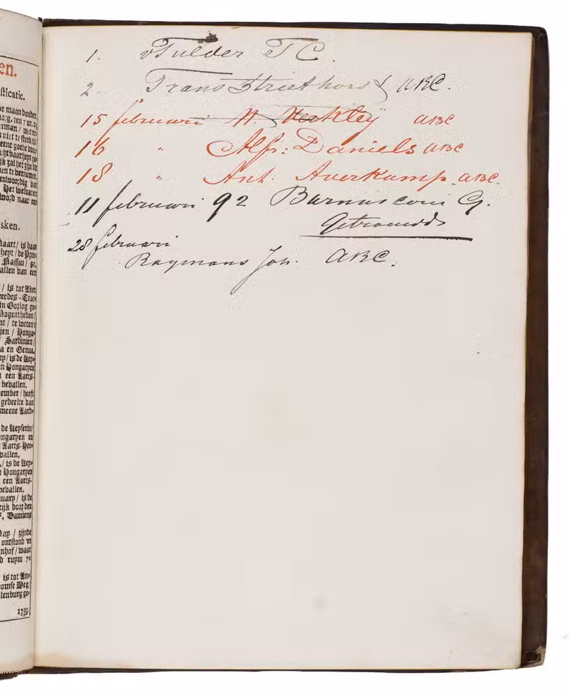 With 19th-century annotations on the interleaved blank leaves and on the recto of the first free flyleaf ( "Verjaardagen etc."). The binding is somewhat rubbed and the hinges show signs of wear, without affecting the integrity of the binding. Internally only very slightly browned along the edges of the margins. Otherwise in very good condition. Landwehr/Van der Krogt, VOC, pp. XXVII-XXVIII; STCN 292197853 (2 copies); Storm van Leeuwen I, pp. 174-176 (for the almanac) and p. 196 (VOC A stamp) and pp. 612-616 (the bindery).