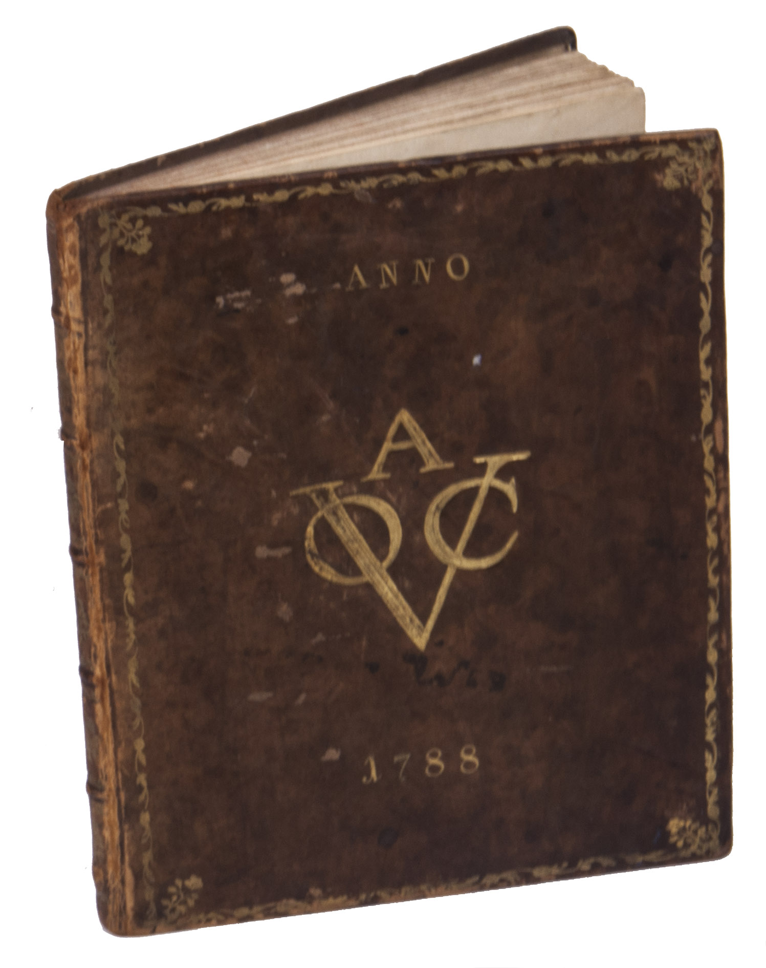 Popular Dutch almanac for the year 1788 in a remarkable contemporary Dutch East India Company (VOC) binding. The work was bound by the so-called Acorn-and-Foliage Tool Bindery (Storm van Leeuwen) and shows the large monogram of the Amsterdam Chamber of the VOC sandwiched between the date "Anno 1788" on both boards. As noted by Storm van Leeuwen, in the 18th-century this VOC A stamp "... was apparently used on almanacs that were given as gifts to persons important to the VOC. Examples form the Acorn-and-Foliage Tool Bindery ... are known, containing almanacs from 1777 and 1784." (p. 175). We are certain that the present binding is by this Acorn-and-Foliage Tool Bindery, as it is practically identical to their 1777 VOC A binding (see Storm van Leeuwen I, p. 614, no. 200). Interestingly, this means that the present binding is the latest Acorn-and-Foliage Tool Bindery now known; Storm van Leeuwen noted that the bindery was active between c. 1760 and c. 1784 but it clearly continued for a few years after.