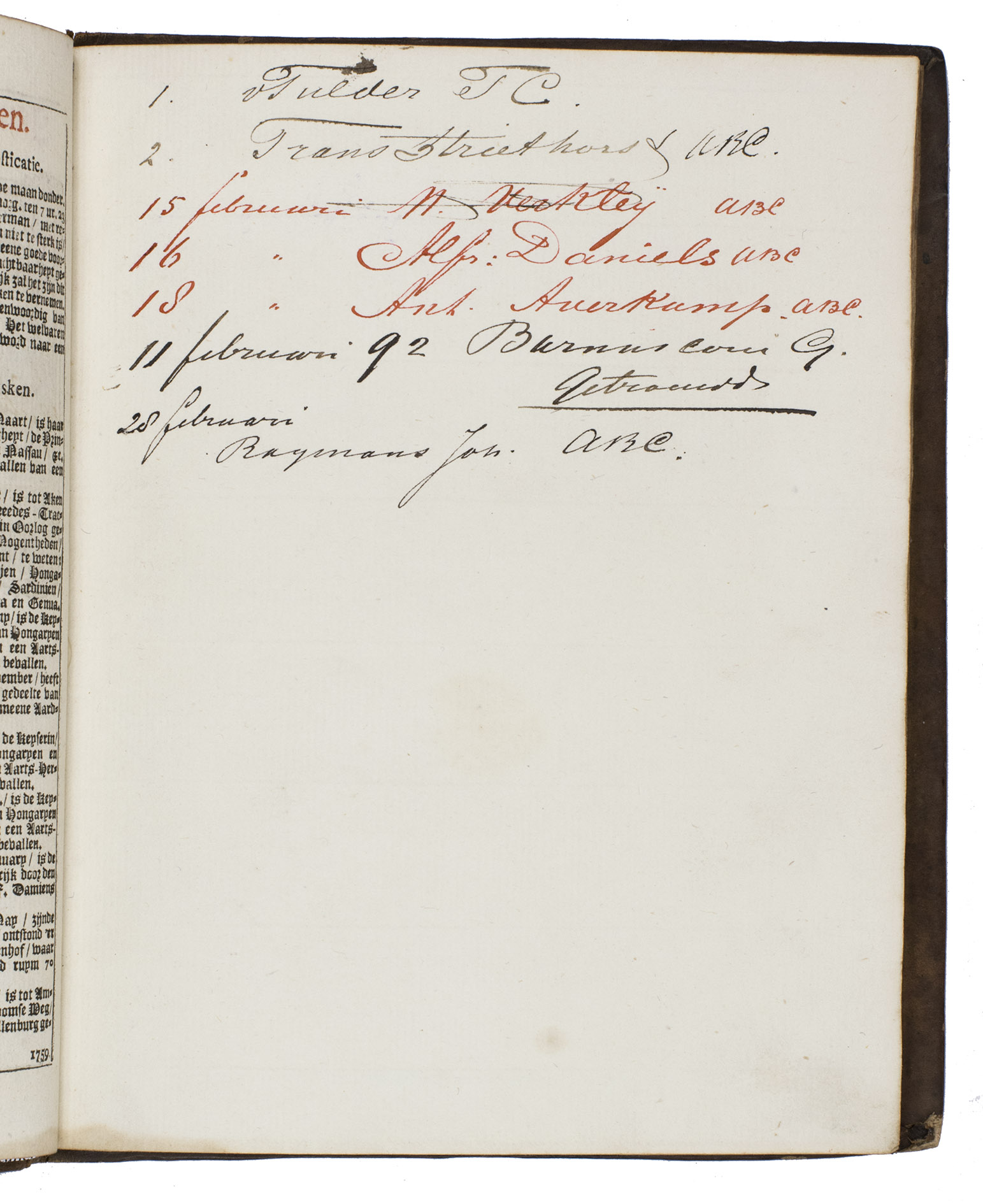 This copy is interleaved with 24 blank leaves (2 leaves between the facing pages of each month) including 12 containing several 19th-century manuscript annotations in black or red ink (a few are crossed out in red ink). These inscriptions detail the birthdays and other personal information, presumably, of relatives and acquaintances of an unidentified owner. Thus, it was more a birthday calendar and notebook than an almanac for one specific year, meaning that the owner(s) could make use of the work in its remarkable binding for years to come. Most of the inscriptions seem to refer to dates of birthdays etc., but only a few include a clear mention of a year; one is "10 juni 1859" and the other is "23 januari - 30 augustus } 1891". This suggests that the 1788 almanac was most heavily used during the second half of the 19th century.