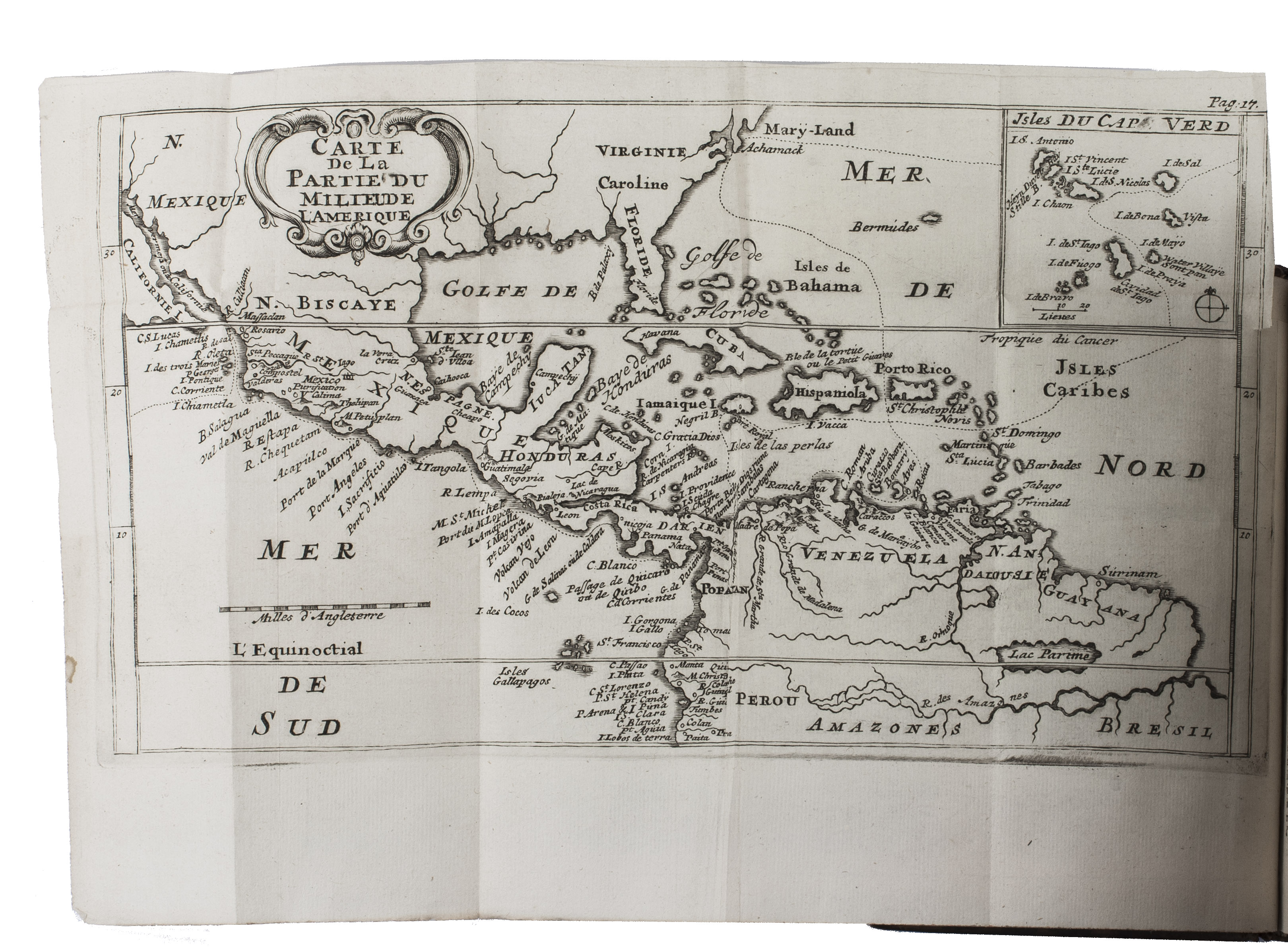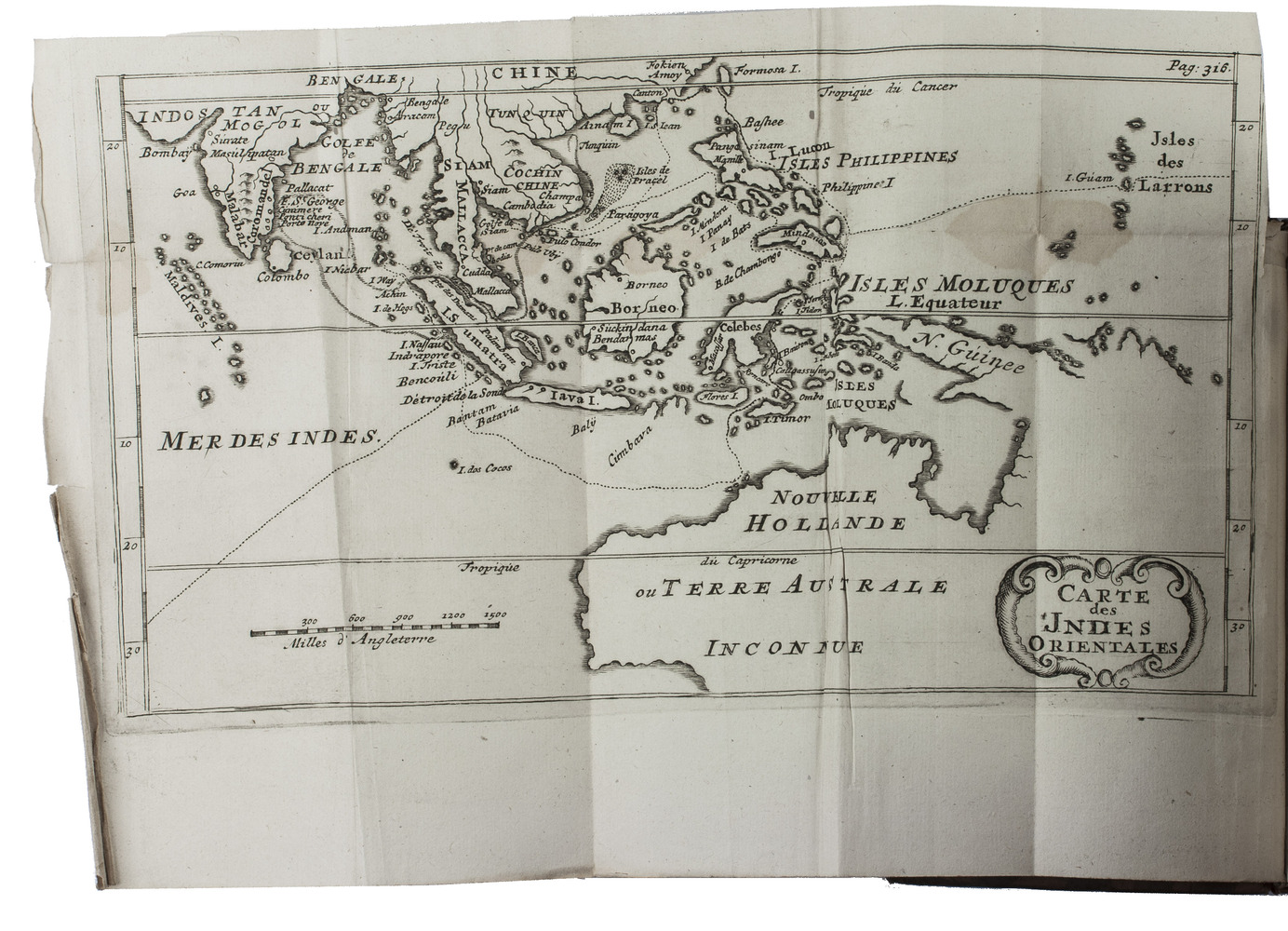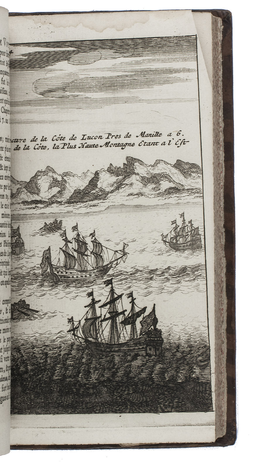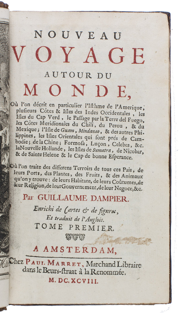 First French edition of William Dampier's account of his voyage around the world and especially to the south seas in the years 1683 to 1691. Dampier (1651-1715) sailed to Sierra Leone, from there to the Falkland Islands, Cape Horn, Peru, Guatemala, Mexico, the Philippines, Vietnam, China, Indonesia, and further to New Guinea, in the area which was to become known as Dampier Land. He went ashore in Australia, sailed on to Sumatra, the Cape of Good Hope, and back to Europe. Although John Brooke probably shipwrecked on the Australian coast in 1621 without knowing what it was, Dampier was otherwise the first Englishman to set foot in Australia. Dampier had spent several years as a buccaneer, but in the present book he diplomatically made no attempt to exploit the more sensational aspects of his adventures, concentrating on hydrographic, geographic and scientific details. This helped him establish his legitimacy, bringing immediate academic acclaim rather than condemnation as a pirate.