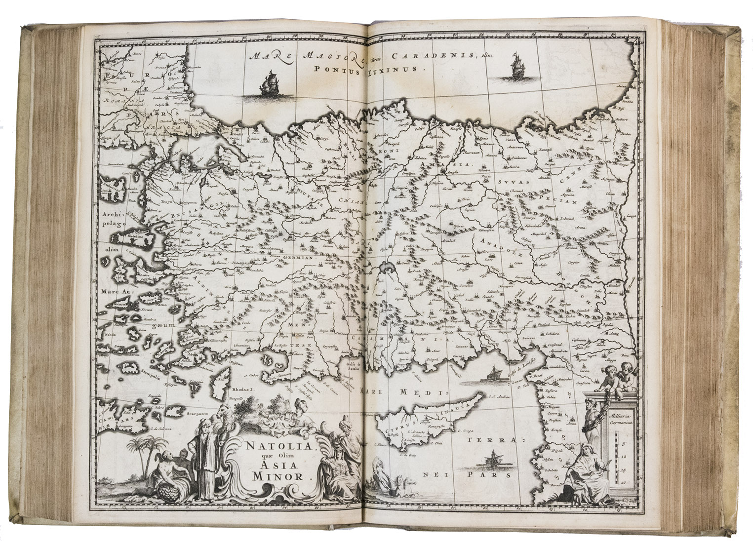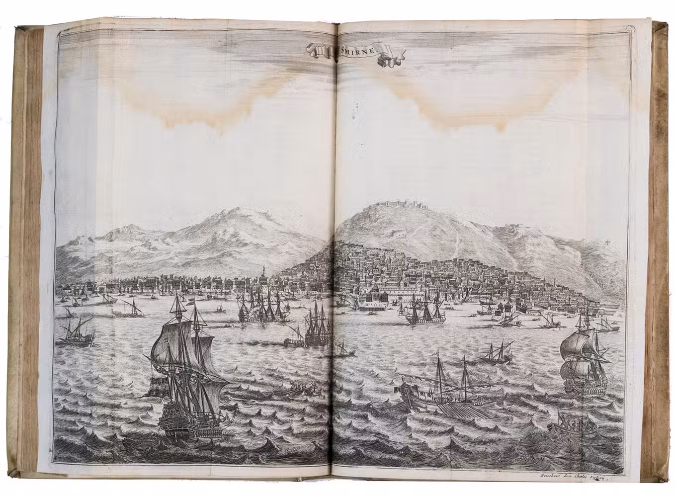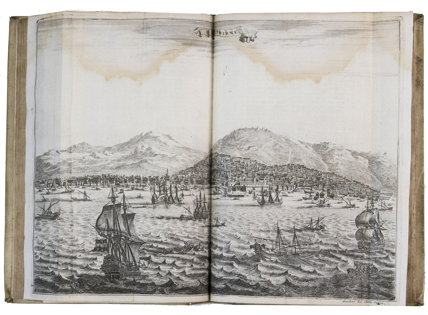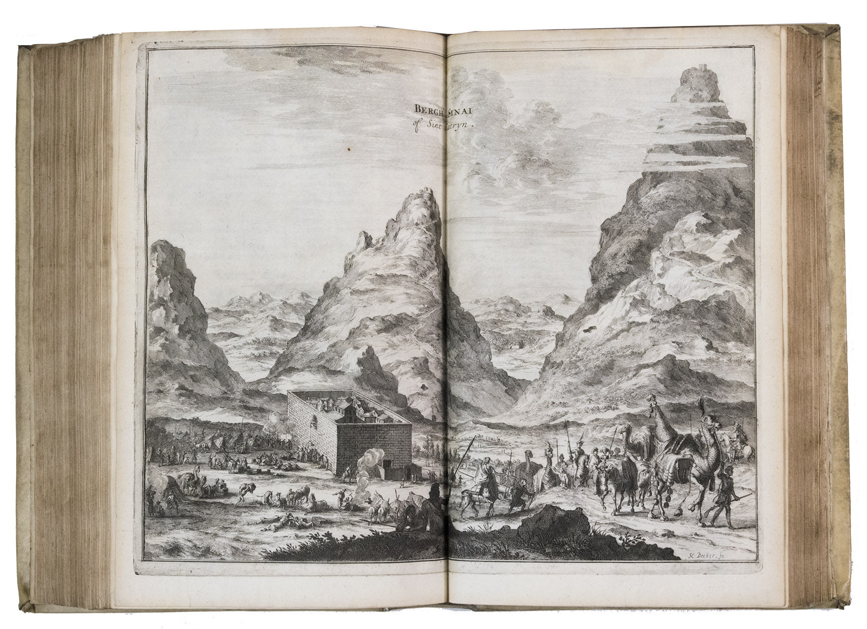 Amsterdam, Jacob Meurs, 1680. 2 parts in 1 volume. Folio. With engraved frontispiece, title-page printed in red and black, 16 engraved views and maps (2 folding, 14 double-page; 4 drawn by Charles Vasteau), and 22 engraved illustrations in the text (3 signed by Johannes Kip), further with 5 woodcut decorated initials (3 series) plus repeats and a woodcut headpiece and tailpiece. Contemporary blind-tooled vellum, gold-tooled title in red morocco to spine. [8], 357, [3], 324, [4] pp.