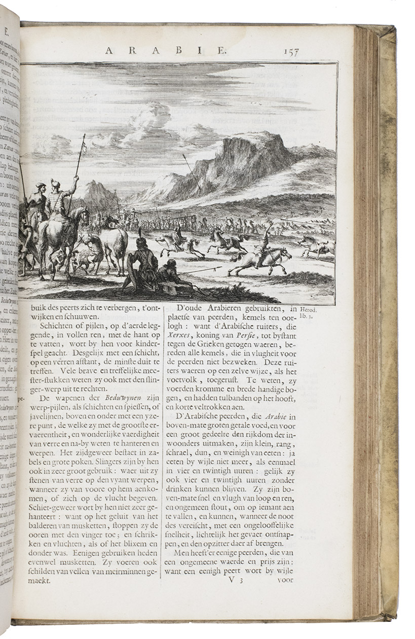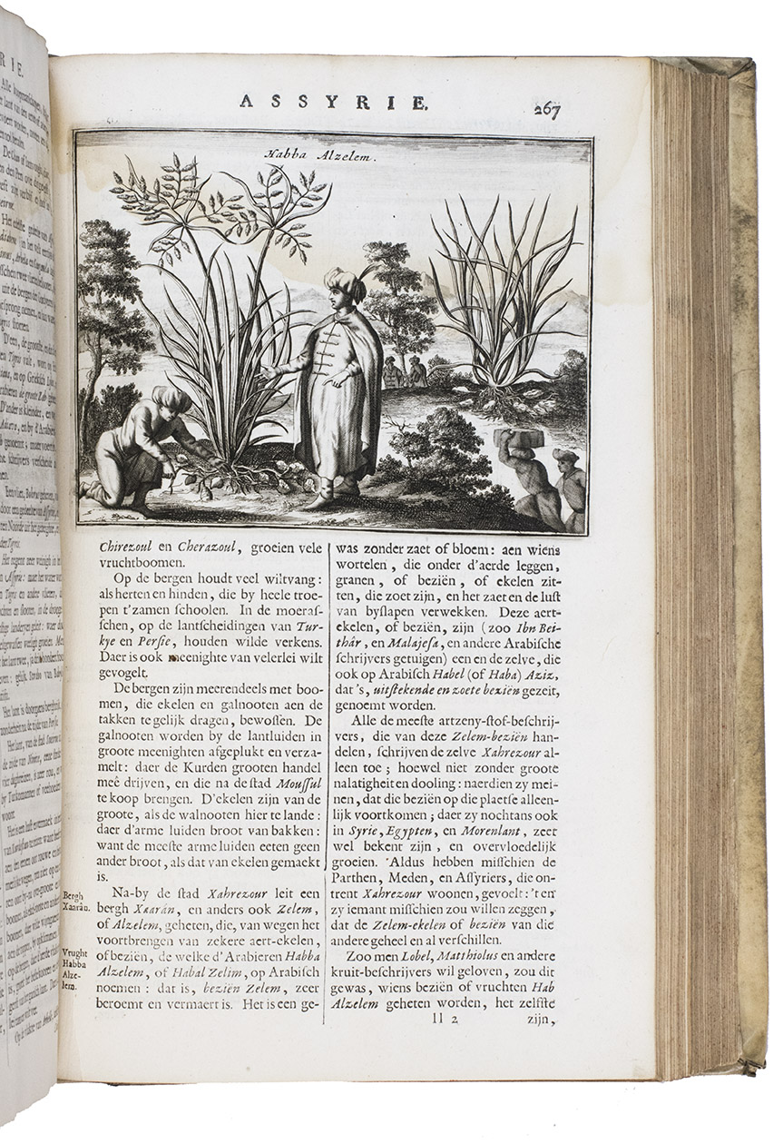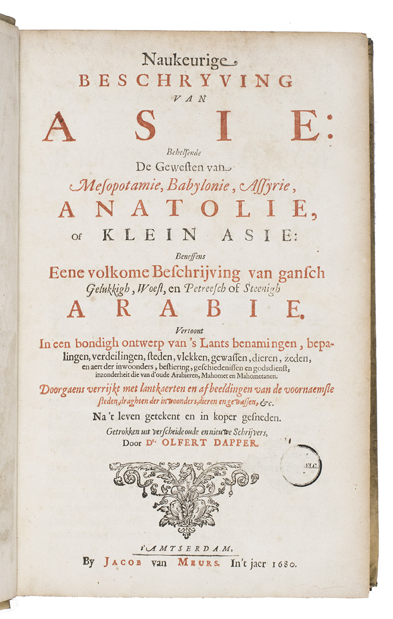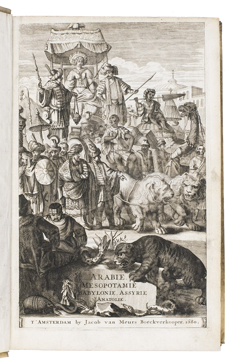 First edition of Olfert Dapper's important description of the Middle East. The first part is devoted to Mesopotamia or Algizira, Babylonia, Assyria and Anatolia, while the second is entirely devoted to Arabia. The work is especially important for the original and new information on Islam, Arabic science, astronomy, philosophy and historiography. Besides a map of Arabia, the fine plates include views of Mount Sinai, Bagdad, Basra, Nineveh, Abydos, Smyrna, Aden, Muscat, Mocha and the Tower of Babel. The second part includes a description of coffee: "In Arabia Felix alone, and in no other place of the whole world, there grows a seed or corn or bean shrub which the Arabs call 'Bon' or 'Ban', of which they prepare a drink by cooking it in water over the fire ..." (part 2, pp. 61-62). The present copy includes a plate showing the plants "Abelmosch", "Semsen" and "Sambak", not called for in the binder's instructions, but included in some copies. The work is dedicated by Dapper to the Amsterdam burgomaster Johannes Hudde, dated 10 December 1679. A translation into German by Joh. Chr. Beer was published in the next year, Umbständliche und eigentliche Beschreibung von Asia (Nurnberg 1681), with the plates copied from this original edition.