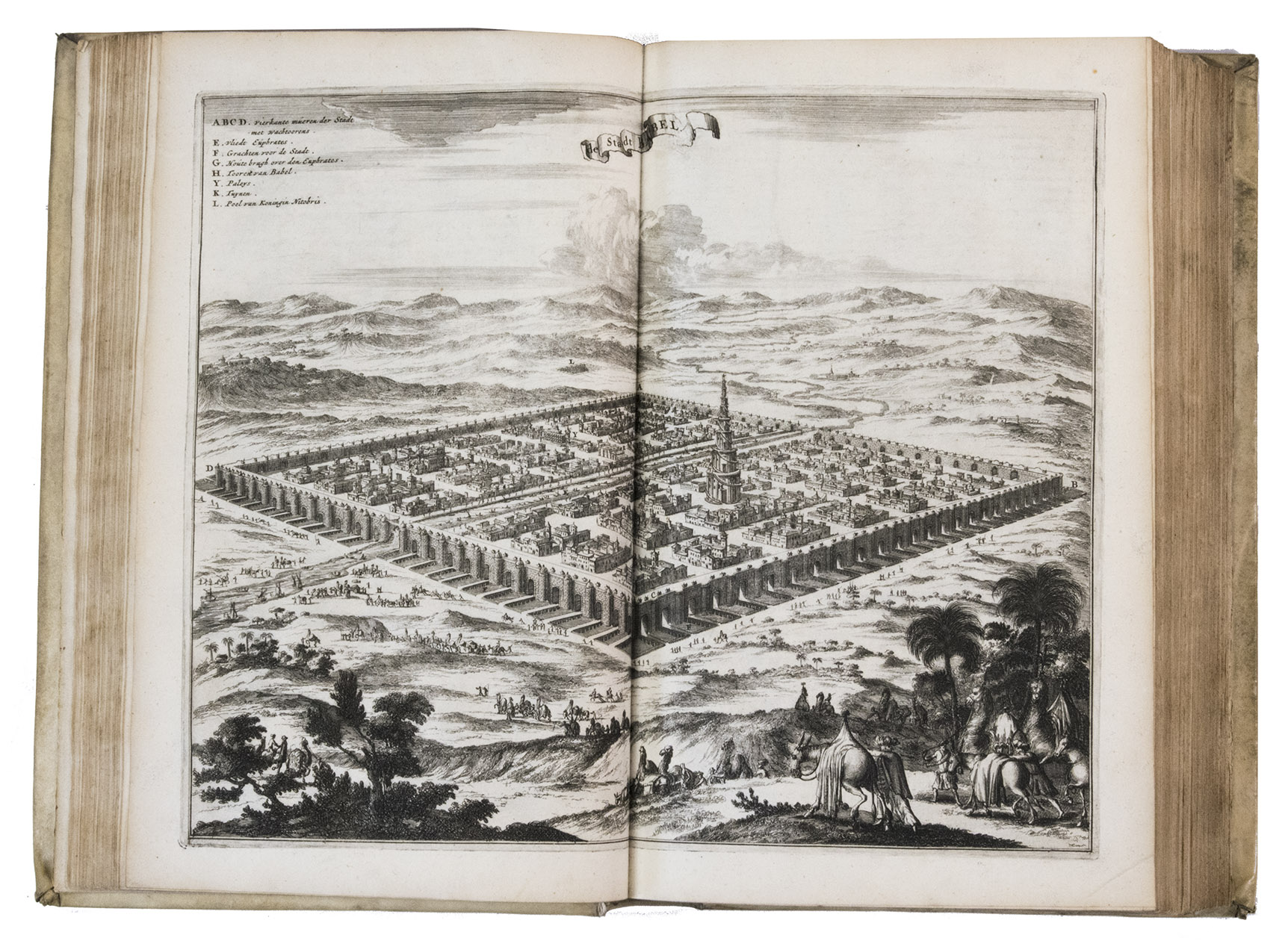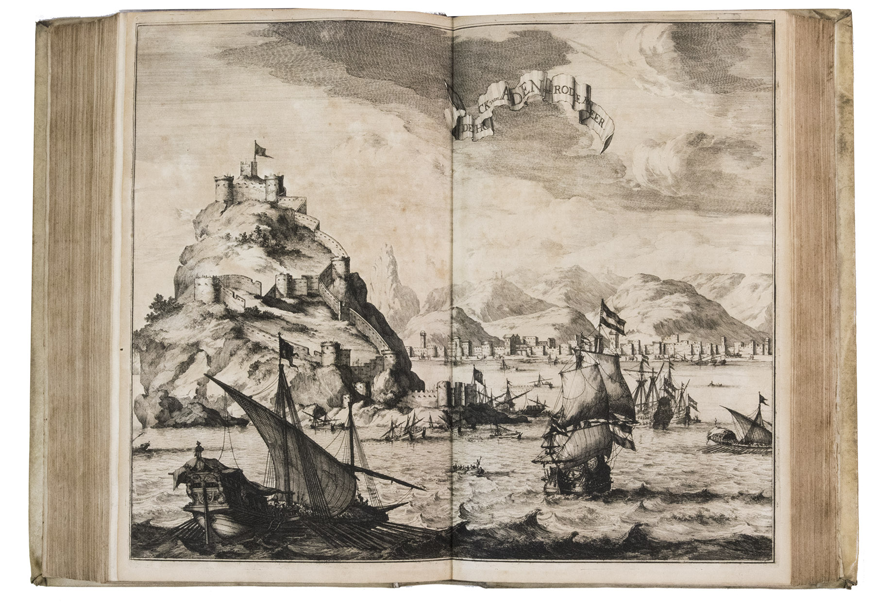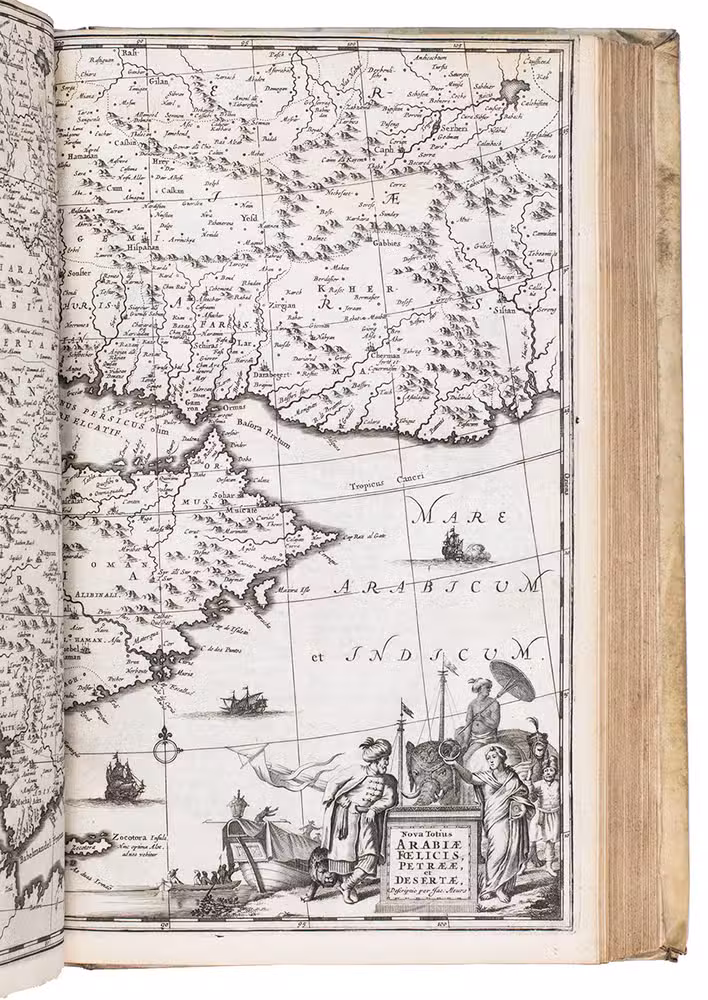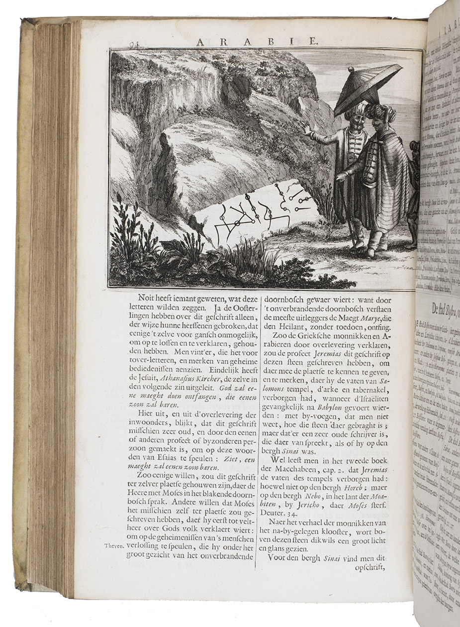 First edition of Olfert Dapper's important description of the Middle East. The first part is devoted to Mesopotamia or Algizira, Babylonia, Assyria and Anatolia, while the second is entirely devoted to Arabia. The work is especially important for the original and new information on Islam, Arabic science, astronomy, philosophy and historiography. Besides a map of Arabia, the fine plates include views of Mount Sinai, Bagdad, Basra, Nineveh, Abydos, Smyrna, Aden, Muscat, Mocha and the Tower of Babel. The second part includes a description of coffee: "In Arabia Felix alone, and in no other place of the whole world, there grows a seed or corn or bean shrub which the Arabs call 'Bon' or 'Ban', of which they prepare a drink by cooking it in water over the fire ..." (part 2, pp. 61-62). The present copy includes a plate showing the plants "Abelmosch", "Semsen" and "Sambak", not called for in the binder's instructions, but included in some copies. The work is dedicated by Dapper to the Amsterdam burgomaster Johannes Hudde, dated 10 December 1679. A translation into German by Joh. Chr. Beer was published in the next year, Umbständliche und eigentliche Beschreibung von Asia (Nurnberg 1681), with the plates copied from this original edition.