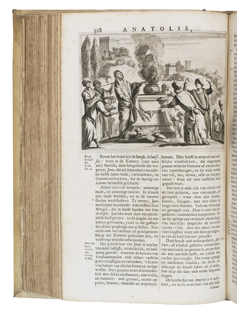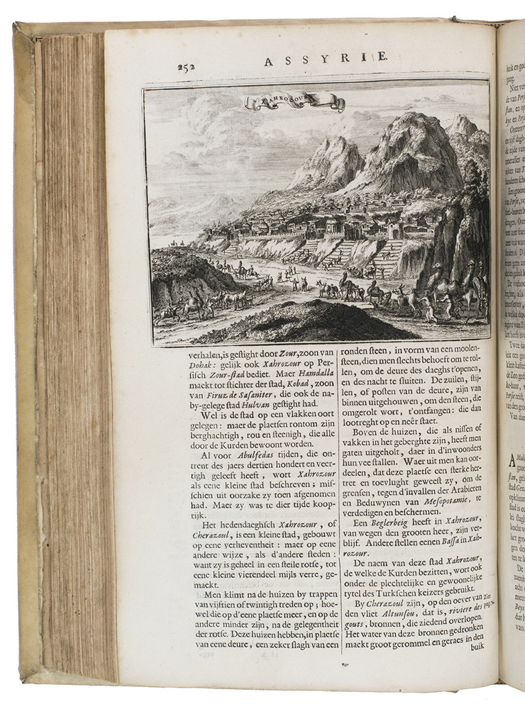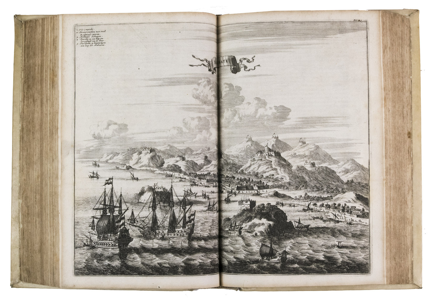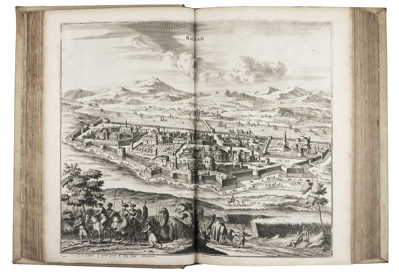 Amsterdam, Jacob van Meurs, 1680. Folio. With engraved frontispiece, 3 double-page maps (of Basra and surroundings, Anatolia and the Arabian Peninsula), 12 double-page or folding views (partly drawn by Charles Vasteau). Near contemporary blind-stamped vellum. [8], 357, [3], 324, [4] pp.