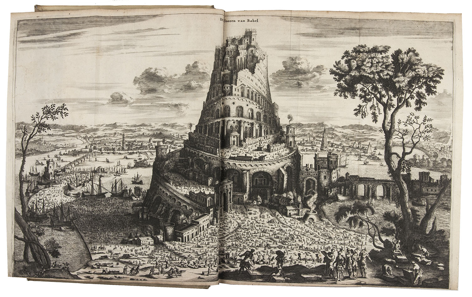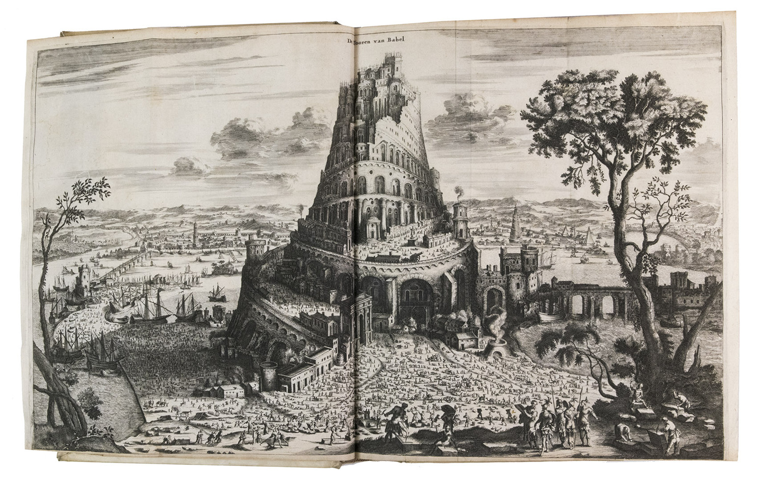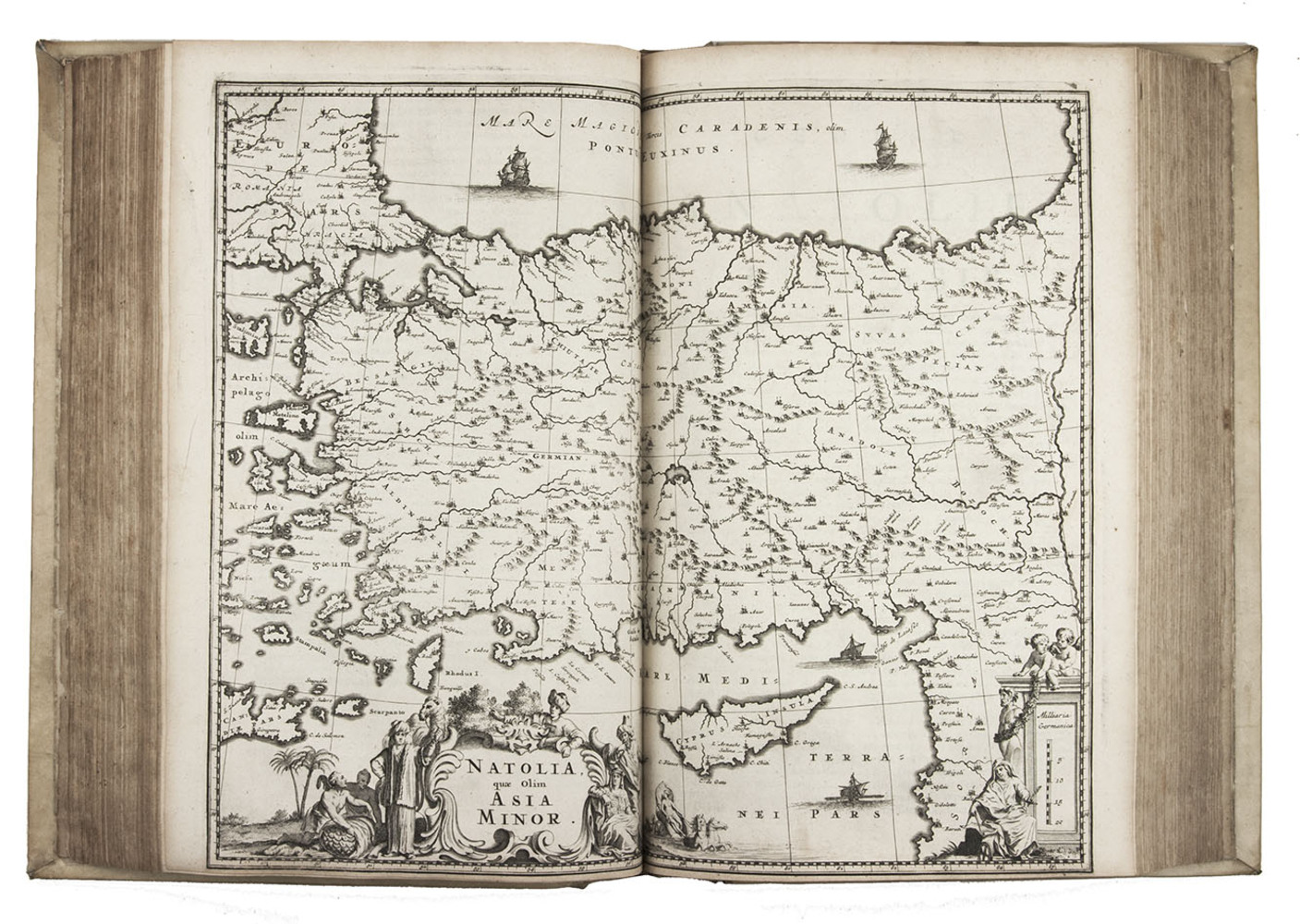 Amsterdam, Jacob van Meurs, 1680. Folio. With engraved frontispiece, 3 double-page maps (of Basra and surroundings, Anatolia and the Arabian Peninsula), 12 double-page or folding views (partly drawn by Charles Vasteau). Near contemporary blind-stamped vellum. [8], 357, [3], 324, [4] pp.
