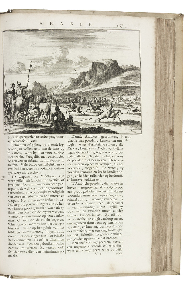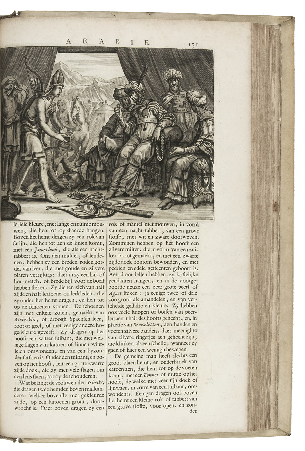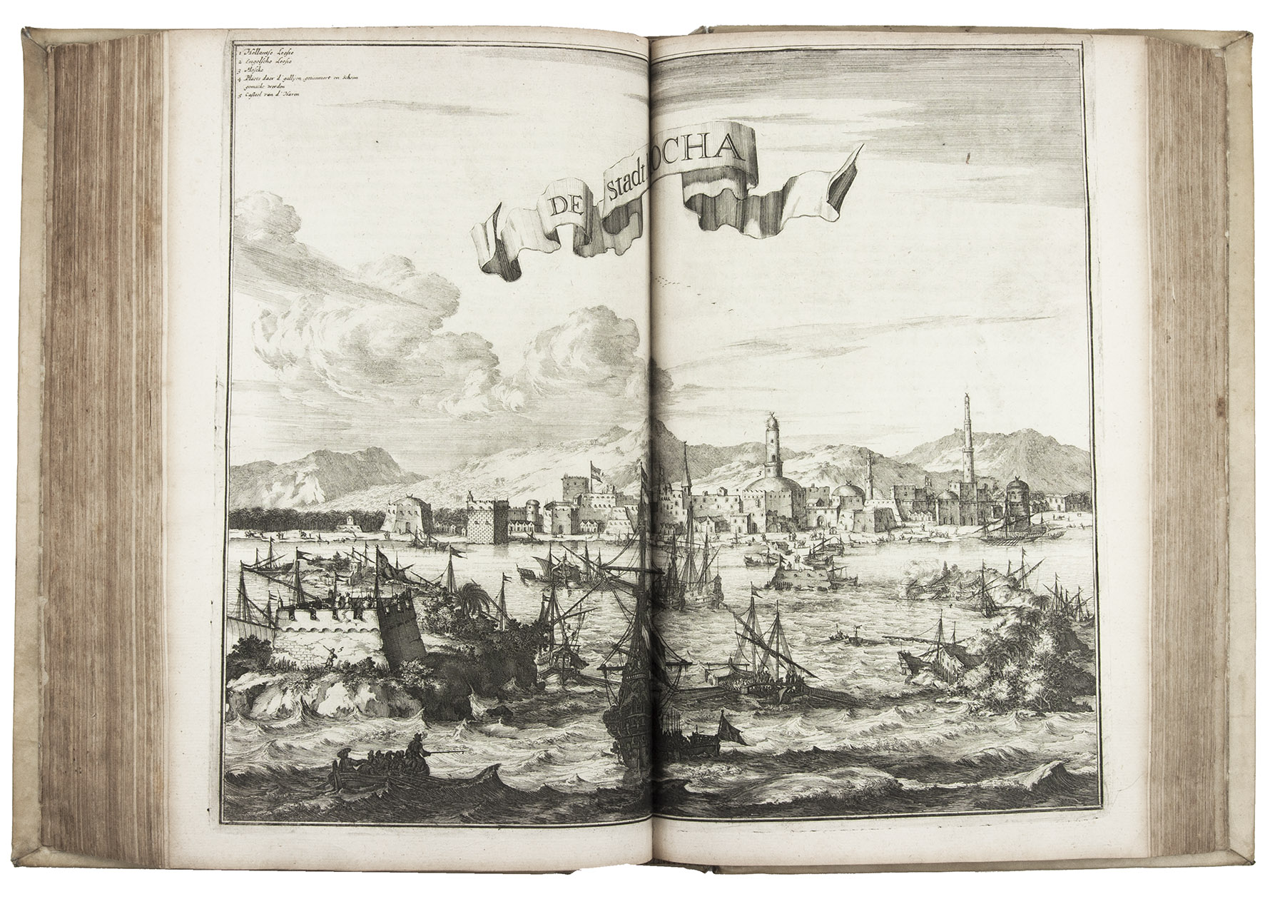First edition of Olfert Dapper's important description of the Middle East. The first part is devoted to Mesopotamia or Algizira, Babylonia, Assyria and Anatolia, while the second is entirely devoted to Arabia. The work is especially important for the original and new information on Islam, Arabic science, astronomy, philosophy and historiography. The fine plates and illustrations include views of Mount Sinai, Bagdad, Basra, Nineveh, Abydos, Smyrna, Aden, Muscat and Mocha. The second part includes a description of coffee: "In Arabia Felix alone, and in no other place of the whole world, there grows a seed or corn or bean shrub which the Arabs call 'Bon' or 'Ban', of which they prepare a drink by cooking it in water over the fire . . ." (part 2, pp. 61-62).