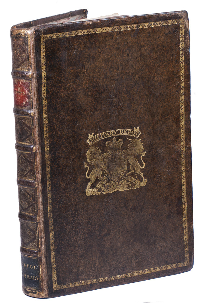 Amsterdam, Abraham Wolfgang, firm Janssonius van Waesbergen, Dirk and Hendrik Boom, Joannes van Someren and Rembertus Goethals, 1688. 2 parts in 1 volume. Folio. With an engraved title-page, 2 folding maps, 9 double-page plates and maps, 6 single-page plates and 29 half-page engravings in the text. Further with a woodcut ornament on the typographical title-page (printed in red and black) and 4 woodcut initials. Contemporary gold-tooled speckled brown calf, a red morocco title lable lettered in gold and a black morocco label lettered in gold on the spine. Both boards show a gold-tooled ornamental frame, with gold-tooled royal coat-of-arms of the United Kingdom beneath a gold-tooled banner lettered in gold "military depot" as a centre piece on the front board. Further with gold-tooled board edges, red edges, marbled end papers. [8], "168" [= 264]; [12], "164" [= 181], [6], [2 blank] pp.