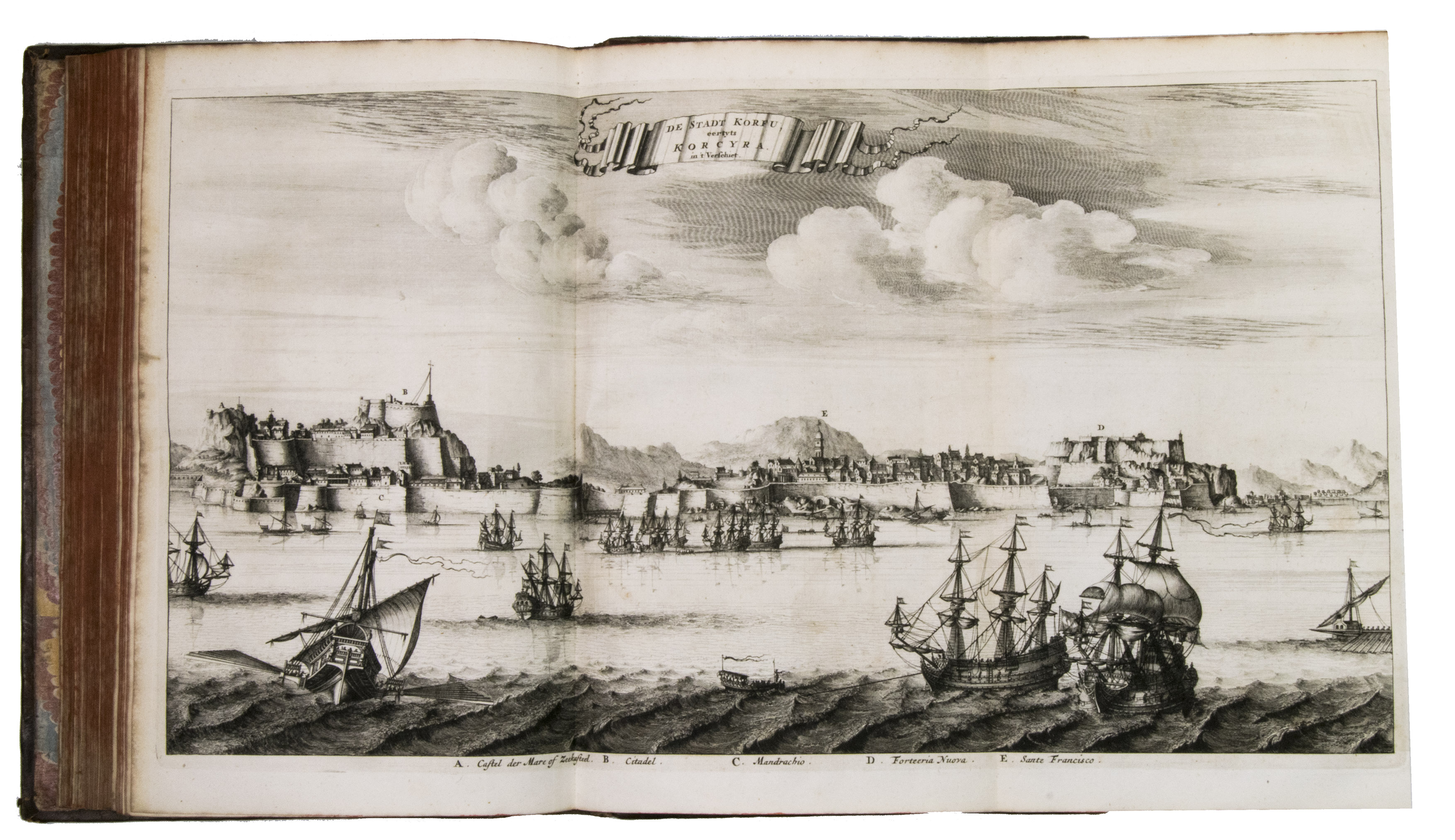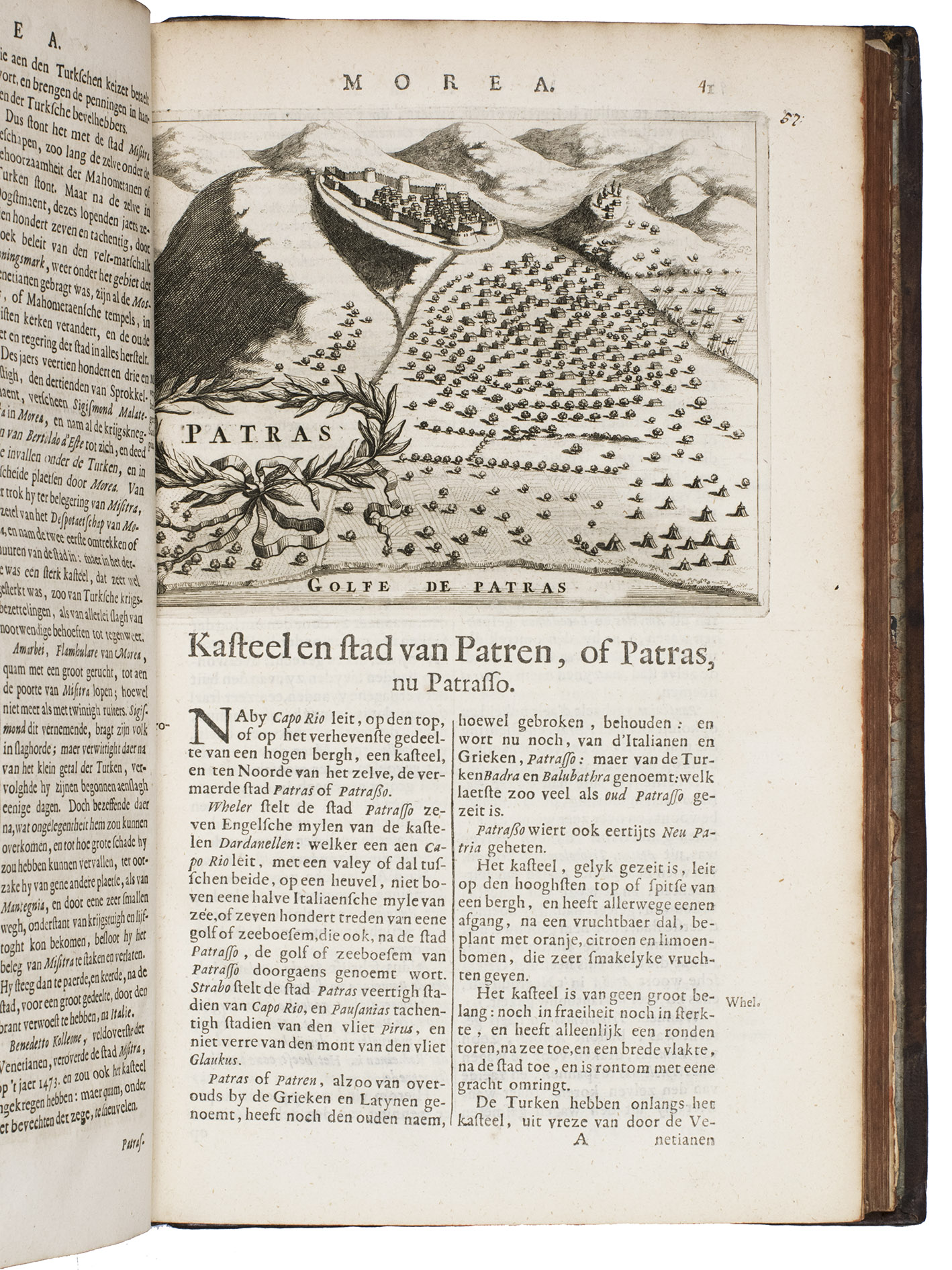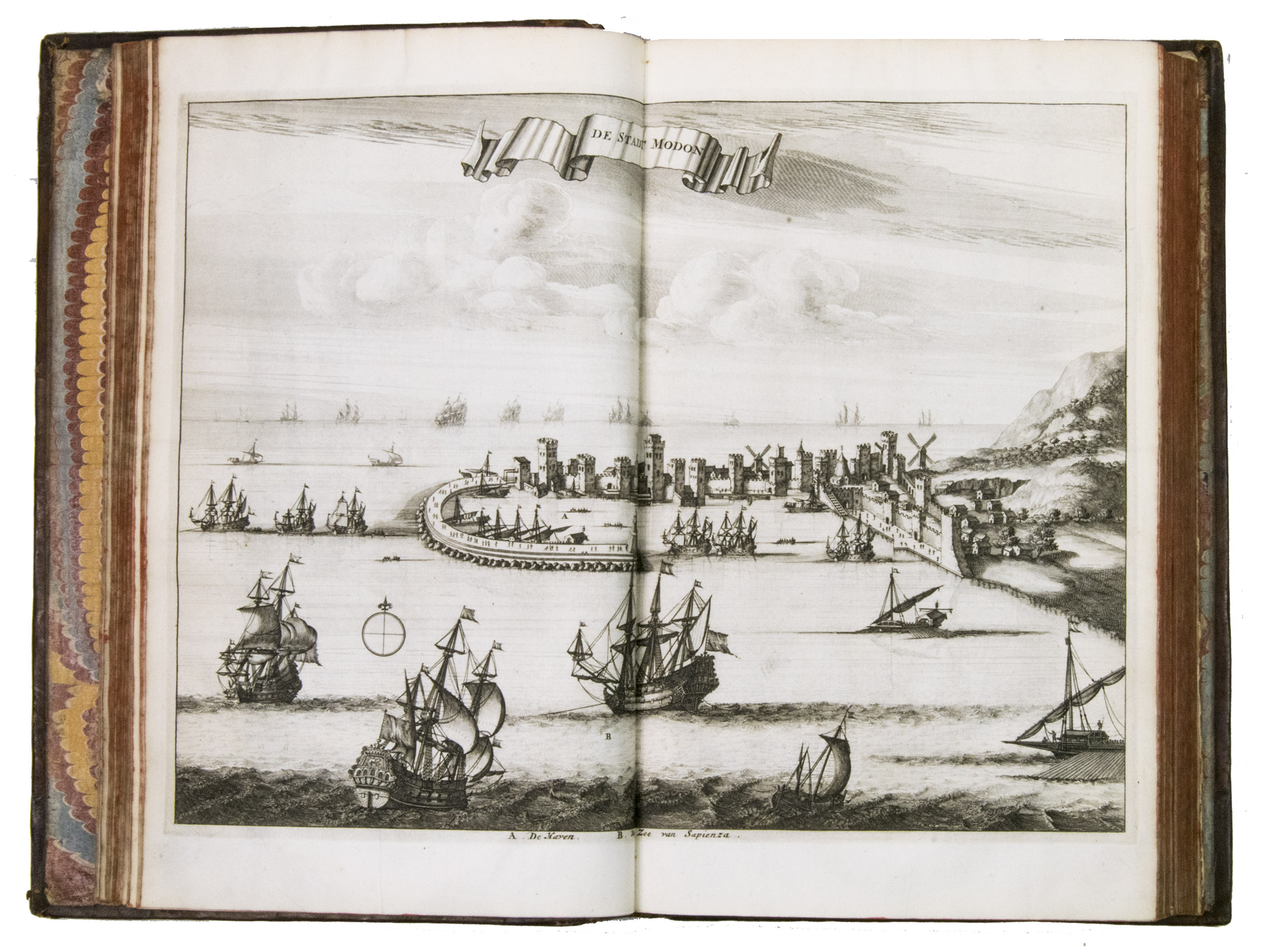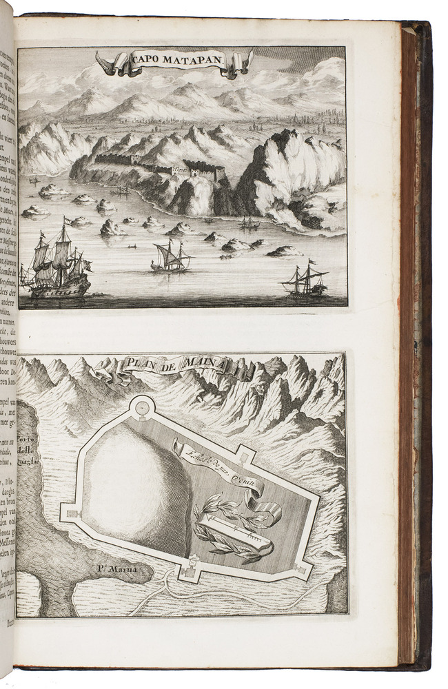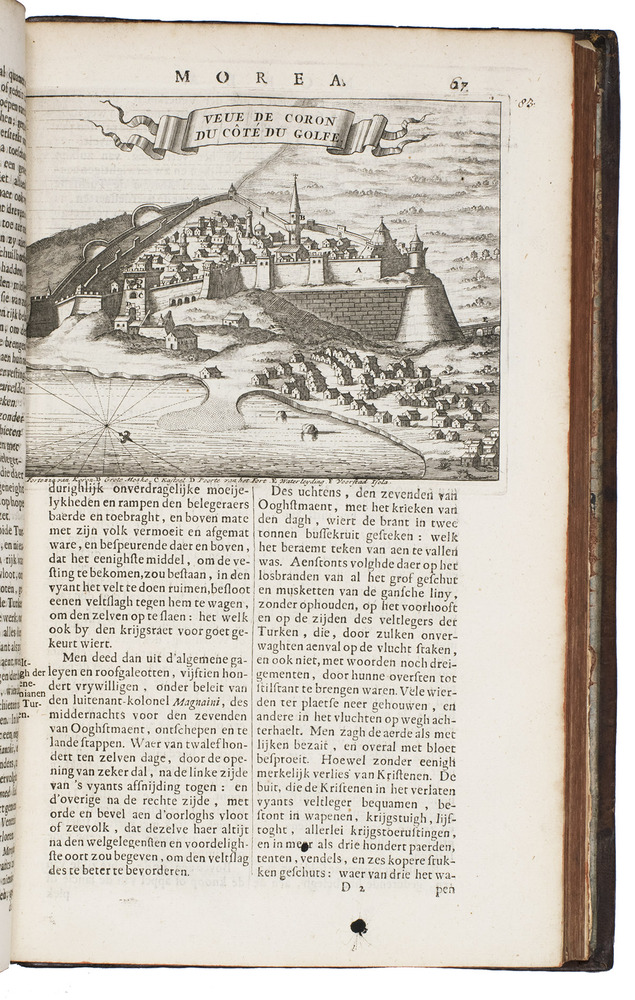 First and only edition of an important and richly illustrated work on the Peloponnese and the Adriatic Sea, with descriptions of Venice, the Dalmatian coast, and several of the major Greek Islands. The work is notable for its fine plates, after Vincenzo Maria Coronelli (1650-1718), Jacob van Meurs (ca. 1620-1679), Joan Blaeu (ca. 1598-1673) and others. It was probably published in response to the Morean War (1684-1699), the sixth conflict between the Republic of Venice and the Ottoman Empire, in which Venice took control of the Peloponnese peninsula (also known as Morea). The maps show various locations from this battle.