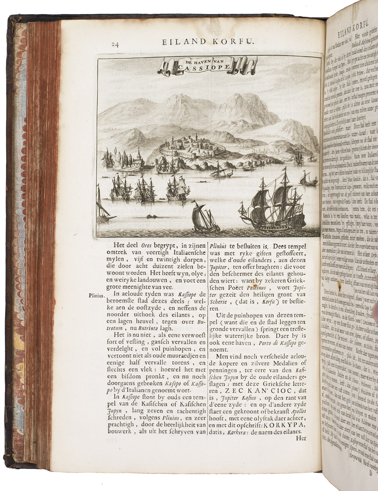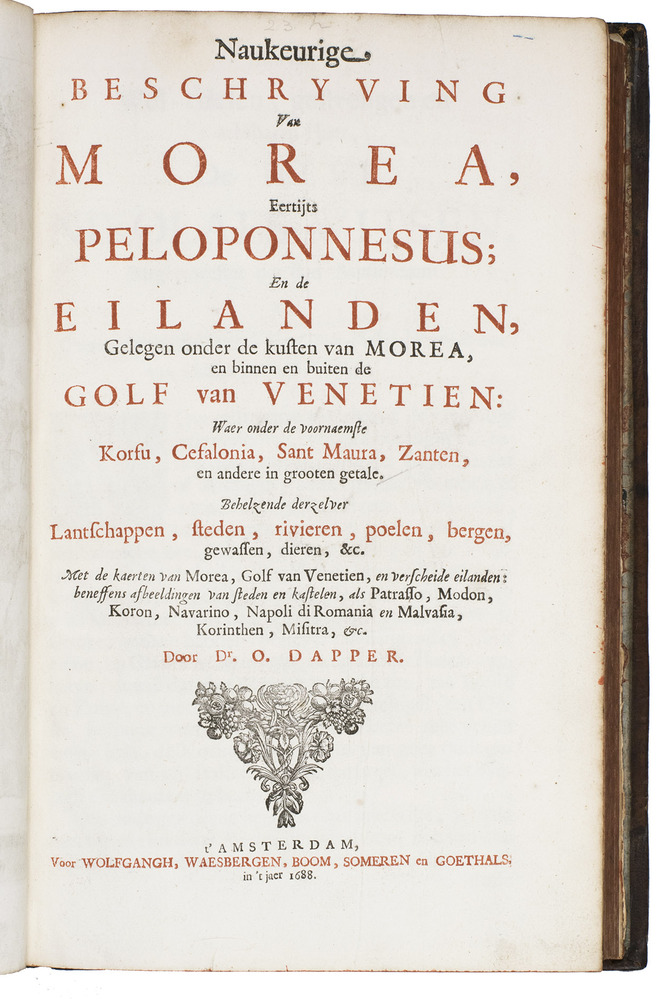 The Dutch physician and scholar Olfert Dapper (1639-1689) wrote several highly esteemed descriptions of various parts of the world, based on travel narratives from the late seventeenth century. With remarkable frequency, he published historical and geographical works on Africa, Asia (India, China, and the Dutch East Indies), the Middle East (Palestine, Persia), and the Mediterranean, all richly illustrated. The present work is one of his last. He never travelled himself, but read widely, and the numerous sources he cites throughout his texts testify to the wealth of knowledge he possessed. Some of the authors he cites in the present work are: Herodotus, Pliny the Elder, Ptolemy, Plutarch and John Chrystostom.