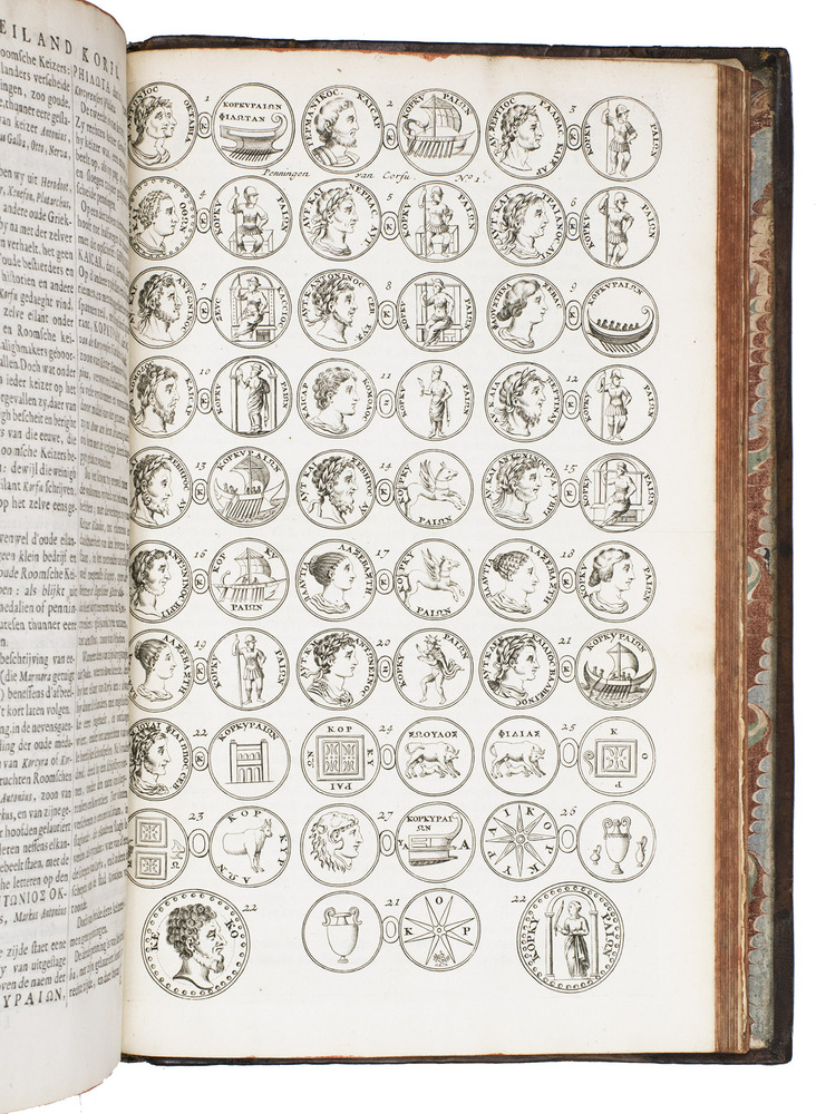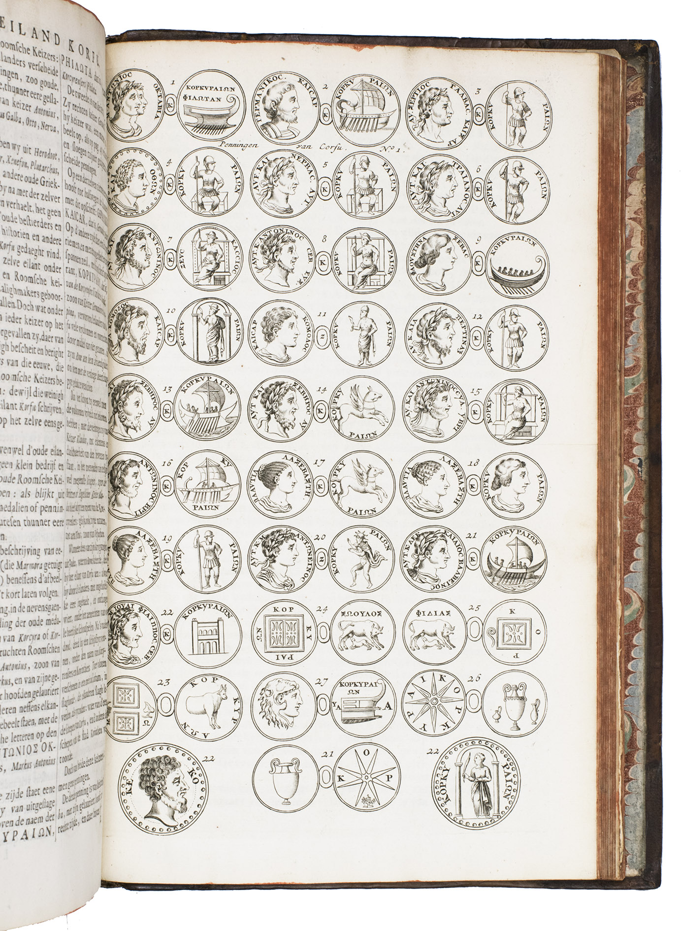 The page numbers in the first part have been corrected by an 18th-century hand. The work has been rebacked, with the original spine laid down, the leather is slightly rubbed and scratched, somewhat affecting the clarity of the gold-tooling. Page 48 of the first part has some loss of material in the fore-edge margin, without affecting the text, the plate of Zante has been bound upside down. Overall in very good condition. Navari, L., Cyprus and the Levant: Rare books from the Sylvia Ioannou Foundation I, p. 117; STCN 841792194 (17 copies including 2 incomplete); Tiele 303; USTC 1821186 (15 copies, same as STCN); Zacharakis 824-828.