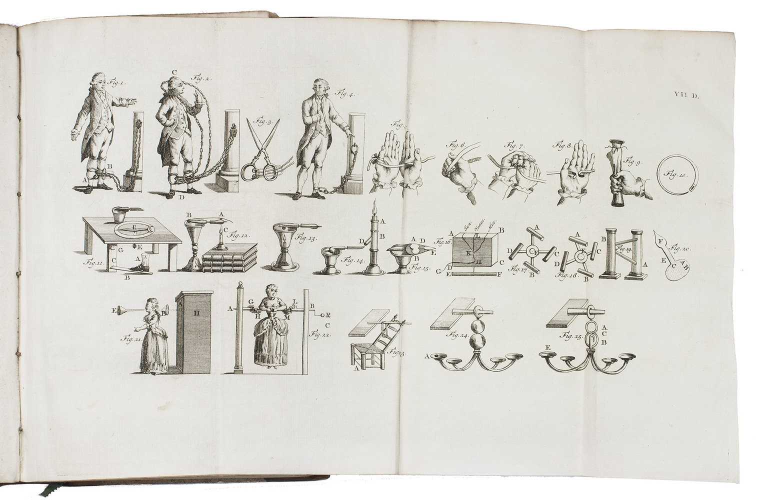 Amsterdam, Johannes Allart; Harlingen, Volkert van der Plaats, 1791-1794. 8 parts in 4 volumes. 8vo. With an engraved frontispiece by P.H. Jonxis after J. Buys in the first volume, and 12 engraved plates (including 9 folding), each depicting several figures and 1 including 4 lines of engraved music (round-headed notes on a 5-line staff). Contemporary half calf, gold-tooled spines. [2], 174 [1], [1 blank]; 104; [2], 159, [1]; 176; [2], 164; 123, [1 blank]; [2], 130; 243, [1 blank] pp.