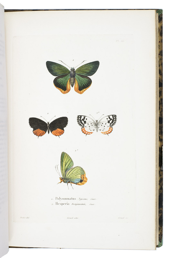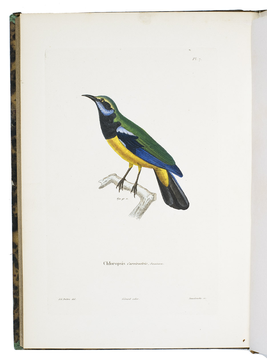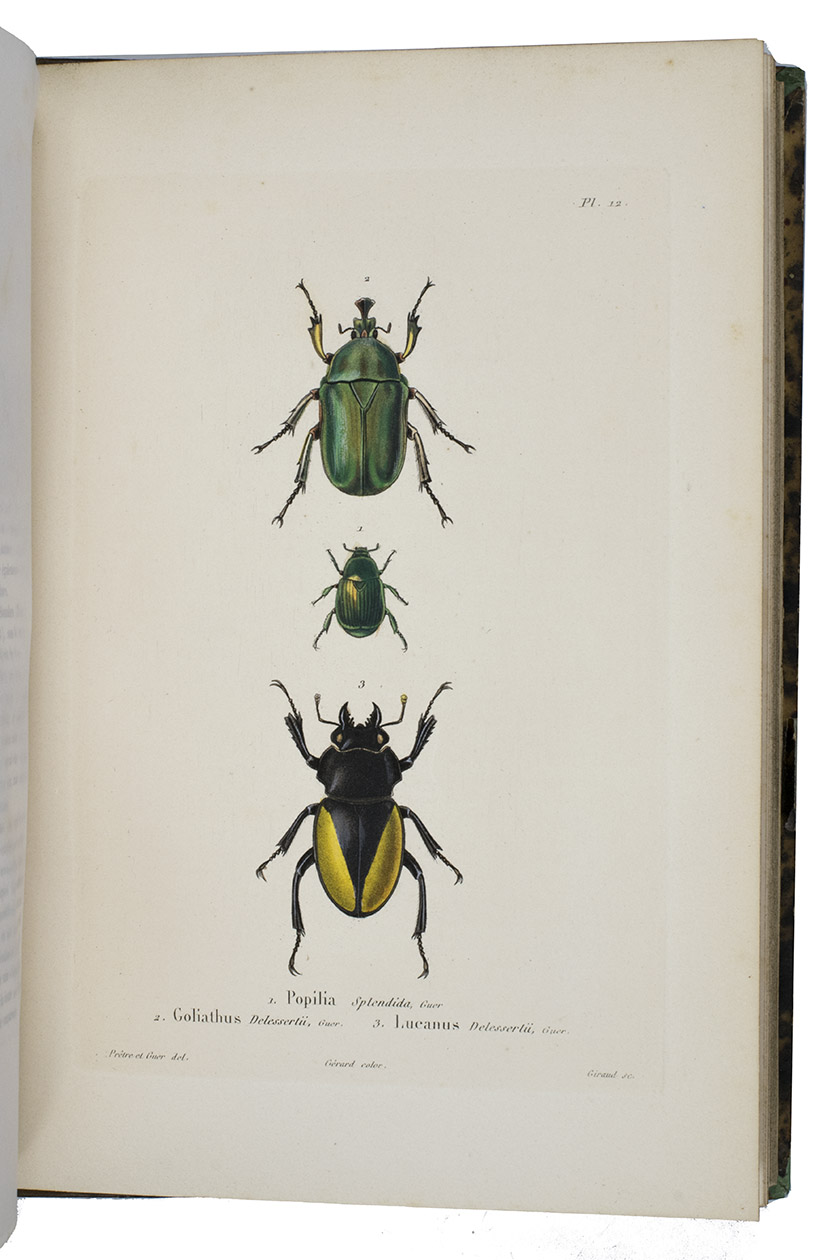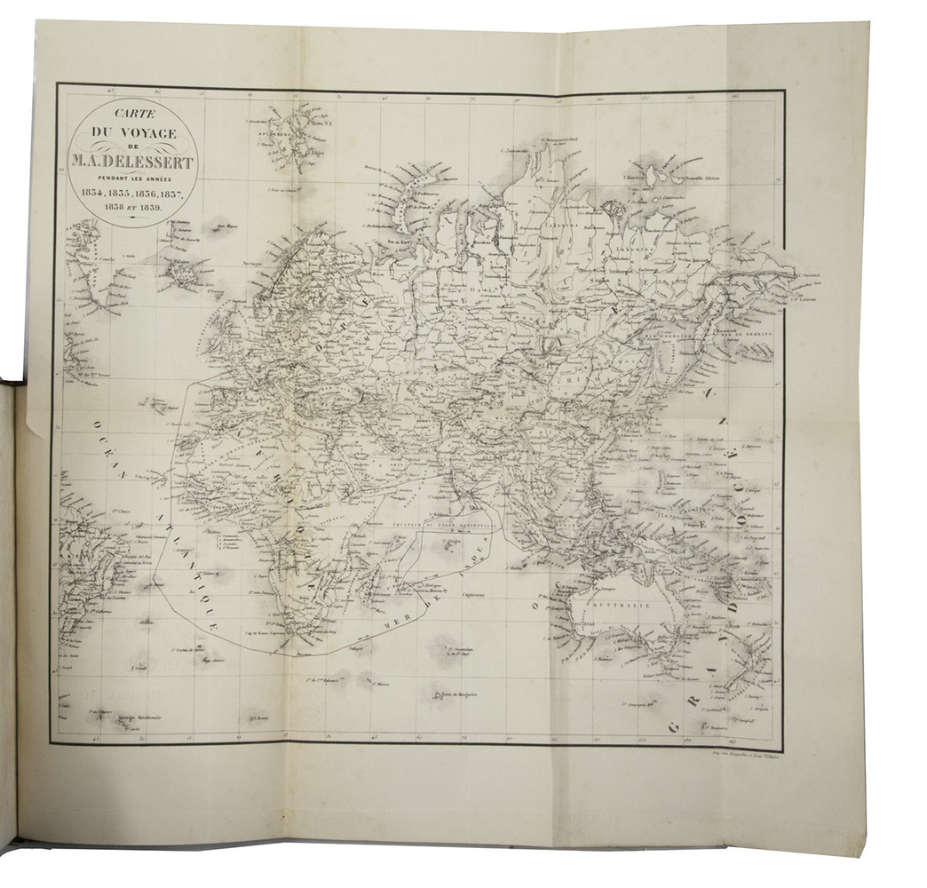 Paris, Fortin, Masson et Cie & Langlois et Leclercq (facing title-page: printed by Béthune et Plon), 1843. 2 parts in 1 volume. Large 8vo. With engraved title-vignette signed by A. Vien, 8 lithographed plates in the first part by V. Dolet showing Ile Bourbon, Pondichéry, Malacca, Chase au tigre, Madras, a bivouac and Chûte de la Rivière de Gutpurba; 27 numbered full-page engraved plates in the natural history part by Forget, Annedouche, Sebin, Mme. Douliot, Bourgeois, Giraud, Davesne and Dumesnil after Jean Gabriel Prêtre, Delahaye, Mme Bury and Vaillant of mammals, birds, insects and butterflies, 24 of which are exquisitely coloured by hand by "Gérard". Also with one folded map (43 x 44 cm) of the world (except for the Americas) with Delessets journey marked, coloured in outline and printed by Kaeppelin, Paris. Half calf, decorated paper sides. [6], III, 134; [4], 107 pp.