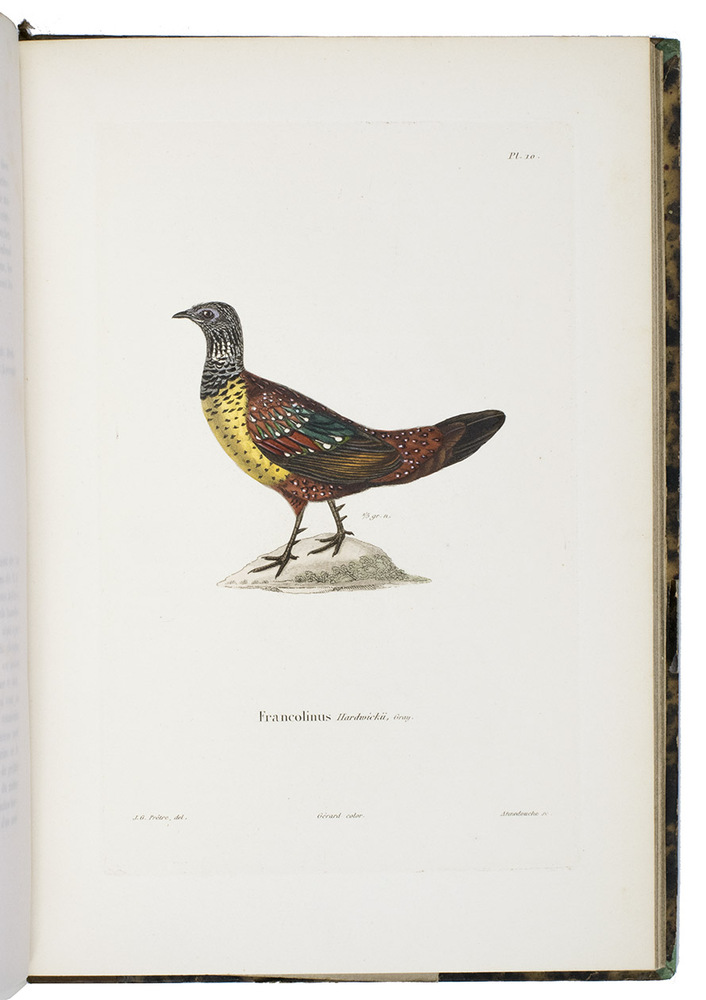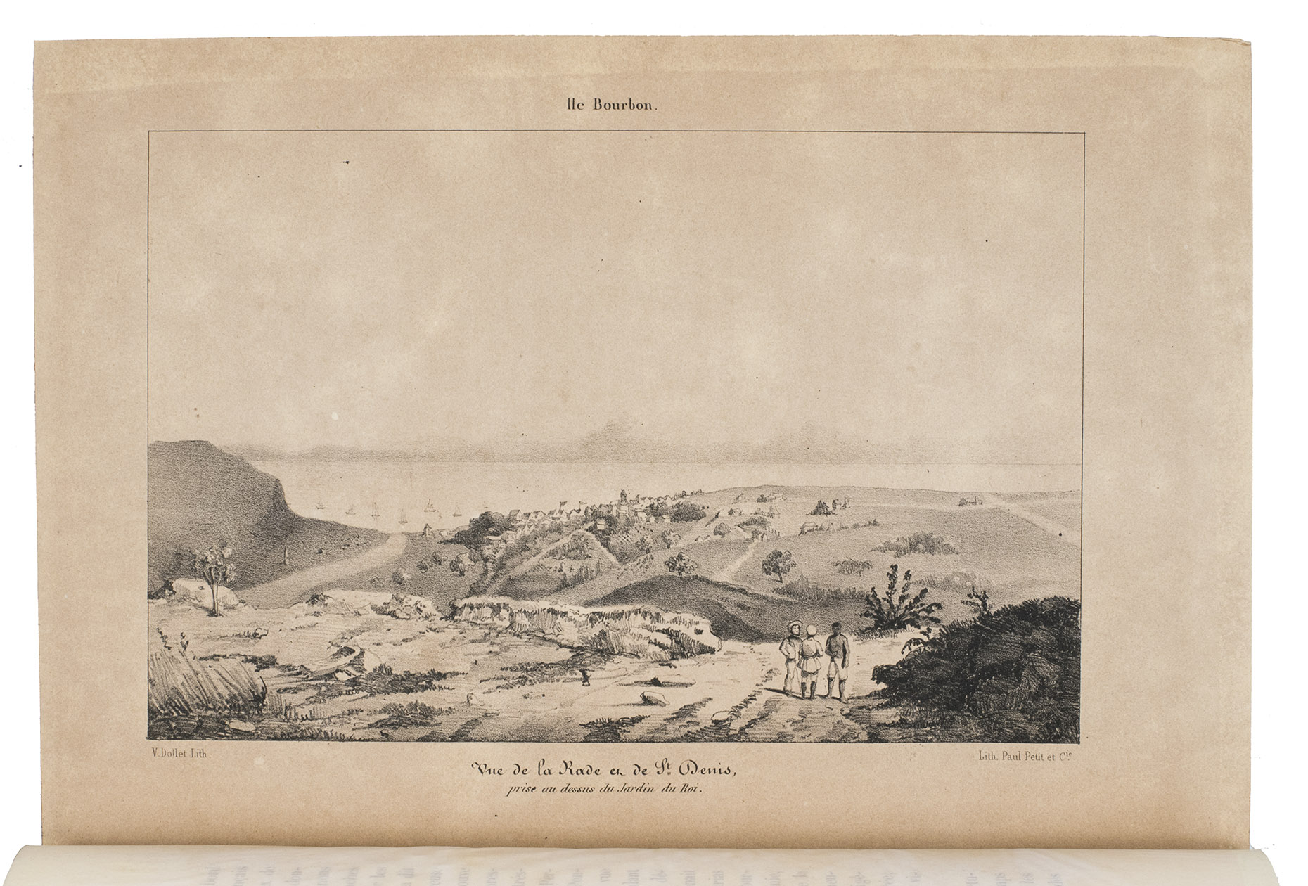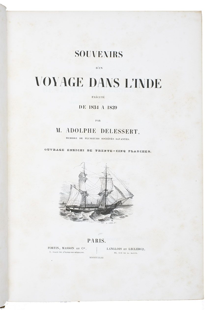 First edition of the travel account of the explorer and naturalist Adolphe François Delesset (1809- 1869) who accompanied Perrotet on his journey to India and Southeast Asia, dedicated to his uncle Baron Benjamin Delesset . During five years (1834-39) he collected several new species of plants and animals including the Wynaad laughing thrush which he collected on the slopes of the Nilgiris, which Thomas C. Jerdon named Garrulax delesserti in his honour. He travelled through Mauritius, Reunion Island, Penang, Pondicherry, Malay Peninsula, Singapore, Java, Calcutta, Bengal, Bombay and Madras, returning on 30 April 1839.