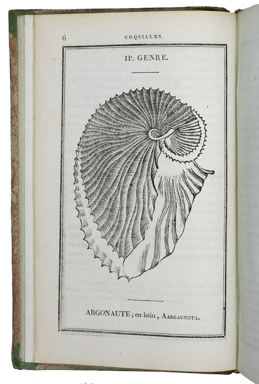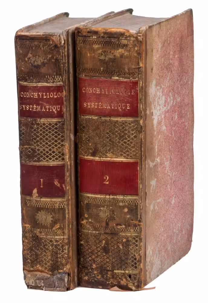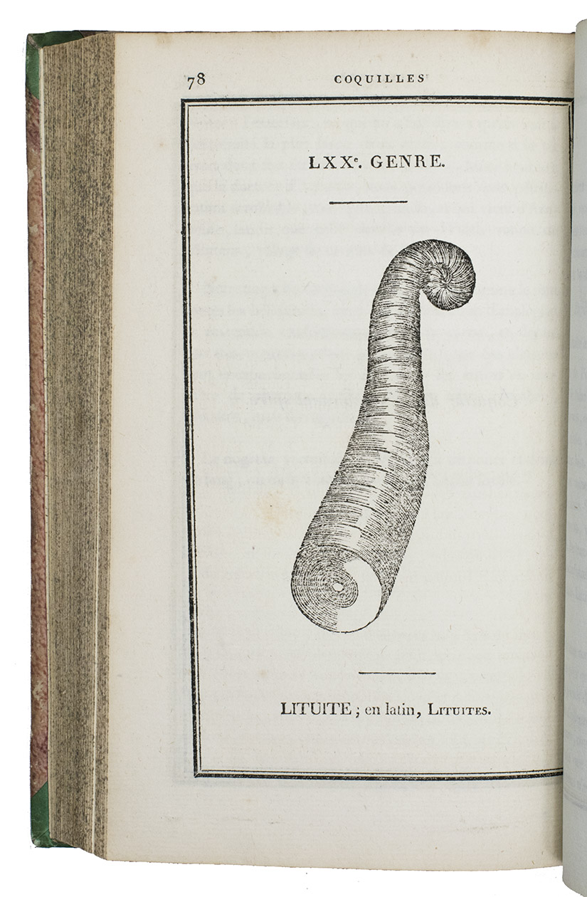 Paris, F. Schoell, 1808-1810. 2 volumes. 8vo. With 261 woodcut illustrations of shells (most nearly full-page). Contemporary half calf, gold-tooled spine, red ribbon marker. LXXXVII, [1], 409, [1]; [4], 676 pp.