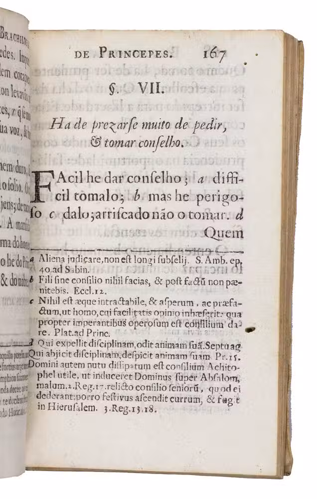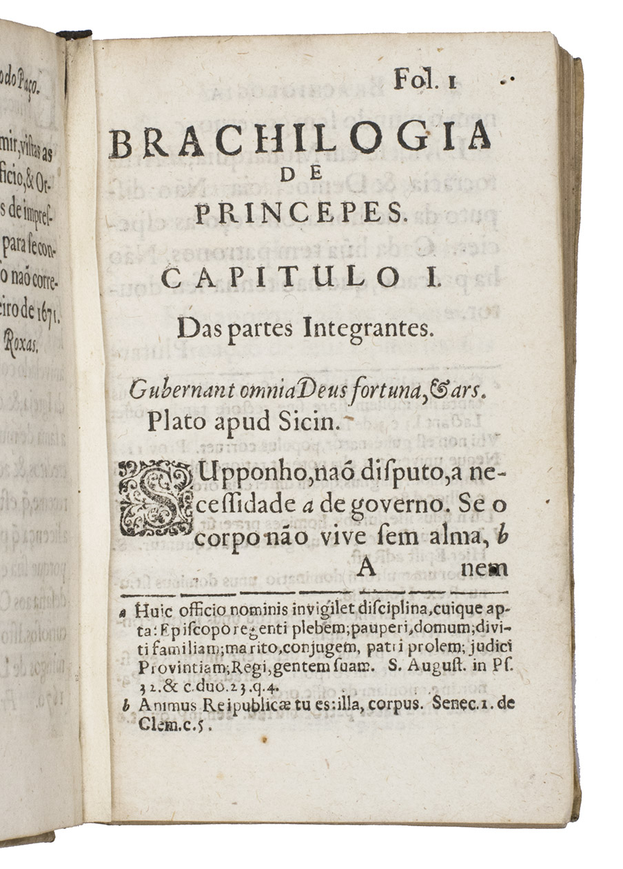 Rare first (and until 1946 only) edition of a concise account of the qualities needed to be a good ruler and the best Christian manner of educating people to be rulers, by Jacinto de Deos or Deus (Macau 1612-Goa 1681), a Capuchin Franciscan missionary in Goa under Portuguese rule, dedicated to the Prince Regent and future King Dom Pedro II (1648-1706) of Portugal. Dom Pedro was 22 when De Deos published it, though he had already been de facto head of state for three years. It was no doubt intended both for him and for the future education of his daughter and heir, then two years old, but in the event she died before him. The fact that De Deos was a Franciscan in Asia gives the book special significance for its insights into his attitudes, for the Jesuits largely dominated the literature on missionary work in Asia. We know less about the Franciscans, though they claimed priority over the Jesuits in most regions.