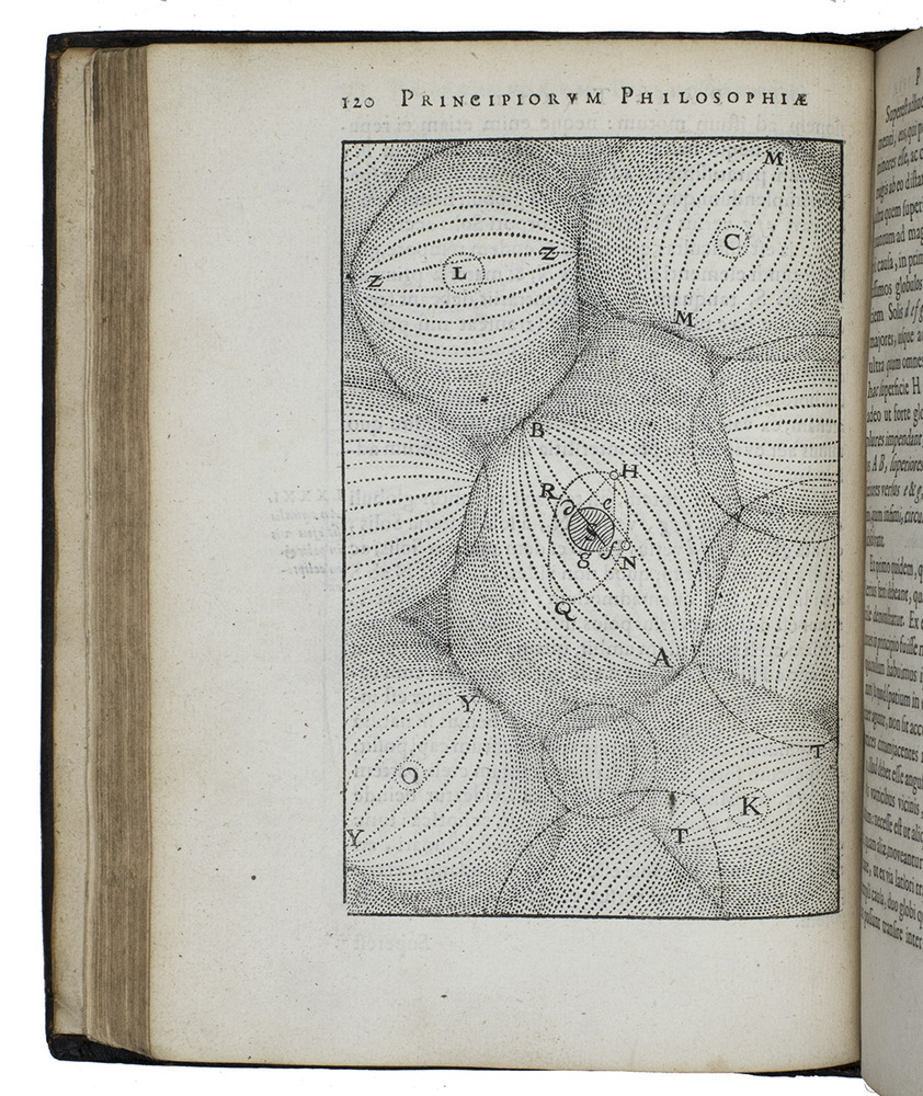 Third edition of the Principia in the original Latin, bound with the associated third Latin editions of the two supplementary works, the three published in matching format and layout in the year of the authors death by Louis Elzevier, who published all of the earlier Latin editions in 1644 and 1650. Together these three books form the collected principal works of René Descartes (1596-1650), arguably the most influential philosopher of early modern Europe. Louis Elzevier first published Descartess Principia philosopiae in 1644. It contains the philosopher's thoughts on the structure of the universe, including his highly influential vortex theory, illustrated with woodcuts after drawings by Franciscus van Schooten. Although Descartes wrote the Principia in Latin, he had earlier written two books in French that he now revised and corrected for publication in Latin by Louis Elzevier, matching the format and layout of the Principia so that they could be issued together. They originally appeared in French as Discourse de la methode pour bien conduire sa raison (1637) and Les passions de lame (1649). Elzevier published the Latin edition of the Discourse ..., with the present title Specimina ... together with the first edition of the Principia in 1644. In 1650 he published new editions of both as well as the first Latin edition of the French Passion ..., under the present title Passiones animae. Later in 1650 he published new editions of all three works, the present set, but their layout and typography matches the earlier 1650 4to editions so closely that the classic bibliographies, including Willems, Rahir and Berghman do not distinguish them.
