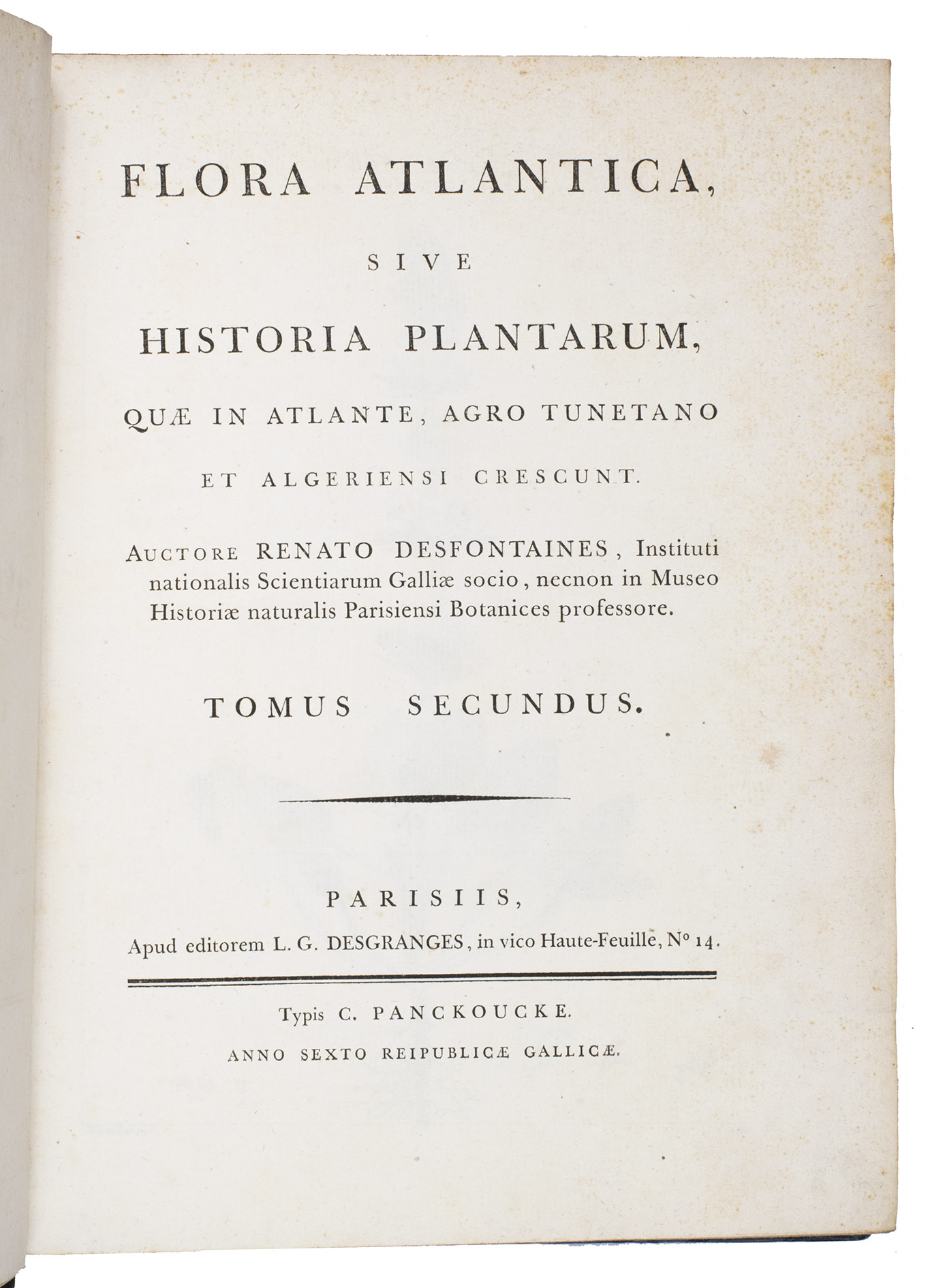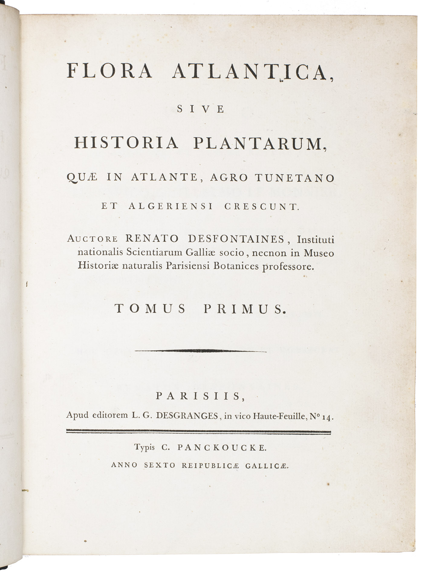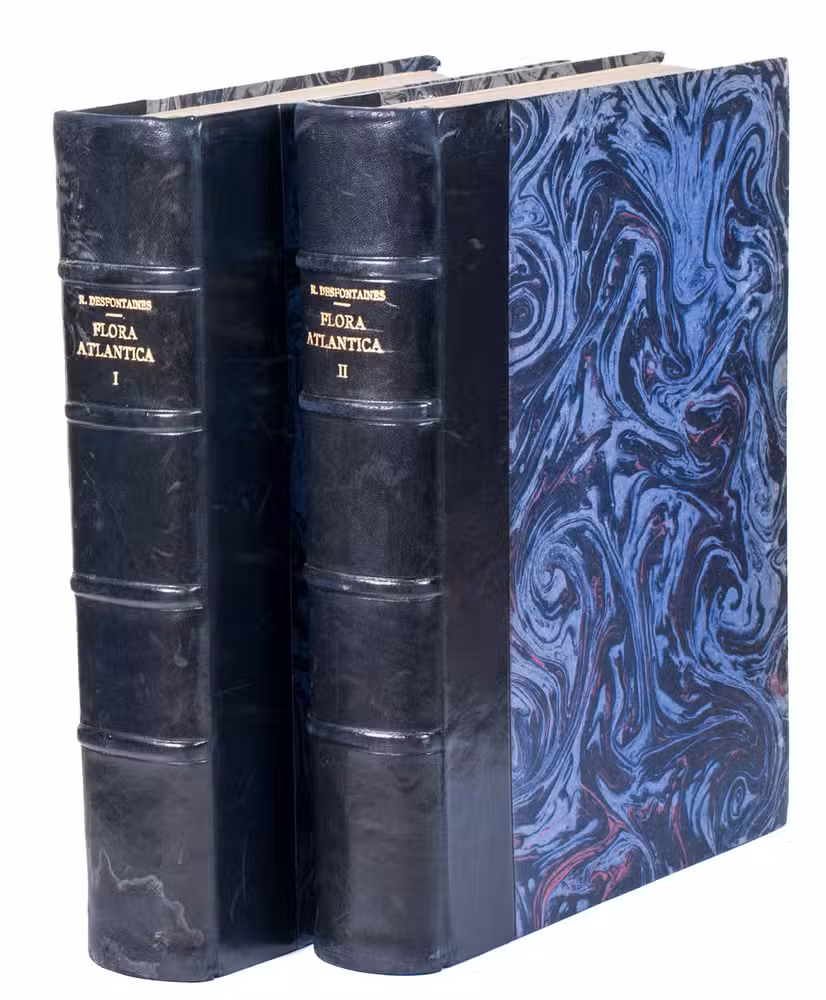 The work was written by French botanist René Louiche Desfontaines (1750-1833), who was one of the first to make the important distinction between monocotyledonous and dicotyledonous plants. He collected all the genera described in the work during a two-year research expedition to Algeria and Tunisia (1783-1785). The first volume of the work describes the 1520 different plant species and genera he found and divides them into 24 classes, according to Linnaean taxonomy. The second volume contains 263 beautifully engraved plates of many of the described plants. The work was originally issued in 9 parts between April 1798 and August 1799. The present copy contains all parts, including all the plates.