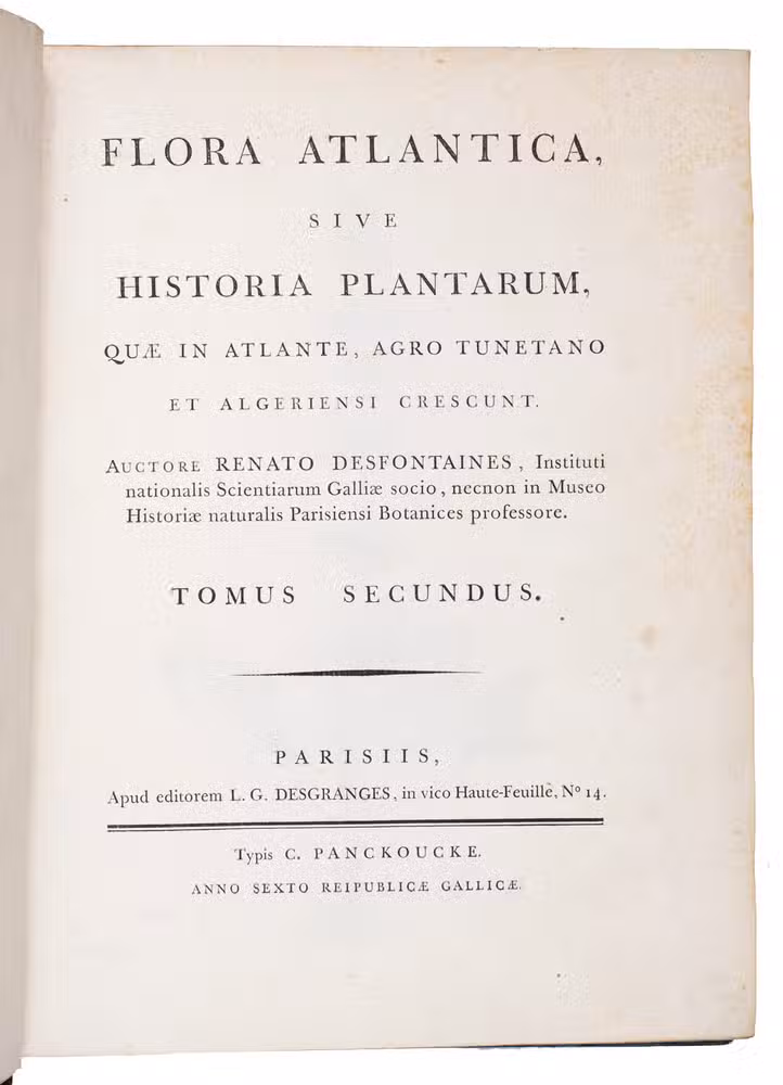Desfontaines studied medicine in Paris, but became interested in botany after attending lectures by Louis Guillaume Lemonnier (1717-1799), professor of botany at the Jardin des Plantes. Desfontaines was a talented scholar and was elected as a member to the Académie des Sciences in 1783. After his return from North-Africa in 1785, he replaced Lemonnier as botany professor. Desfontaines established a herbarium with 1480 plant specimens that he had collected during his research expedition, which he left to the city of Paris after his death. Flora Atlantica is considered his most important work.