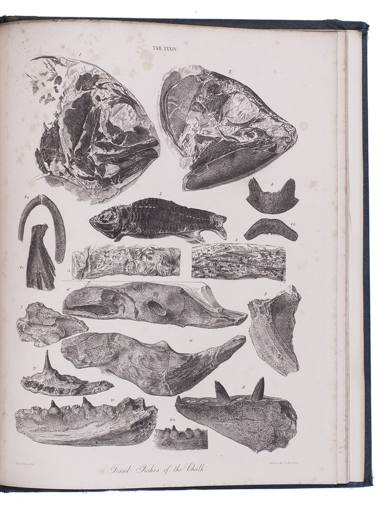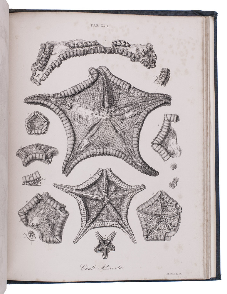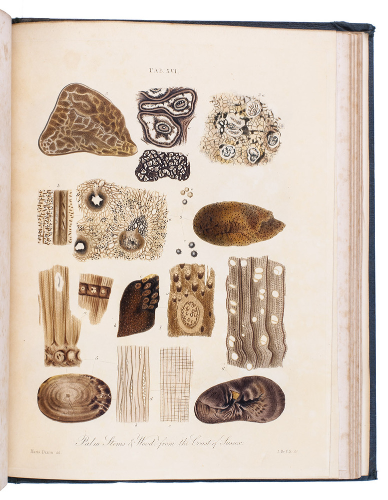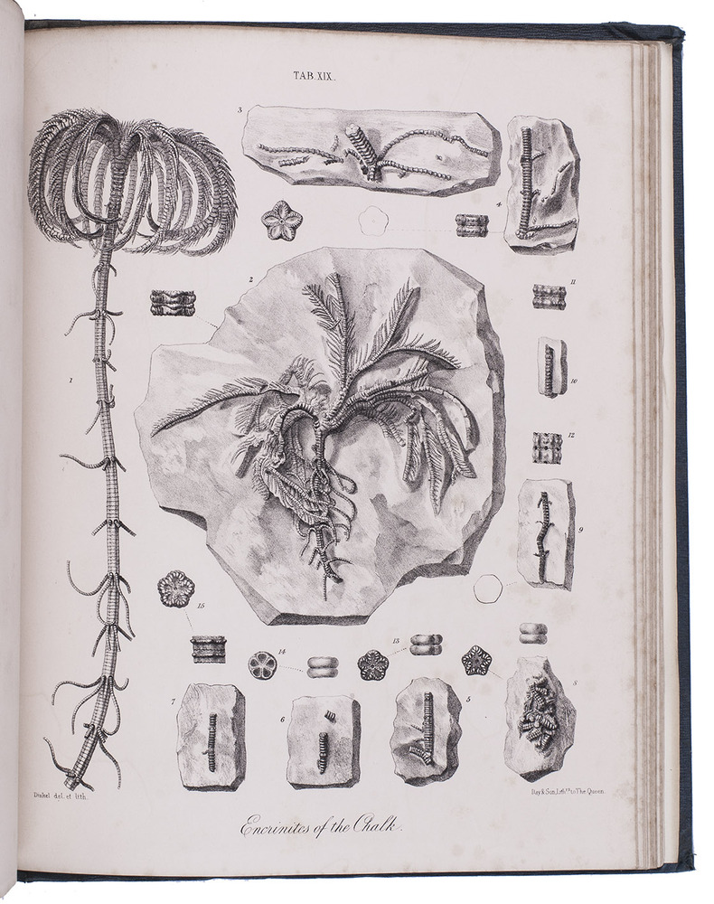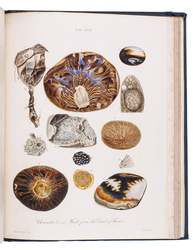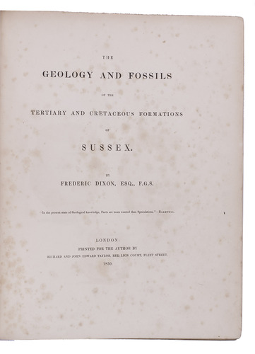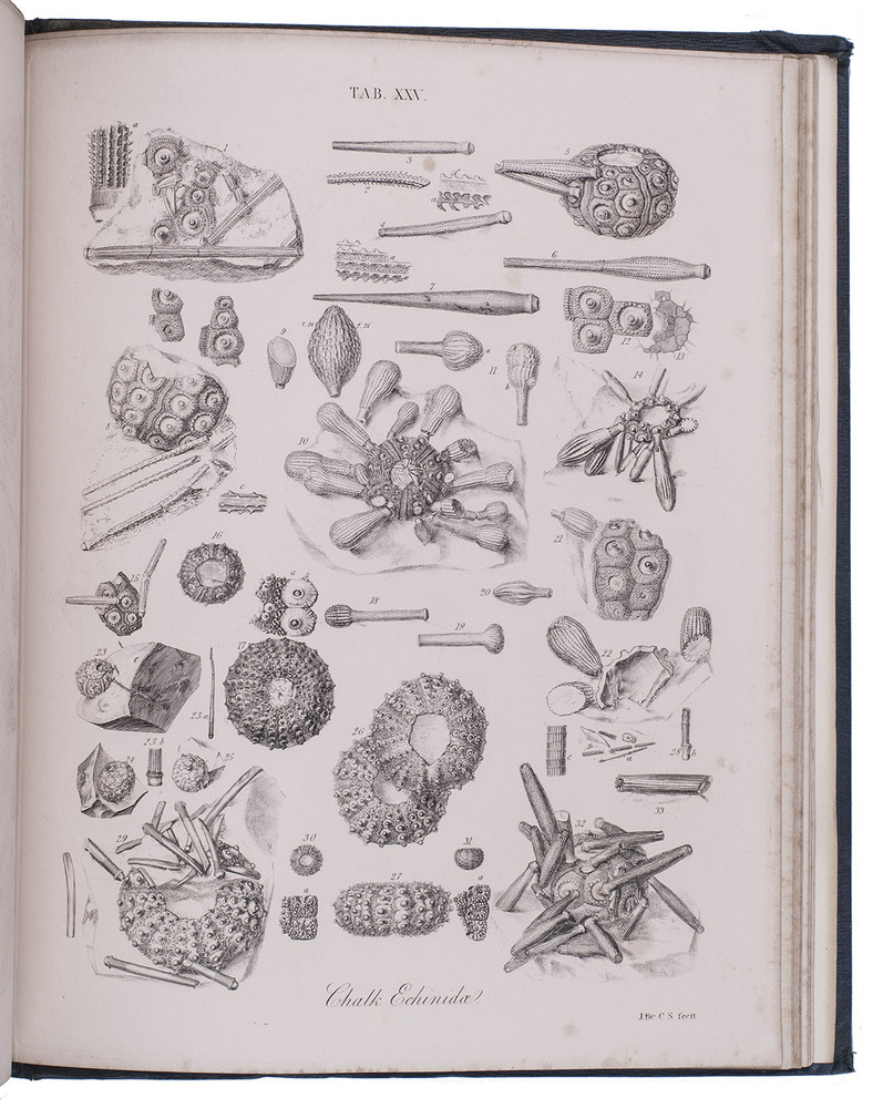 First edition of a richly illustrated geological and palaeontological description of Sussex, England, during the Triassic and Cretaceous period, by Frederick Dixon. The work was published posthumously and edited by the British biologist and palaeontologist Richard Owen (1804-1892). The text is divided into three parts, the last part being a catalogue of numerous animal and vegetable fossils excavated in different areas. The first part describes the formations in Selsey, Bracklesham Bay, Bognor, Worthing and the Sussex coast. The second part compares the chalk formations in Sussex to those in Europe. Each plate depicts between 4 and 30 fossils.