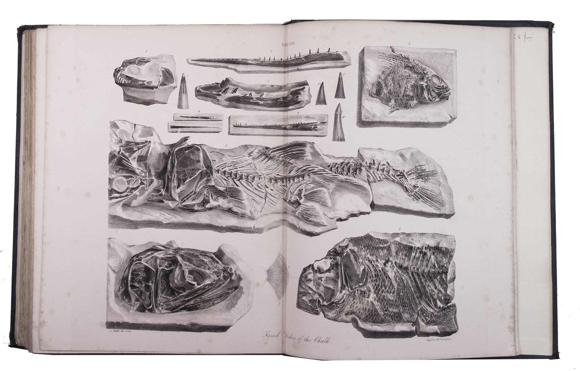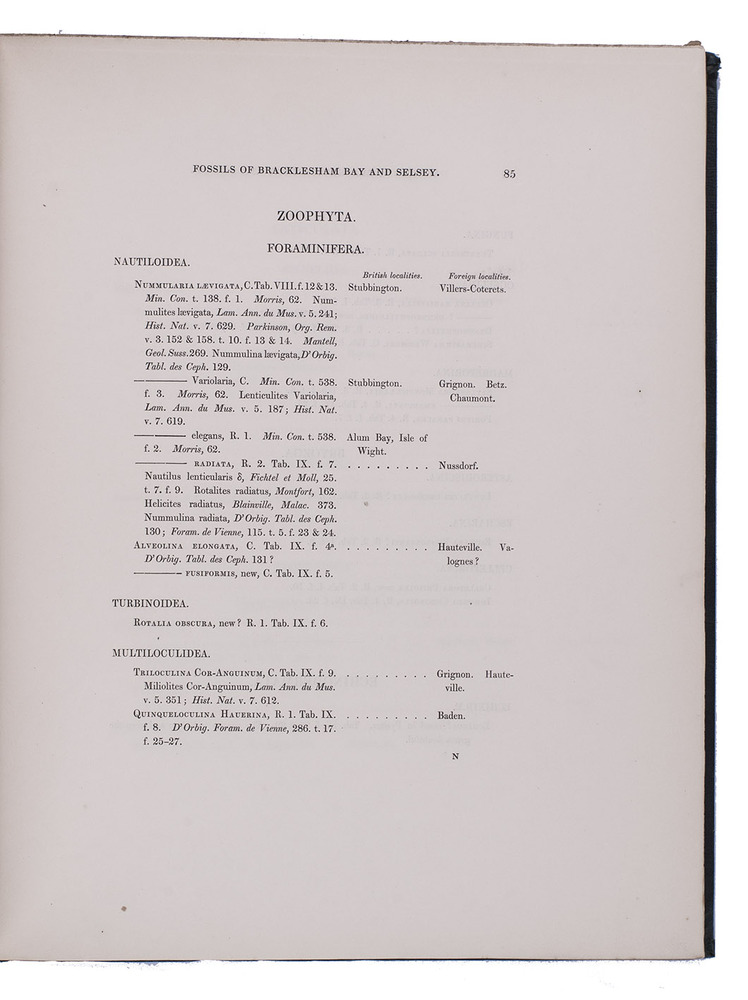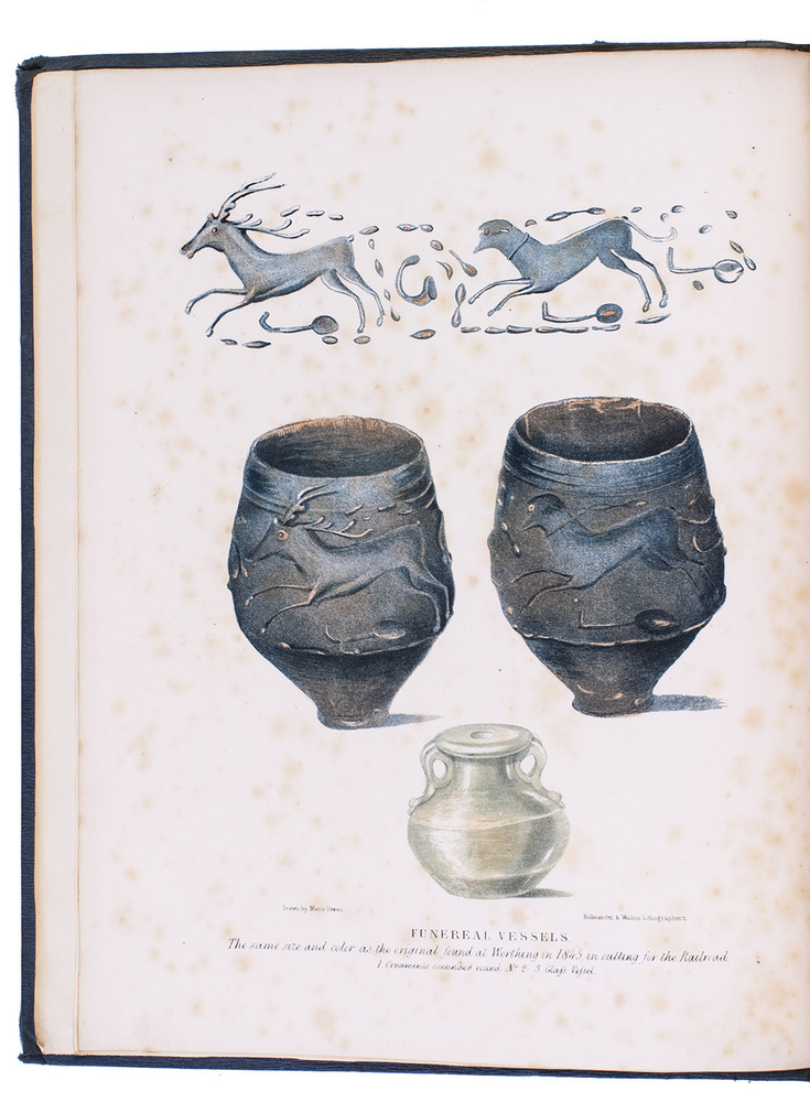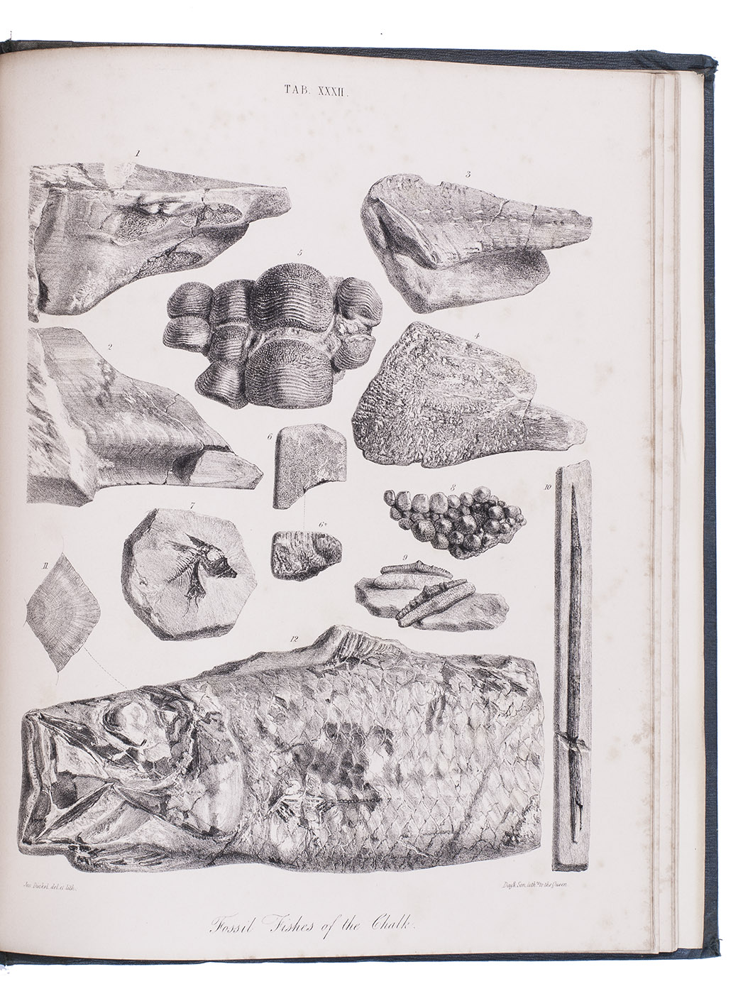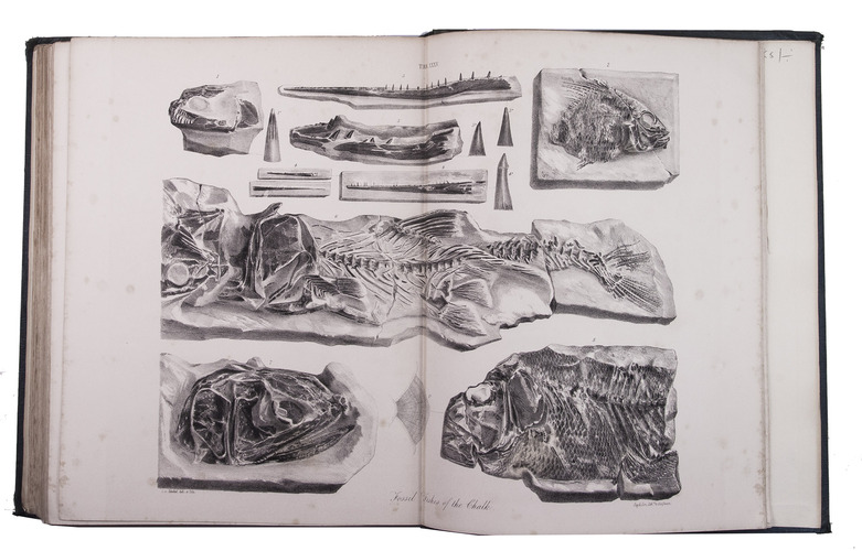 First edition of a richly illustrated geological and palaeontological description of Sussex, England, during the Triassic and Cretaceous period, by Frederick Dixon. The work was published posthumously and edited by the British biologist and palaeontologist Richard Owen (1804-1892). The text is divided into three parts, the last part being a catalogue of numerous animal and vegetable fossils excavated in different areas. The first part describes the formations in Selsey, Bracklesham Bay, Bognor, Worthing and the Sussex coast. The second part compares the chalk formations in Sussex to those in Europe. Each plate depicts between 4 and 30 fossils.