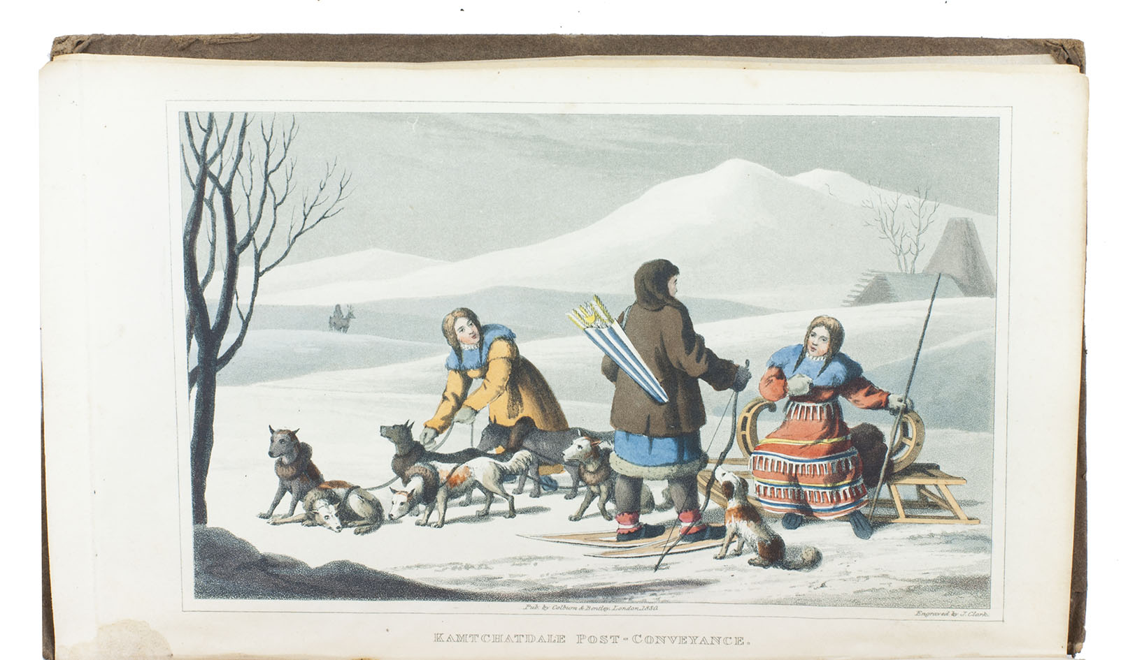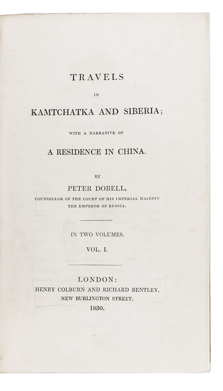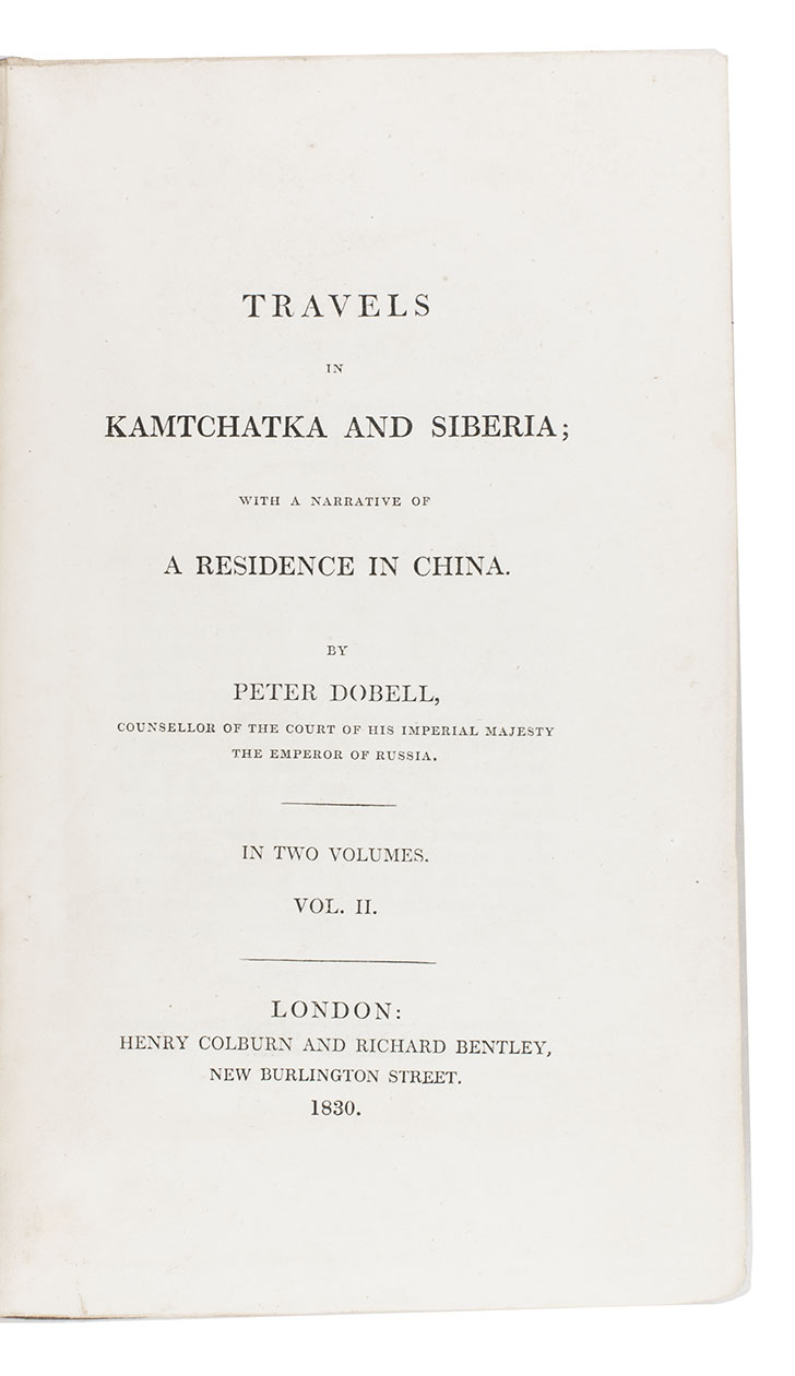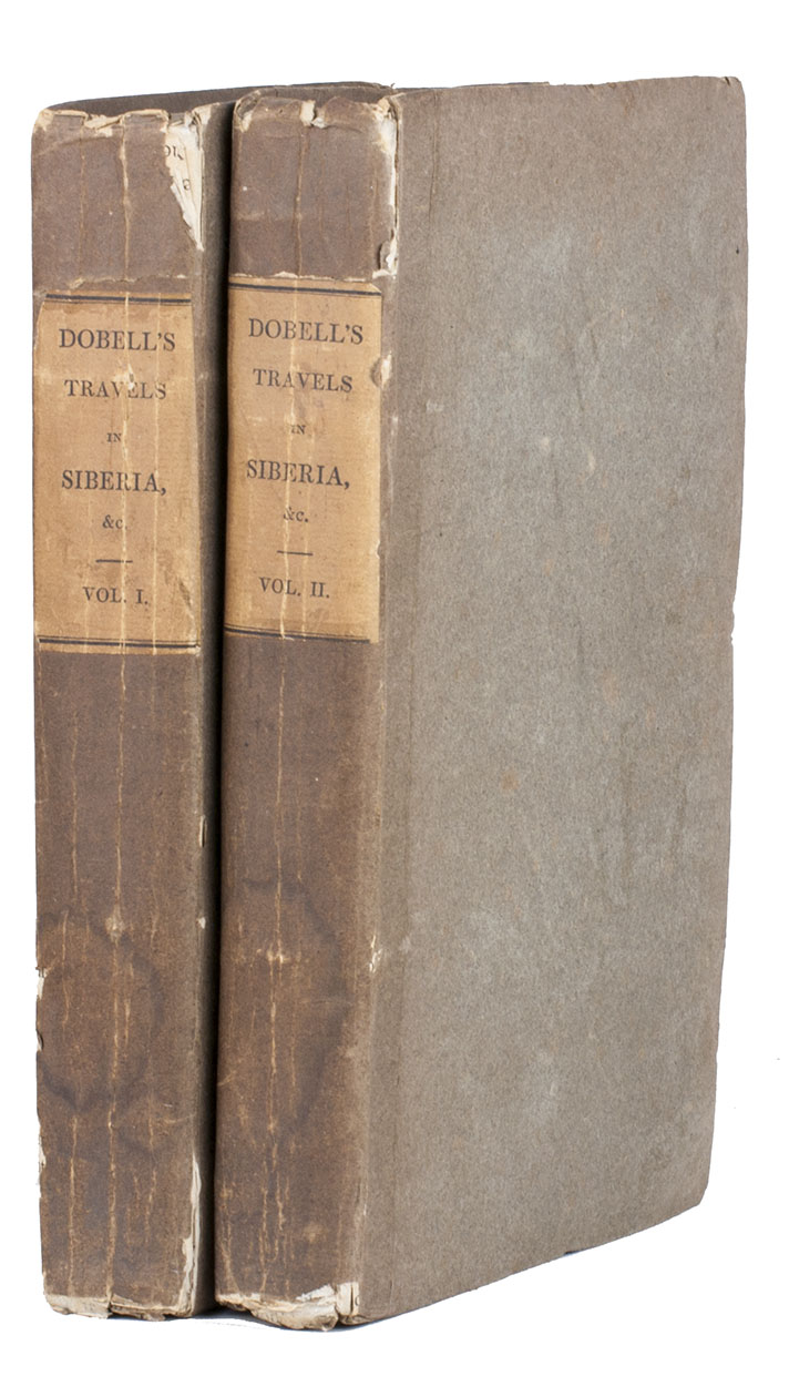 First edition of a travel account by the Irish-born adventurer in Russian service, Peter Dobell (1772-1852). "Dobell arrived in Kamtchatka by sea in 1812, ... This journal records his personal observations of the manners, customs, population, religion, and resources during his fifteen years of traveling in China and Siberia. Much of his time, approximately seven years, he operated as a trader based in China; the second half of volume two describes his experiences and residence there (which had begun in 1798). Dobell indicates that his observations concentrate on the "wonderful works of nature" in order that the reader may learn "how rich and interesting a region is Siberia, heretofore only represented to the imagination in the most gloomy and unattractive colors". The two excellent frontispieces illustrate this Siberian life, French and Russian translations followed this English edition" (Hill).
