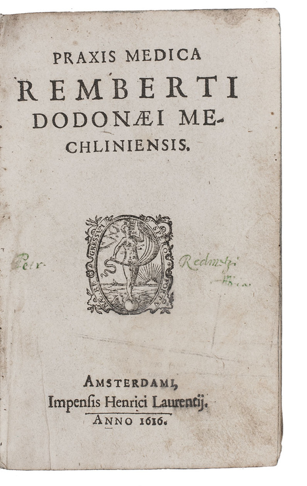 Ad 1: Posthumously published first edition of Rembert Dodoens's 127 Latin lectures on medicine, edited and extensively annotated by Sebastian Egbertsz. de Vrij. Dodoens (1517-1585), the greatest botanist of his age, was appointed professor of medicine at Leiden University in 1582 and delivered the present lectures in 1583 and 1584. He never published them, but they were prepared for publication by his student Sebastian Egbertsz. de Vrij. Much of the material is, of course, of botanical and pharmacological as well as medical interest.