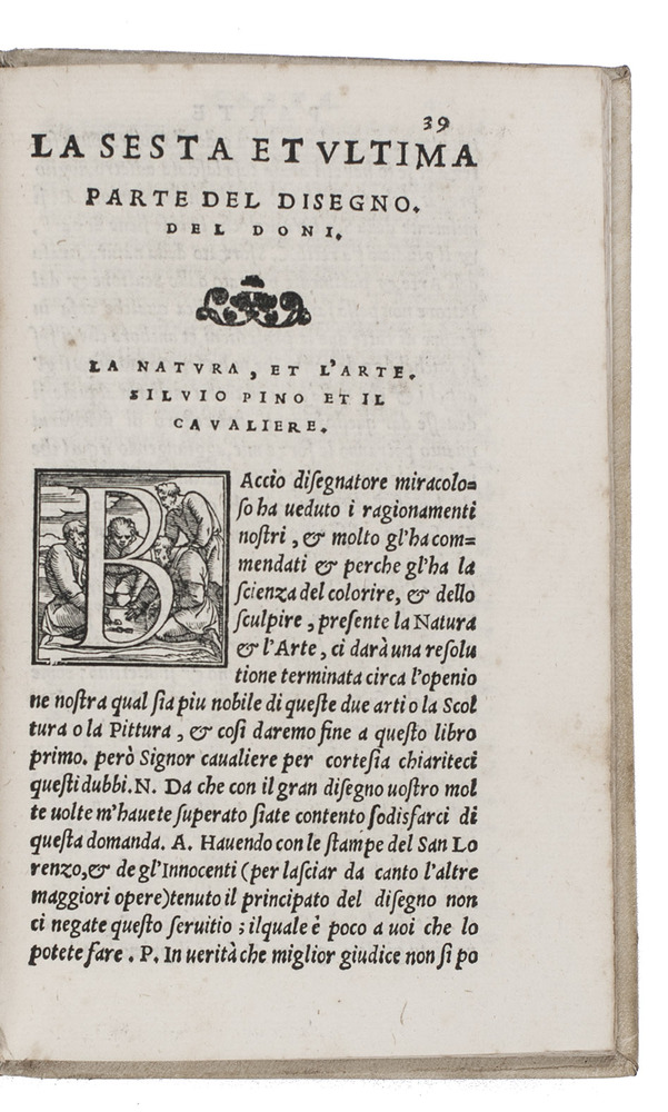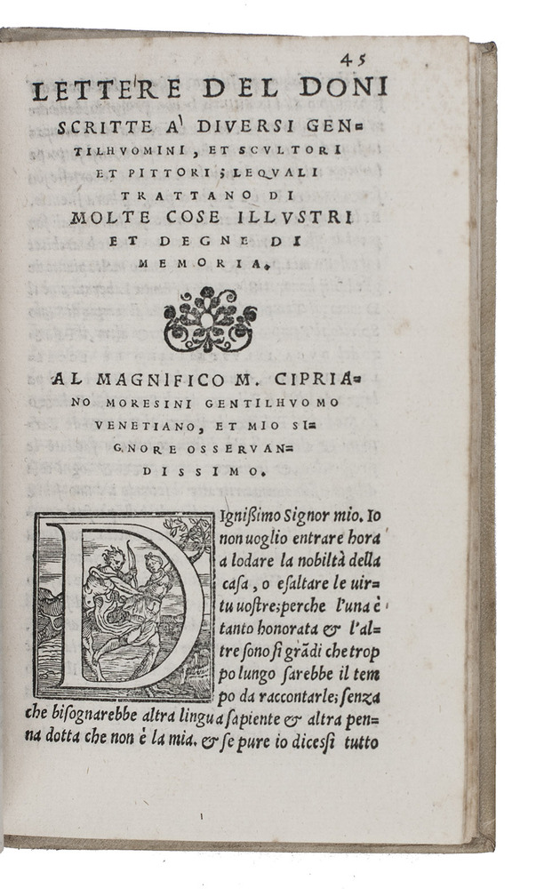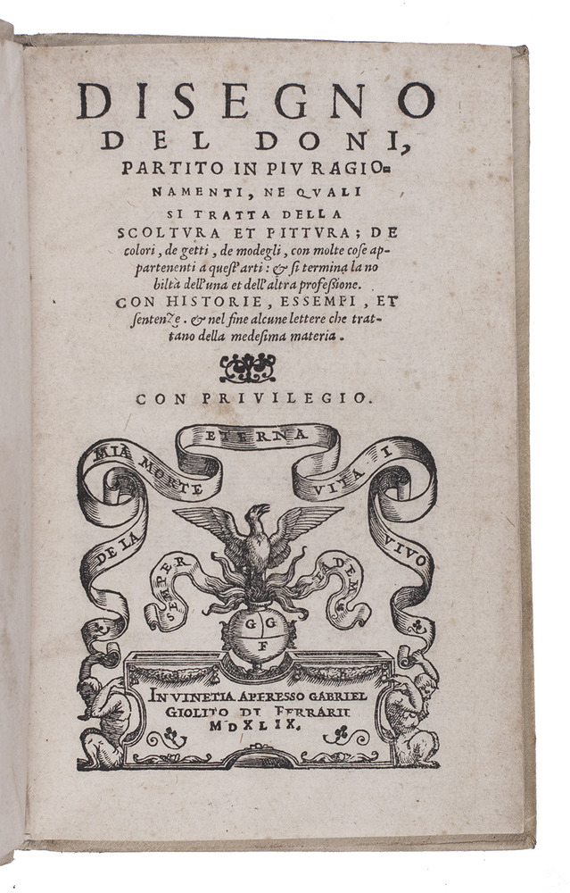 First and only edition of six Italian essays on painting and sculpture by the many-sided Italian writer Anton Francesco Doni. Before the essays he gives a list of the painters and sculptors he discusses in the book and after them the texts of his letters to Italian painters, sculptors and other notable persons. The extensive index that concludes the work includes the various subjects discussed. The first five essays concern the principles and practices of sculpture and painting as art, also discussing details of techniques and materials, such as the manner of achieving the brightest colours in the mixing of oil paints. But the sixth gives advice on dealing with patronage, though also discussing the relation between sculpture and painting and the proportions of the human head. It has been suggested that this last essay may have been written by Doni's friend Baccio Bandinelli (1493-1560).