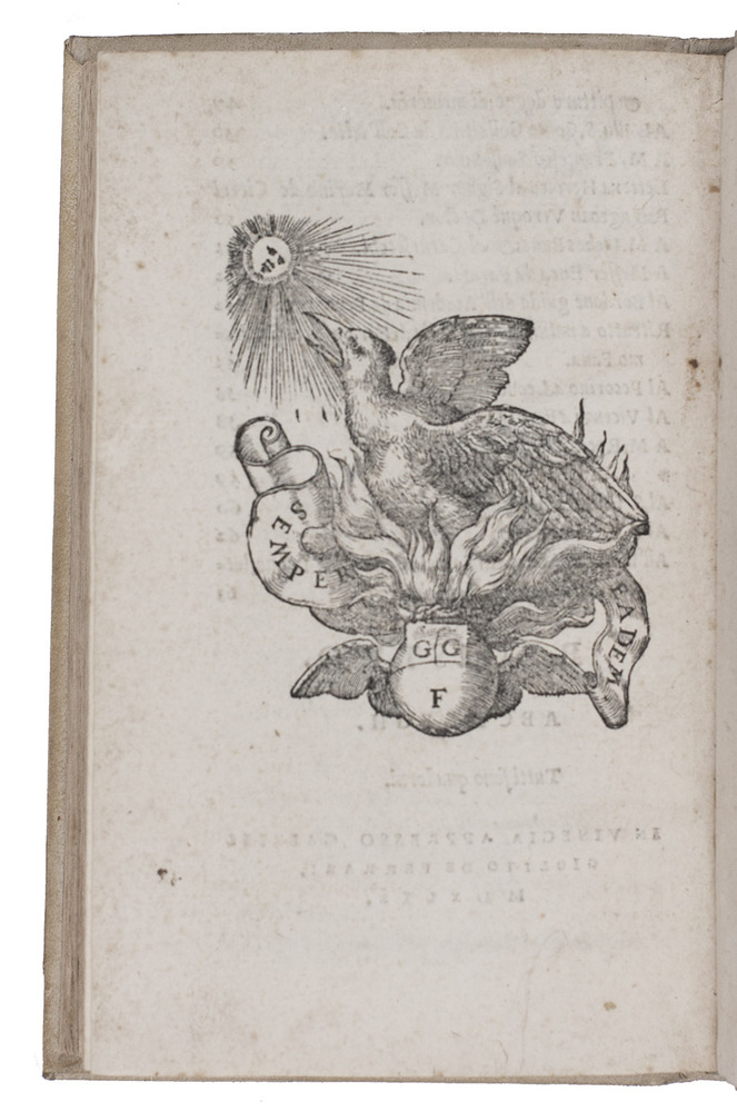 Venice, Gabriele Giolito de Ferrari, (colophon: February) 1549. Small 8vo (16 x 10 cm). With the imprint in the base of an elaborate woodcut on the title page, with Ferrari's motto, initials and phoenix device, a different woodcut phoenix device on last page, and 21 woodcut pictorial initials (3 series) plus 1 repeat. Italian sheepskin parchment (ca. 1700?). 63, [1] ll.