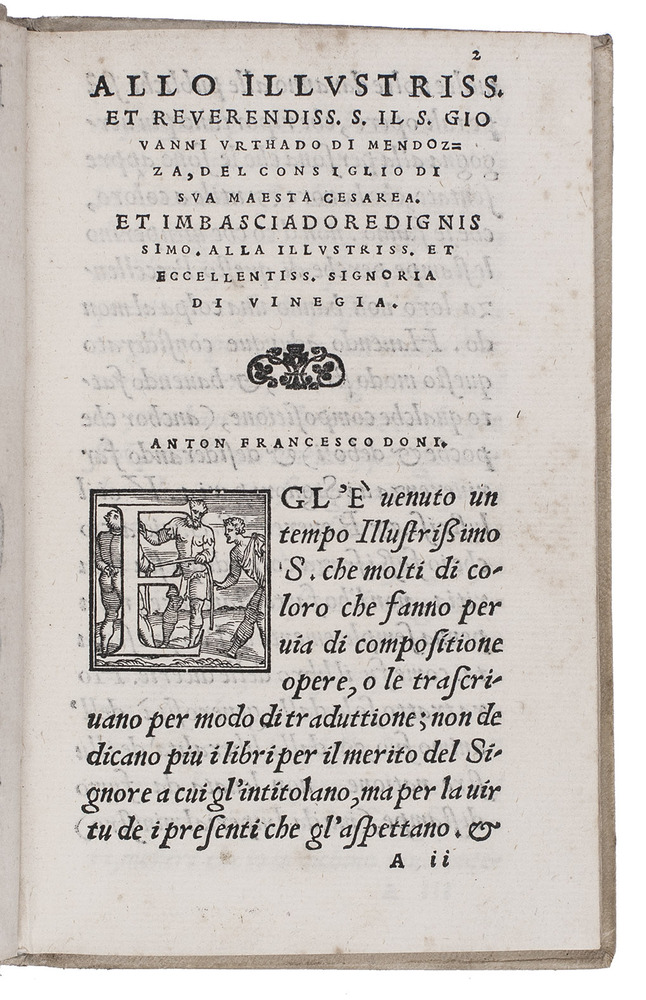 Book and binding in very good condition, with only some minor and mostly marginal spotting. First and only edition of a 1549 Italian series of essays on sculpture and painting, mixing theory with practical information on techniques and materials. Adams D814; Besterman, Old art books (1975), p. 31; BMC STC Italian, p. 225; ICCU CNCE 17679; Landau-Parshall (1994), p. 293; Ricottini Marsili-Libelli, Anton Francesco Doni ... bibliografia (1960), 19; USTC 827607.