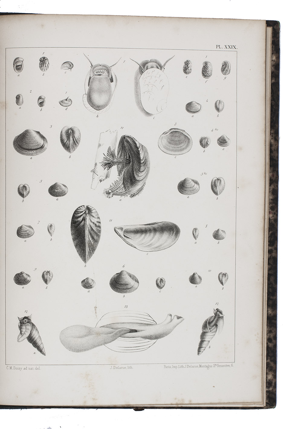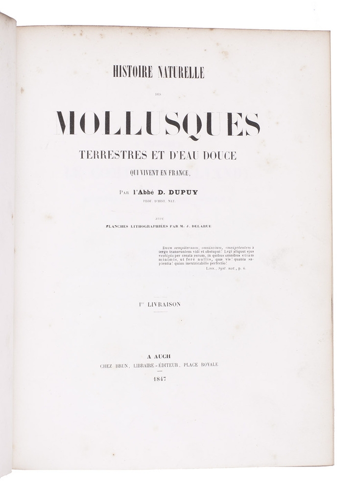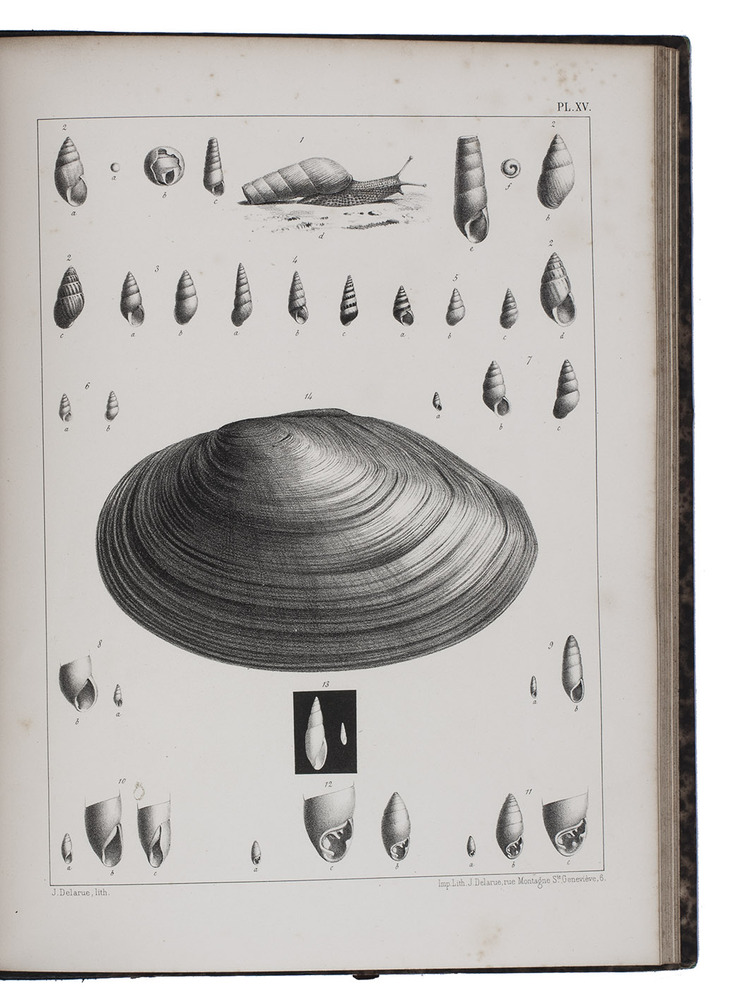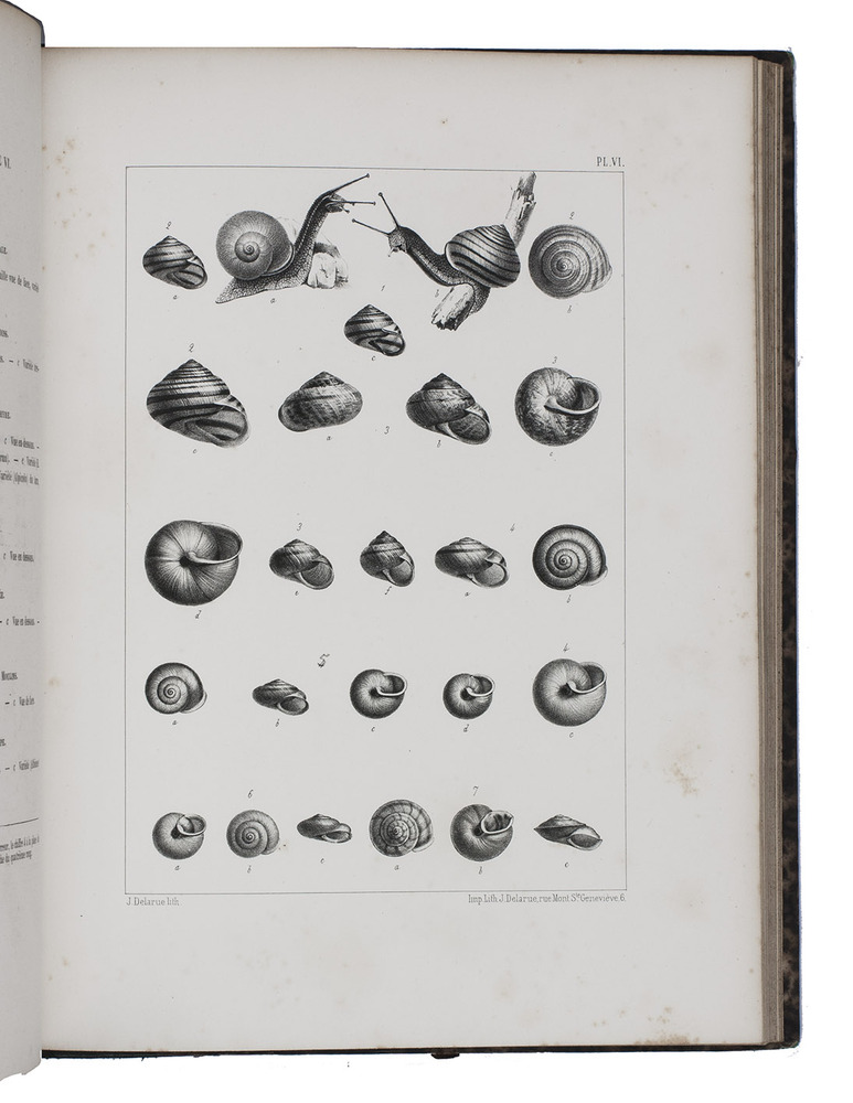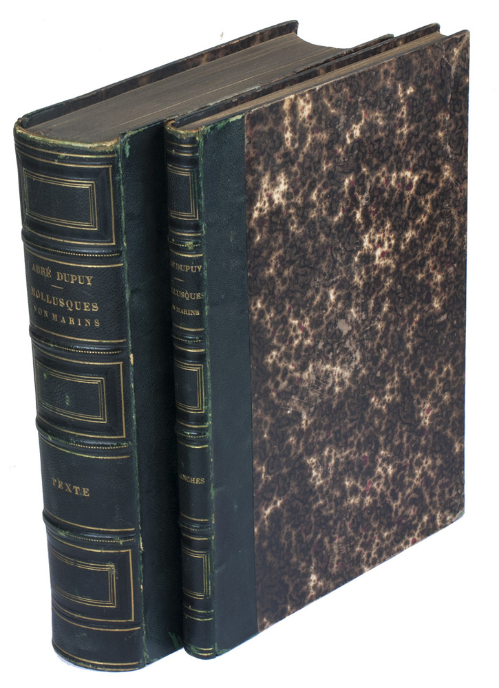 First edition of an extensive monograph on French land and fresh-water molluscs, by the French botanist and malacologist abbot Dominique Dupuy (1812-1885). The text volume contains descriptions of many different species of land and water snails, slugs, and fresh water mussels, describing both the animal and the shell and its habitat. The text volume closes with a bibliography and an index. The second volume contains all the lithographed plates, each depicting multiple snails and shells and each accompanied by a brief explanatory page.