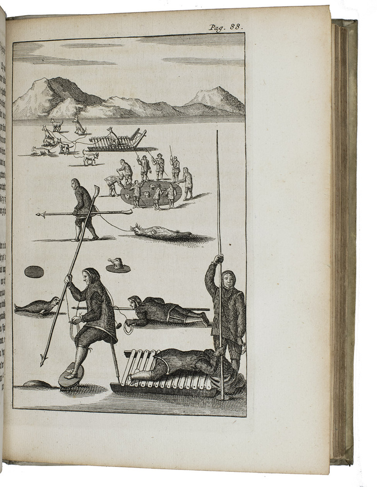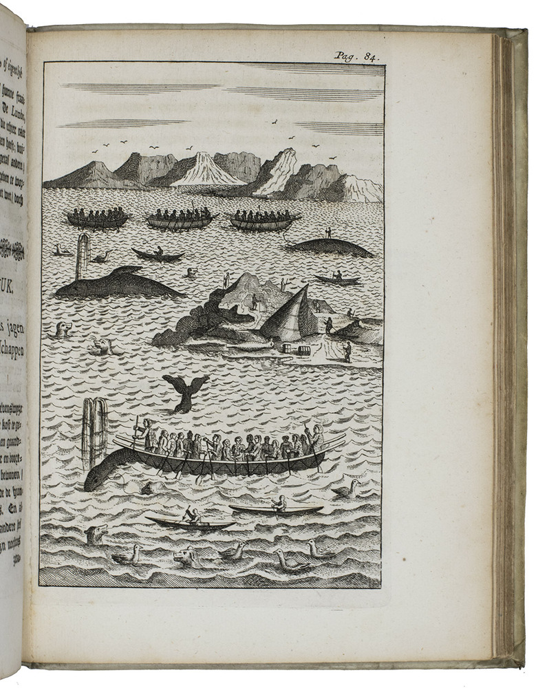 Delft, Reinier Boitet, 1746. 4to. With an engraved folding map of Greenland (printed for this edition by Boitet) and 10 engraved plates with full-page views of whales and seals, whale fishery and seal hunting, the Inuits and their cultural habits and houses and (in the first plate) flowers. With the title-page printed in red and black and with some woodcut initials and tailpieces. Contemporary vellum, manuscript title on spine. [24], 192 pp.