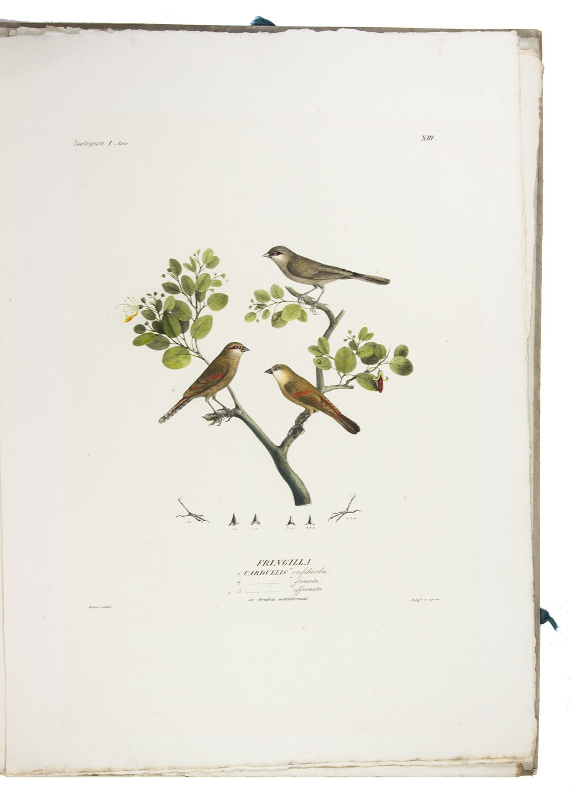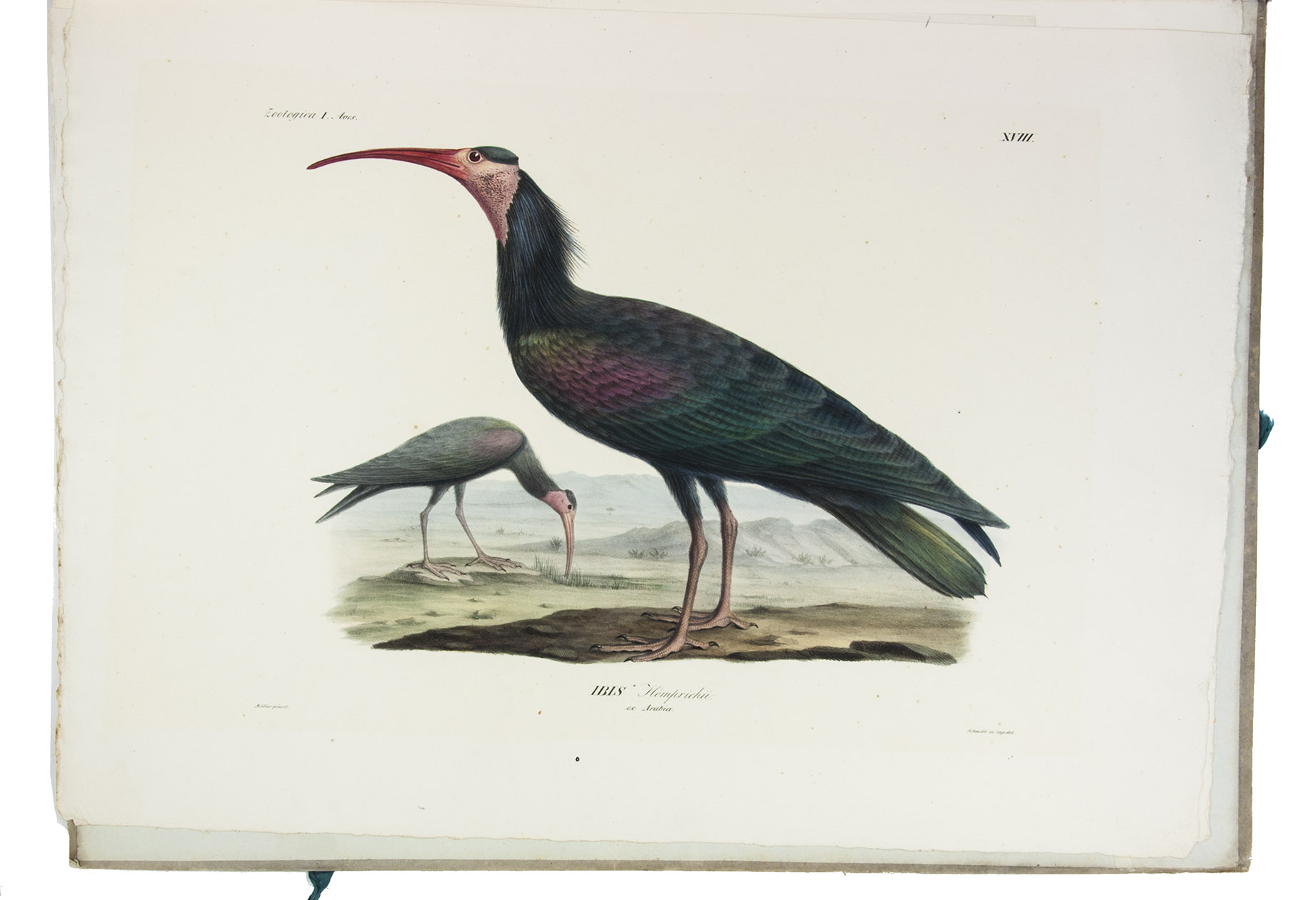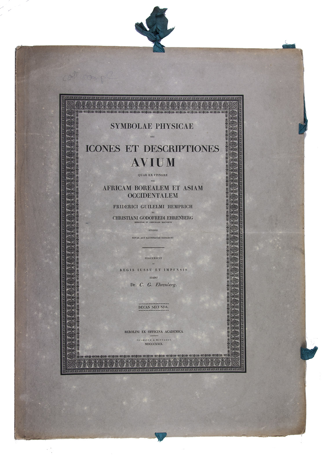 Very rare undistributed second and final part of beautiful bird plates (XI-XX) for the series Symbolae physicae by the German zoologist Christian Gottfried Ehrenberg (1795-1876). The large plates, beautifully coloured by hand, show birds from northern Africa and the Middle East. They are shown perched on branches, many surrounded with detail drawings of bills and feet. They were drawn by Wilhelm Müller and Friedrich Bürde and executed by Bürde, Elsasser, Pohlke and Schmidt.This monumental work on animals, and later also plants, from Africa and the Middle East was published in parts, the original series from 1828 to 1845 covering mammals, birds, insects and other invertebrates, giving 90 plates in total. Additional parts covering other kinds of animals (32 or 34 plates) and plants (24 plates) appeared in 1899 and 1900. The literature describes the present work as unfinished, but the ten additional bird plates were in fact printed, though never distributed.