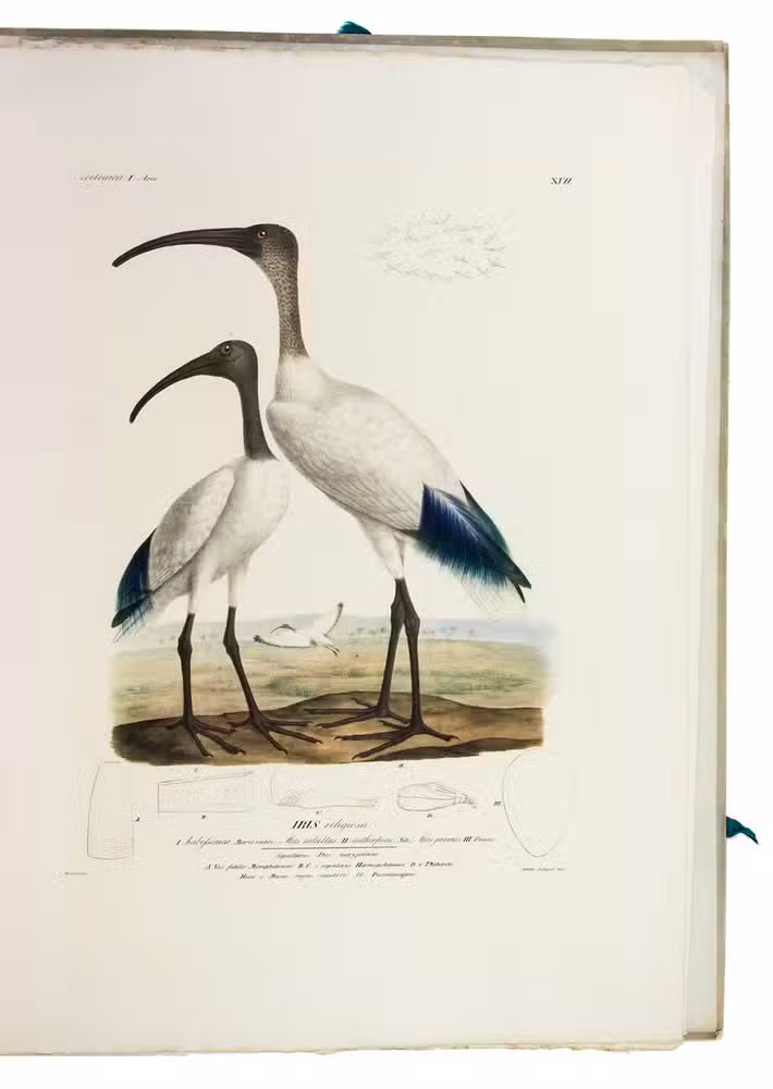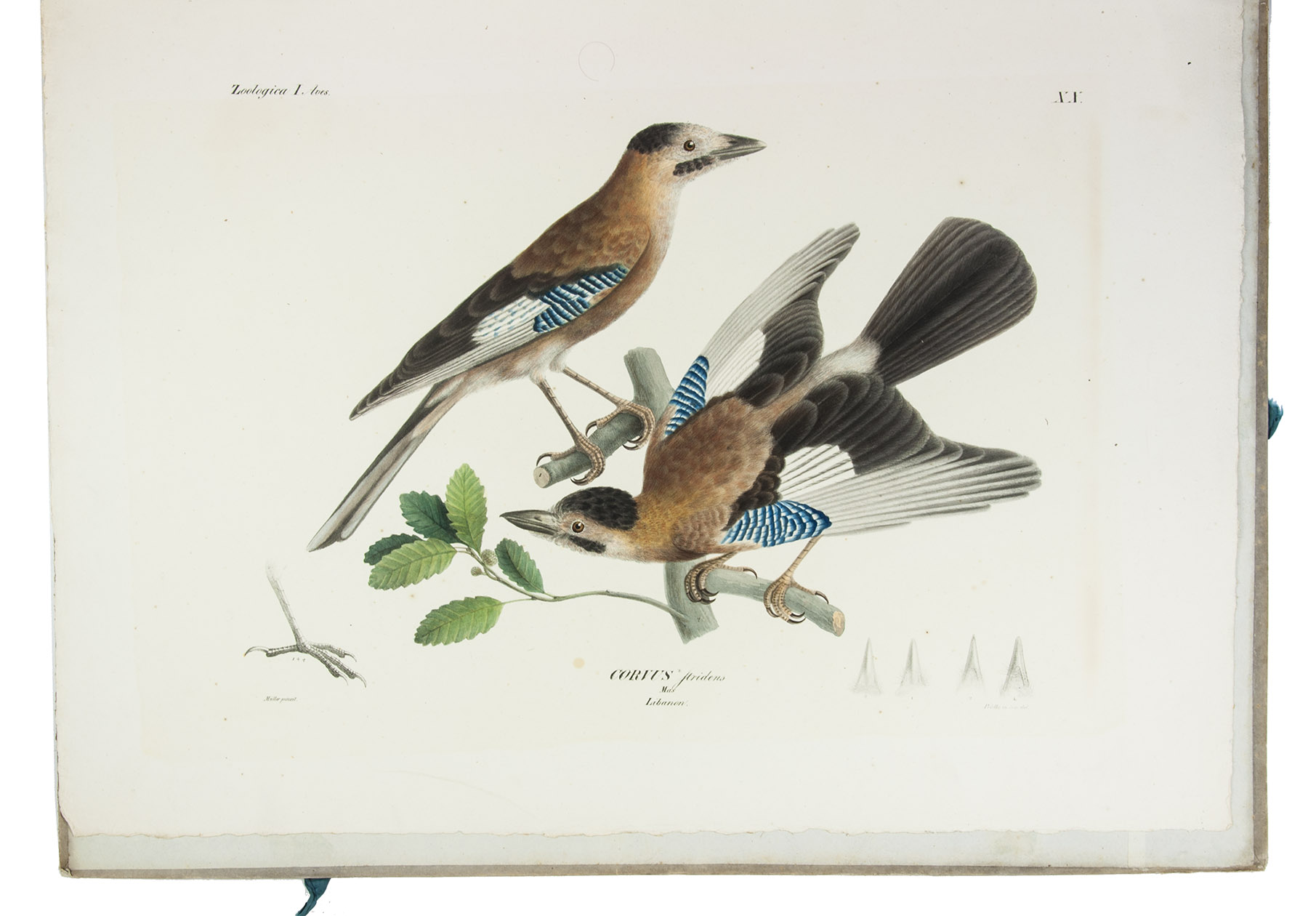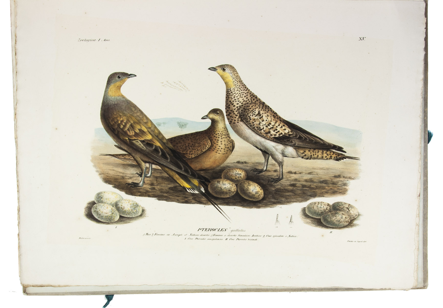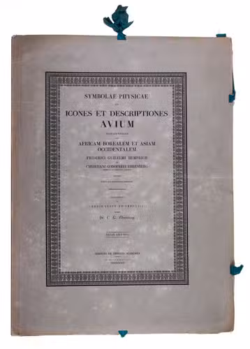 Very rare undistributed second and final part of beautiful bird plates (XI-XX) for the series Symbolae physicae by the German zoologist Christian Gottfried Ehrenberg (1795-1876). The large plates, beautifully coloured by hand, show birds from northern Africa and the Middle East. They are shown perched on branches, many surrounded with detail drawings of bills and feet. They were drawn by Wilhelm Müller and Friedrich Bürde and executed by Bürde, Elsasser, Pohlke and Schmidt.This monumental work on animals, and later also plants, from Africa and the Middle East was published in parts, the original series from 1828 to 1845 covering mammals, birds, insects and other invertebrates, giving 90 plates in total. Additional parts covering other kinds of animals (32 or 34 plates) and plants (24 plates) appeared in 1899 and 1900. The literature describes the present work as unfinished, but the ten additional bird plates were in fact printed, though never distributed.