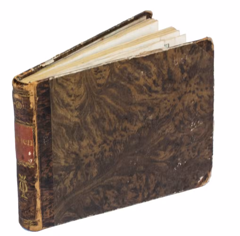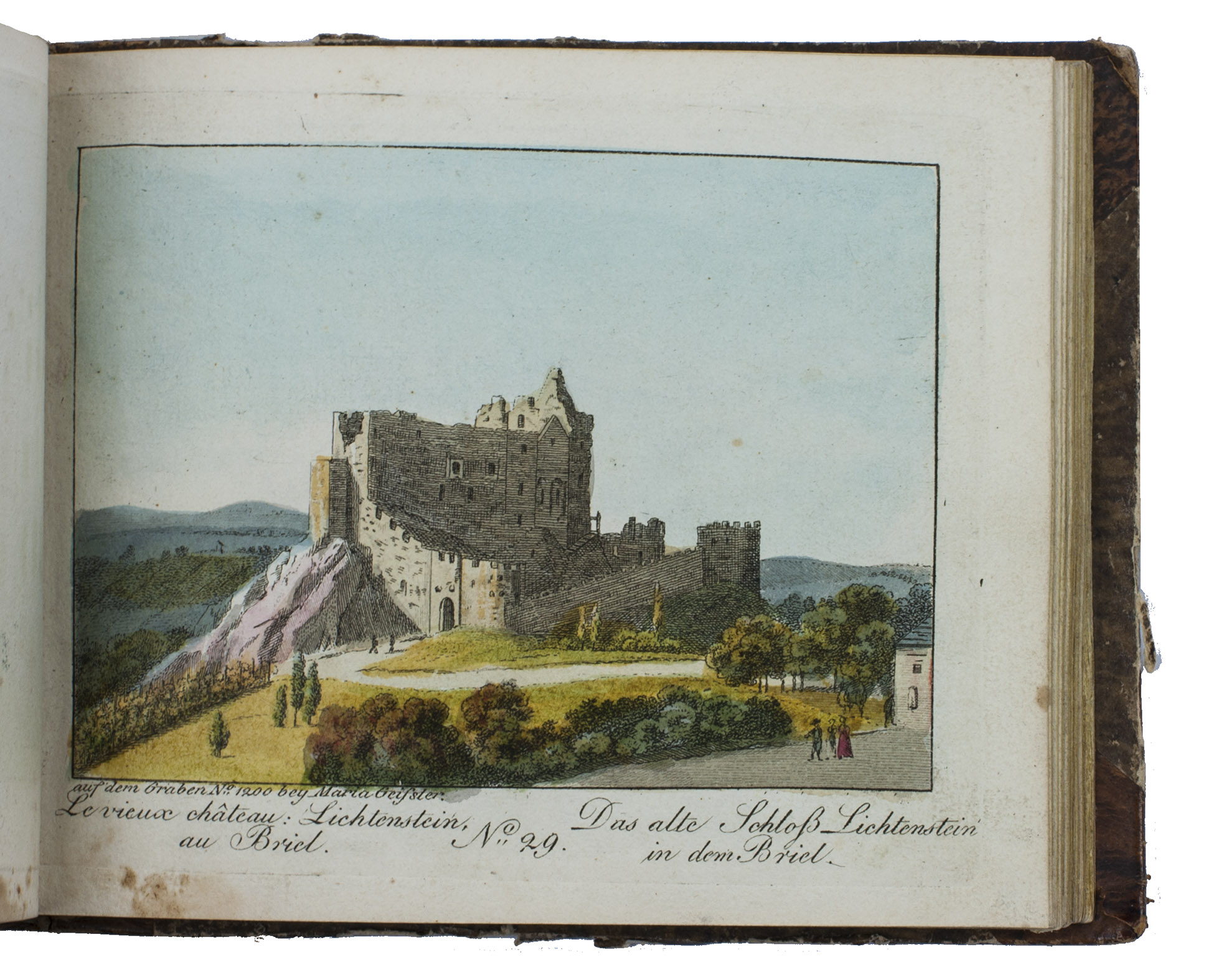 Vienna, Maria Geissler, [1812]. Large oblong 16m? (11 x 13.5 cm). With an engraved title-page and 64 (of a possible 100) engraved plates numbered 1-56, 58-61, and odd numbers 63-73 (including 2 folding plates with 2 numbers each, 21/22 and 23/24). Hand-coloured in watercolour by a contemporary hand. Contemporary half sheepskin, gold-tooled spine. [1], "73" [= 64] engraved ll.