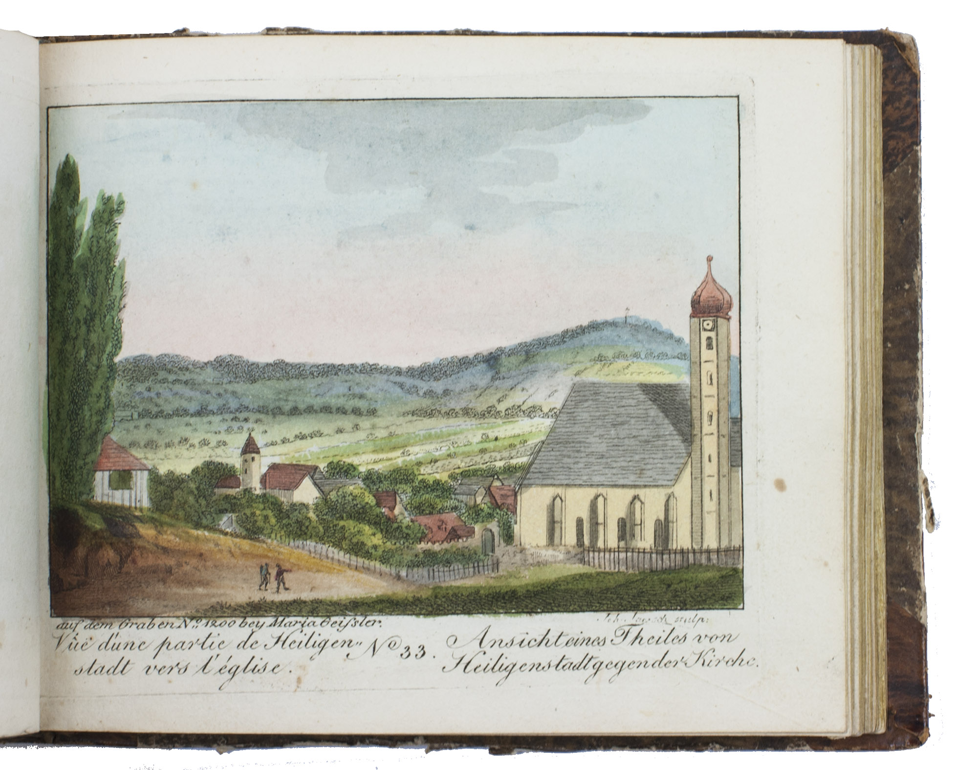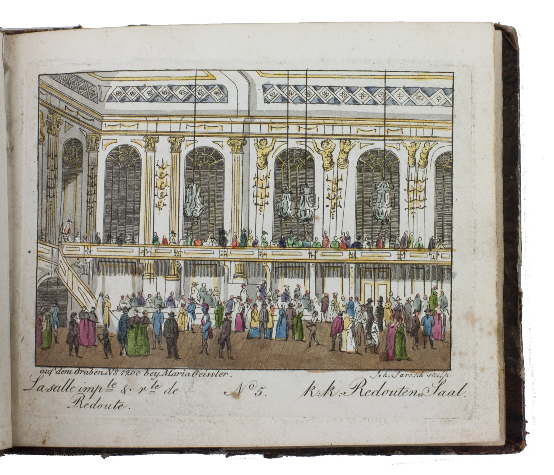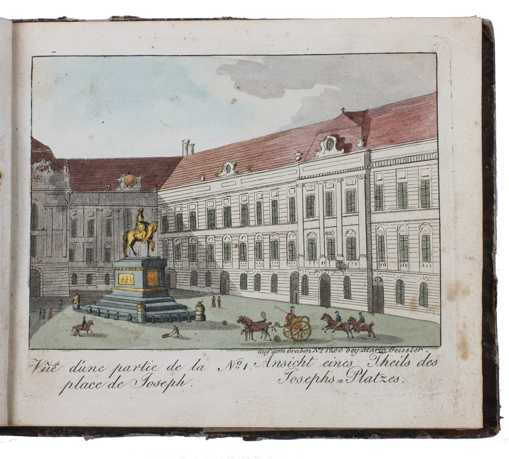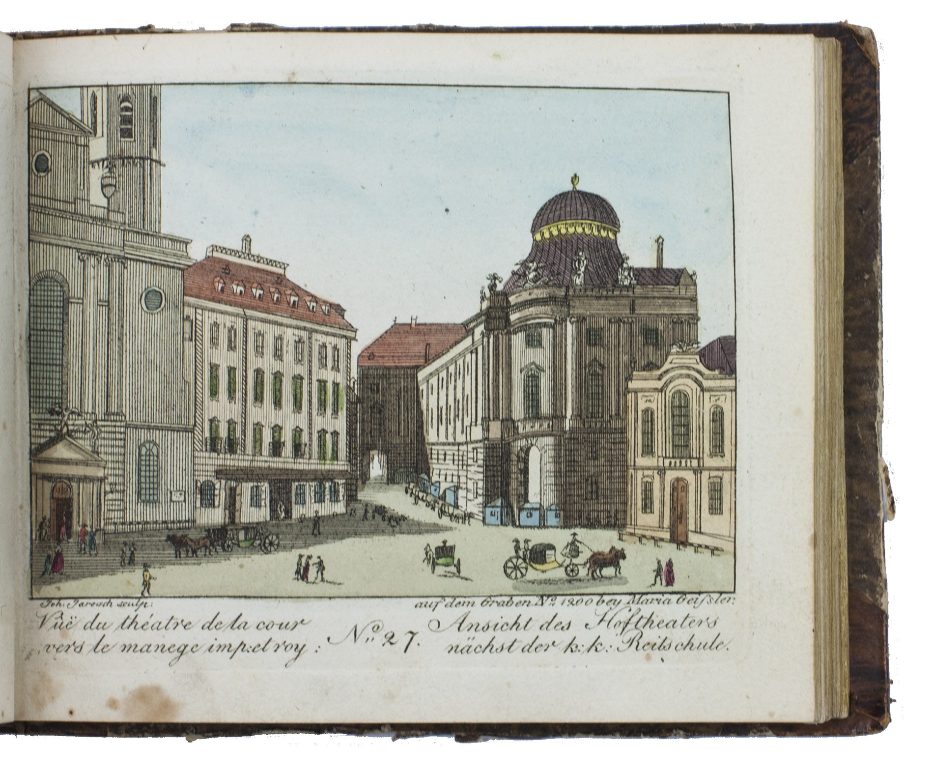 A series of charming views of Vienna and its environs in the middle of Beethoven's thirty-five years there, around the time Wagner was born there, and about eight years after it became the capital of the new Austrian Empire, including views of Baden, Klosterneuburg, Bratislava and other neighbouring sites, all attractively and artistically coloured by a contemporary hand. It shows palaces, castles and ruins, churches, chapels and the Vienna cathedral, gardens and pavilions, city streets and squares, the spa at Baden, Christoph de Bach's Circus Gymnasticus, the lavish Apollo Saal, views along the Danube and more. The famous streets, squares, buildings and interiors appear bustling with fashionable ladies and gentlemen, pedestrians and horse-drawn carriages, and the river full of boats. Four views are signed by the artist, Josef Eisner (1788-1861), and about a third by the engraver, mostly Johann Jaresch (but two by Johann Boehm (ca. 1770-post 1821), probably as engraver). All plates are captioned in French and German, and numbered in the centre.